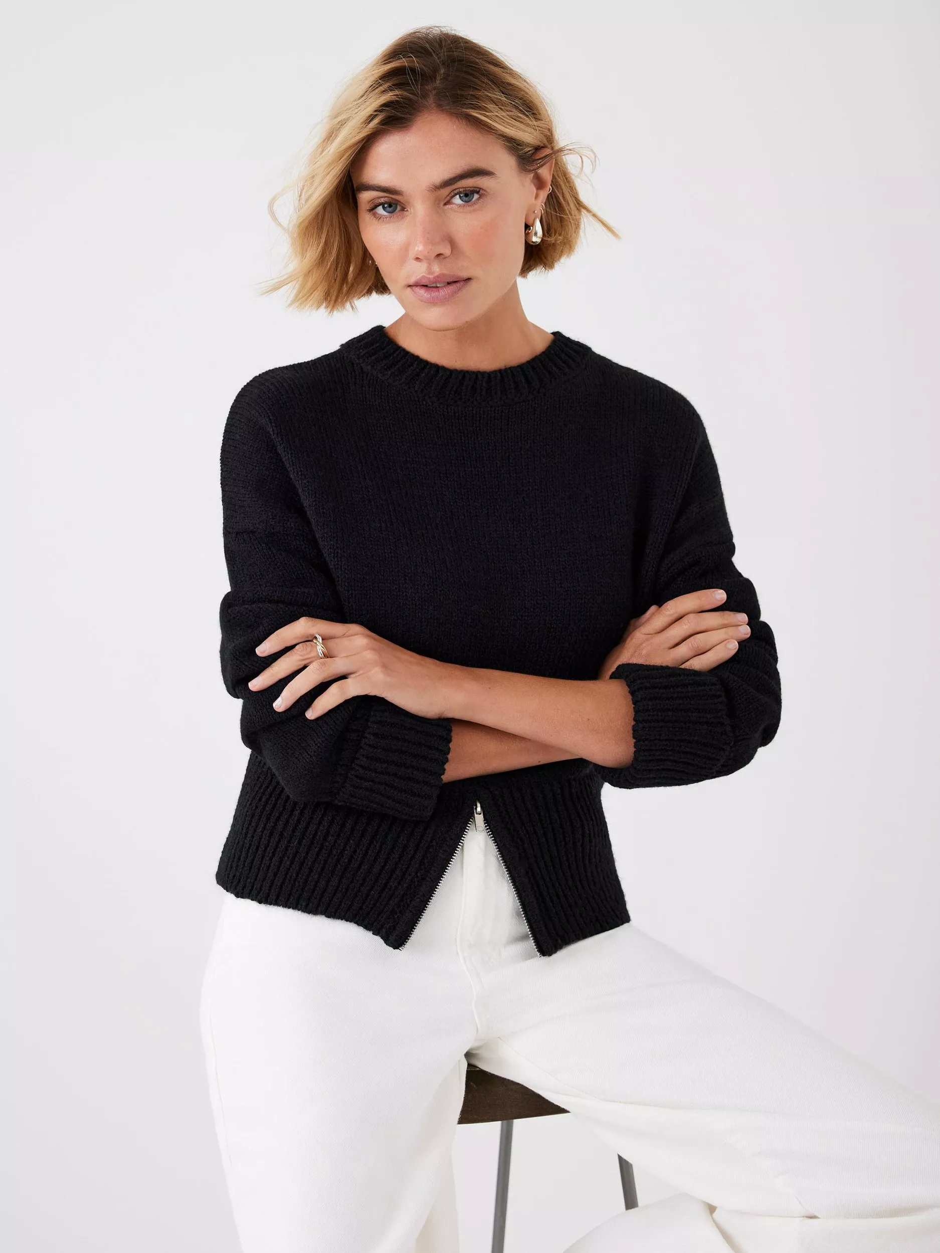 Black knit jumper featuring a crew neckline, long sleeves, wide hemline with a zip detail through the front.