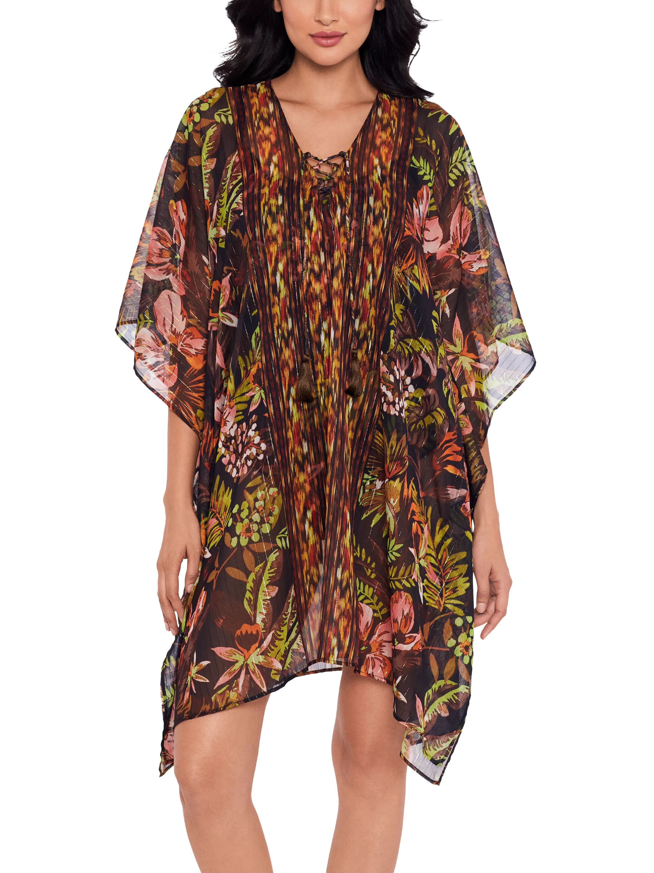 Semi-sheer kaftan with shimmery metallic threads, v-neckline and lace-up tassels.