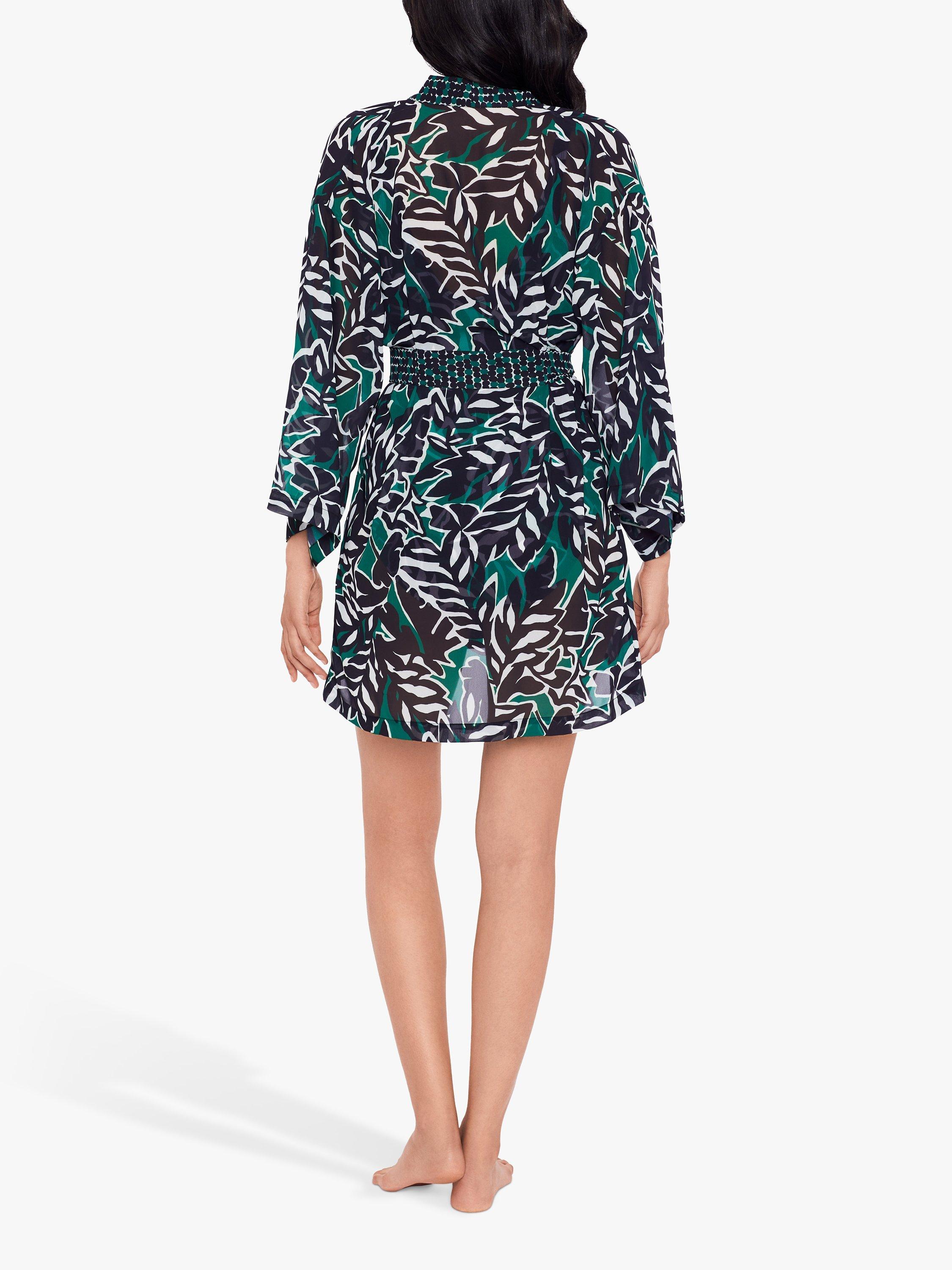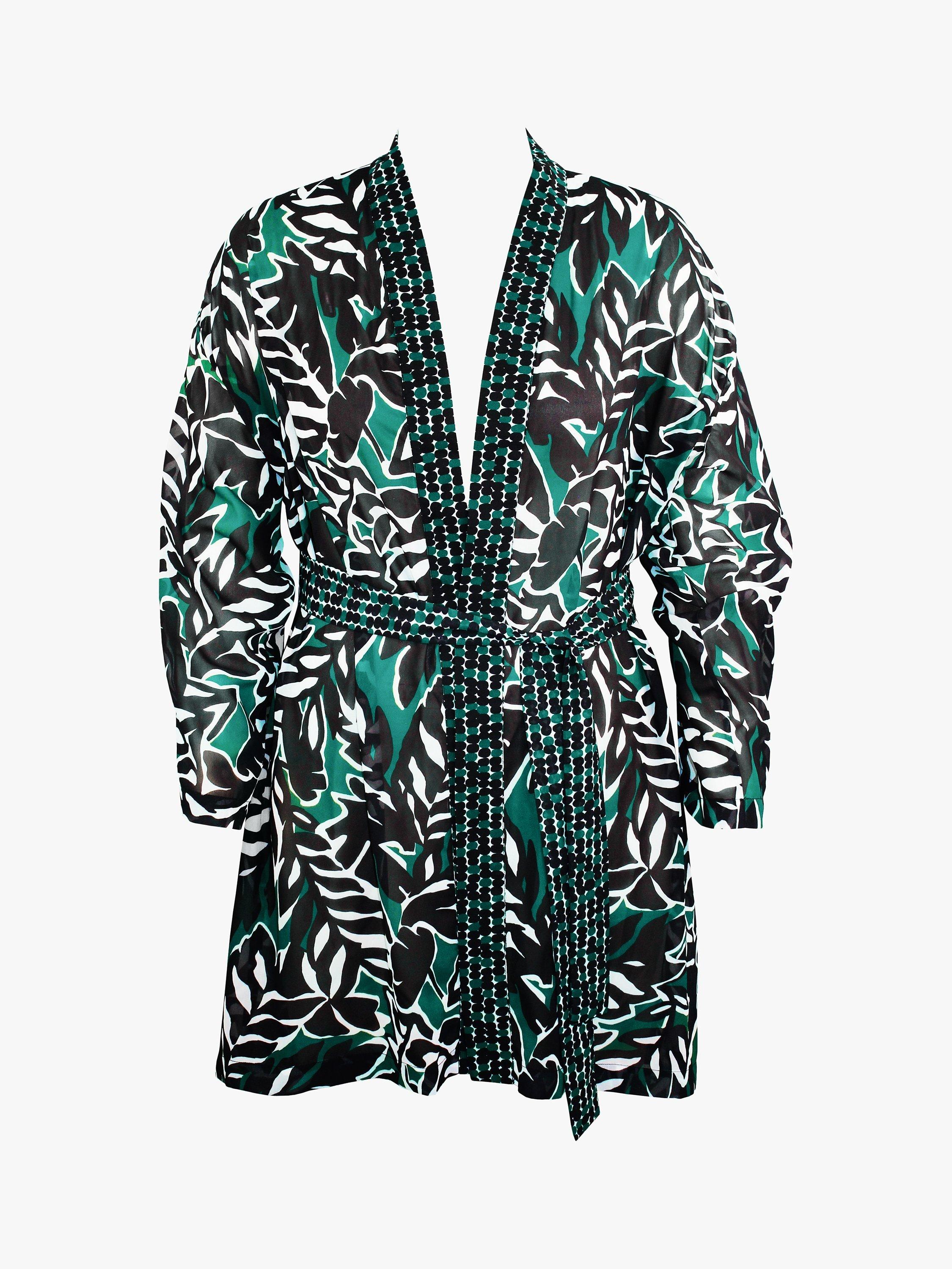 Channel your inner poolside goddess with this semi-sheer Georgette Kimono-styled cover-up. Designed with all-over palm print, it is an eye-catching style complete with a fixed belt tie that cinches the waist.