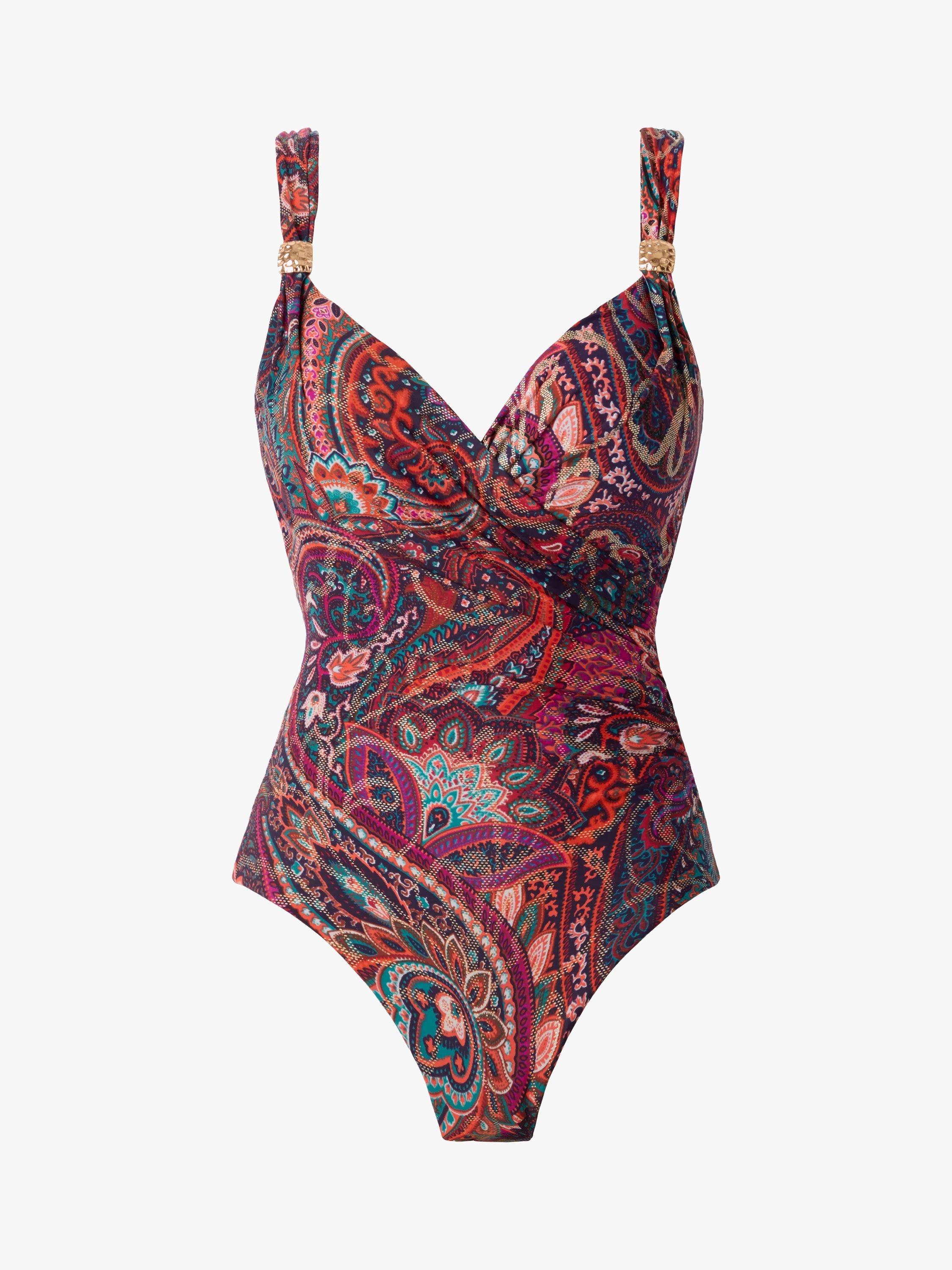 Crafted with Miratex fabric, this swimsuit provides allover body control, shaping, and slimming for a confidence-boosting silhouette. The cleverly draped fabric conceals the tummy, ensuring a flawless and flattering appearance and beautiful hammered gold-coloured hardware adds a touch of allure.