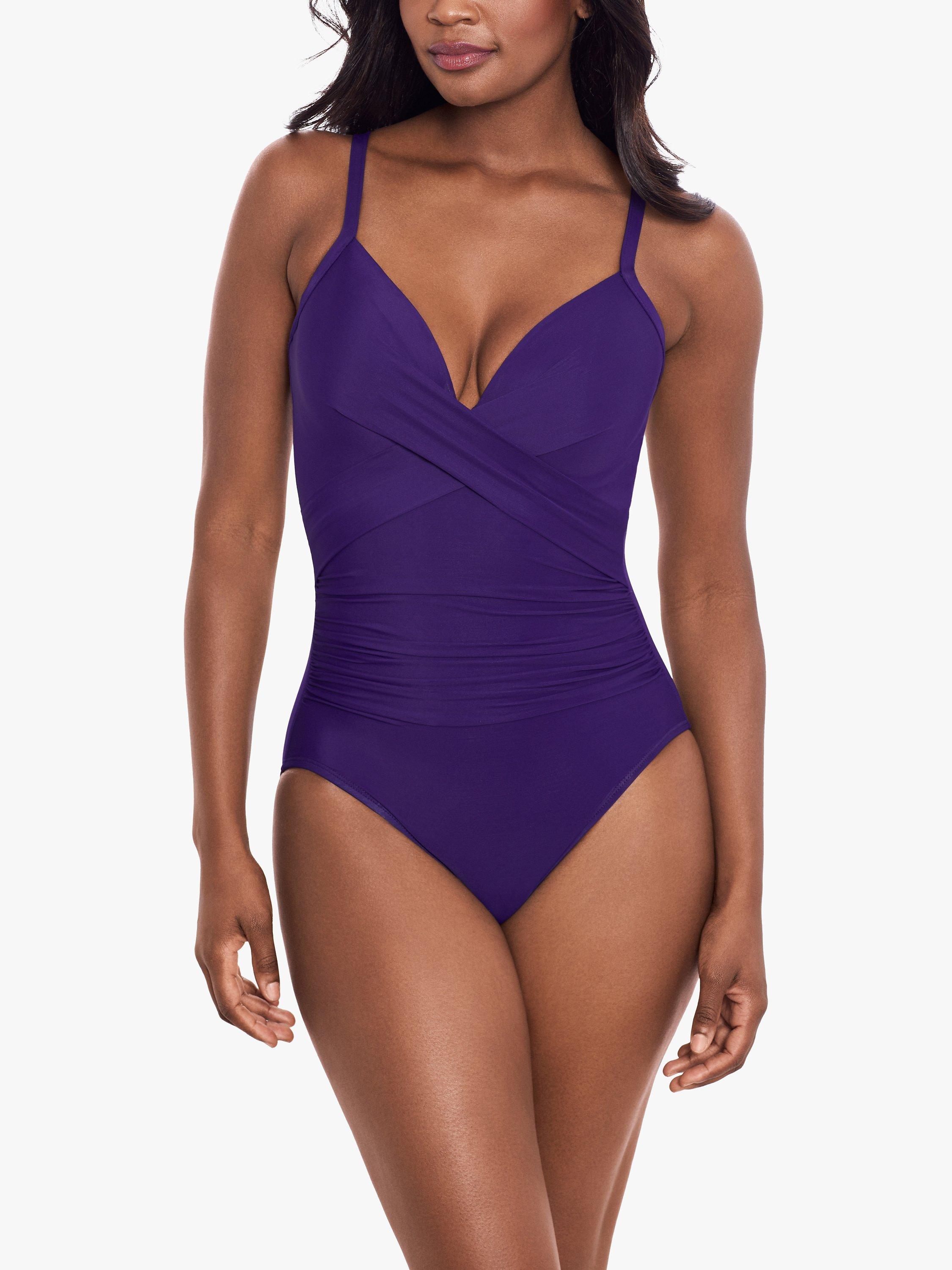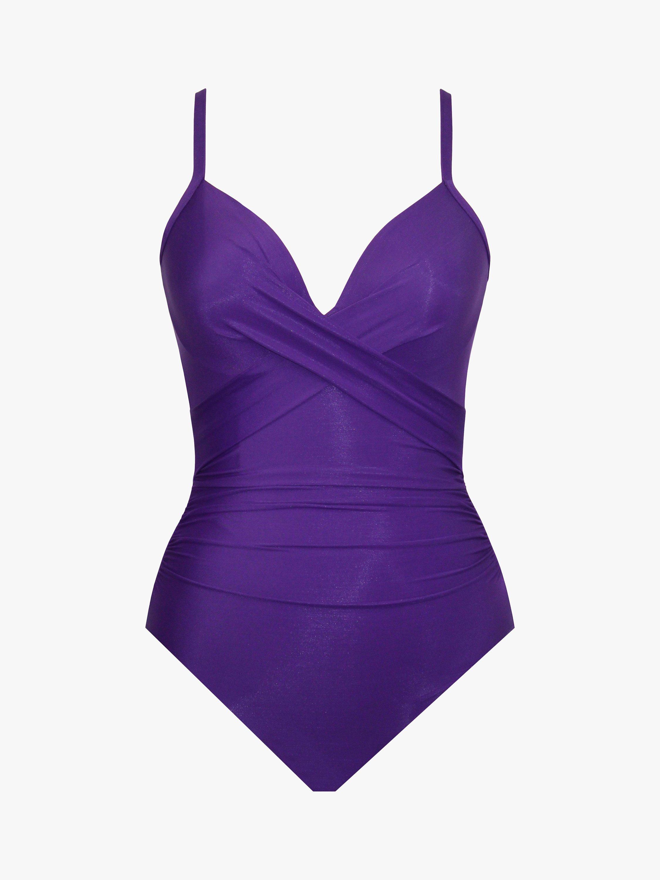Setting the mood for a sun-soaked day, this swimming costume from Miraclesuit has a flattering wrap neckline, moulded cups and comfortable crisscrossing straps at the back.