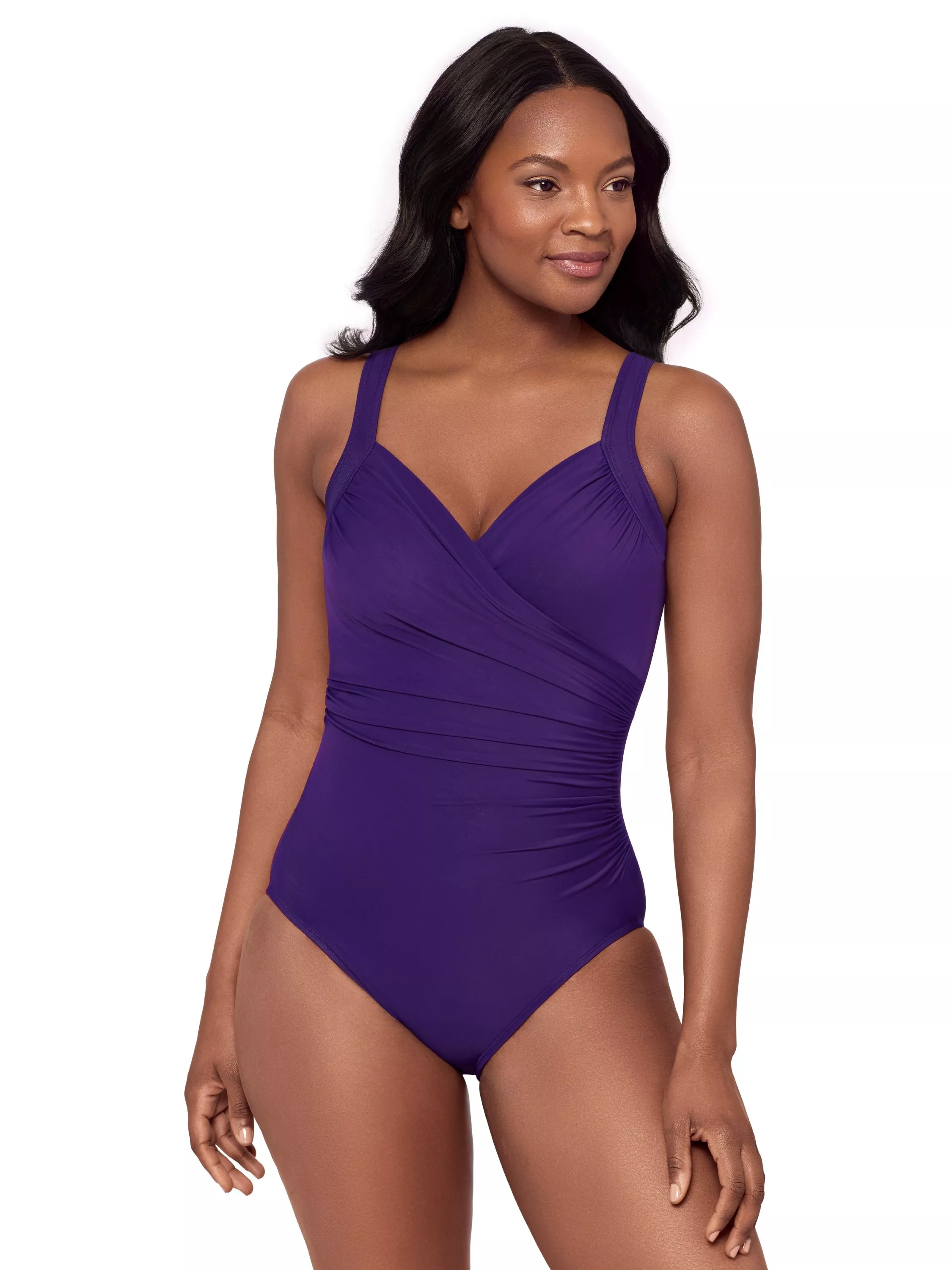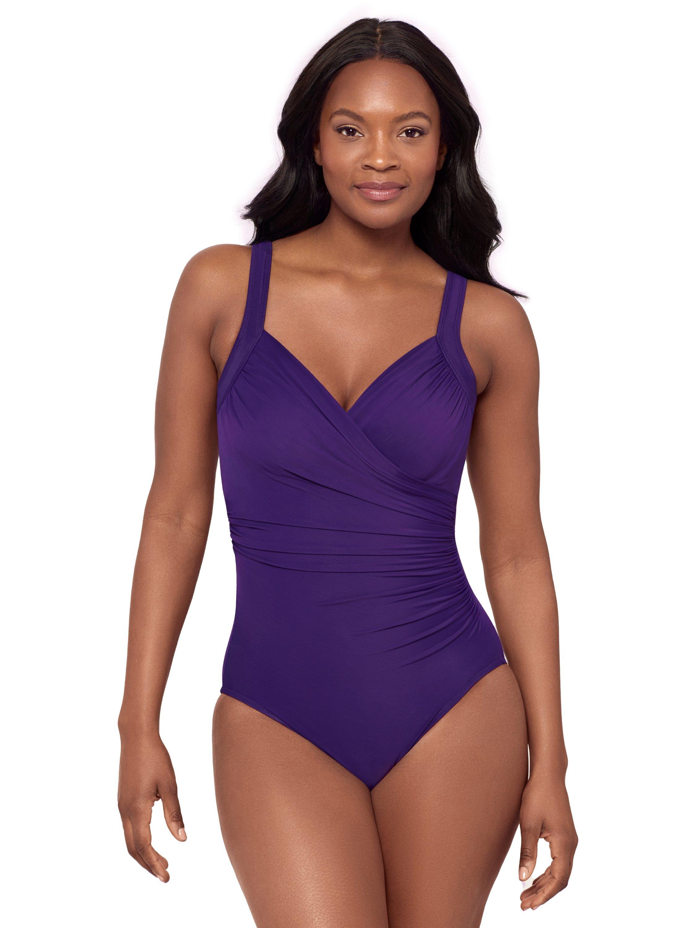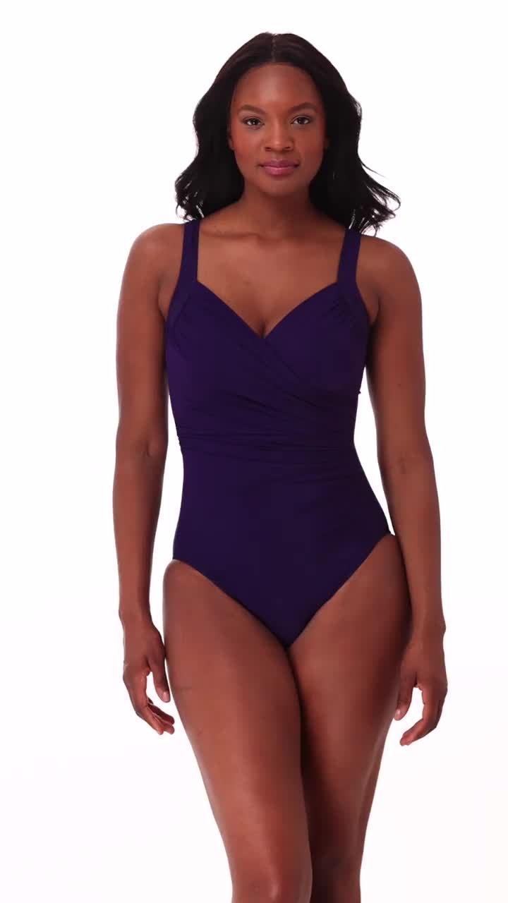 Sensibly shirred from bust to waist, the Miraclesuit Solid Sanibel Swimsuit showcases a slimmer silhouette as supportive, thicker and adjustable shoulder straps lead to a mid-scoop back for the ultimate in coverage. A shapely V-neckline accents your bust and leads to unique torso-wrapping. Made with LYCRA® XTRA LIFE™ Spandex for a long-lasting fit and Miraclesuit's Miratex fabric, providing all-over body control.