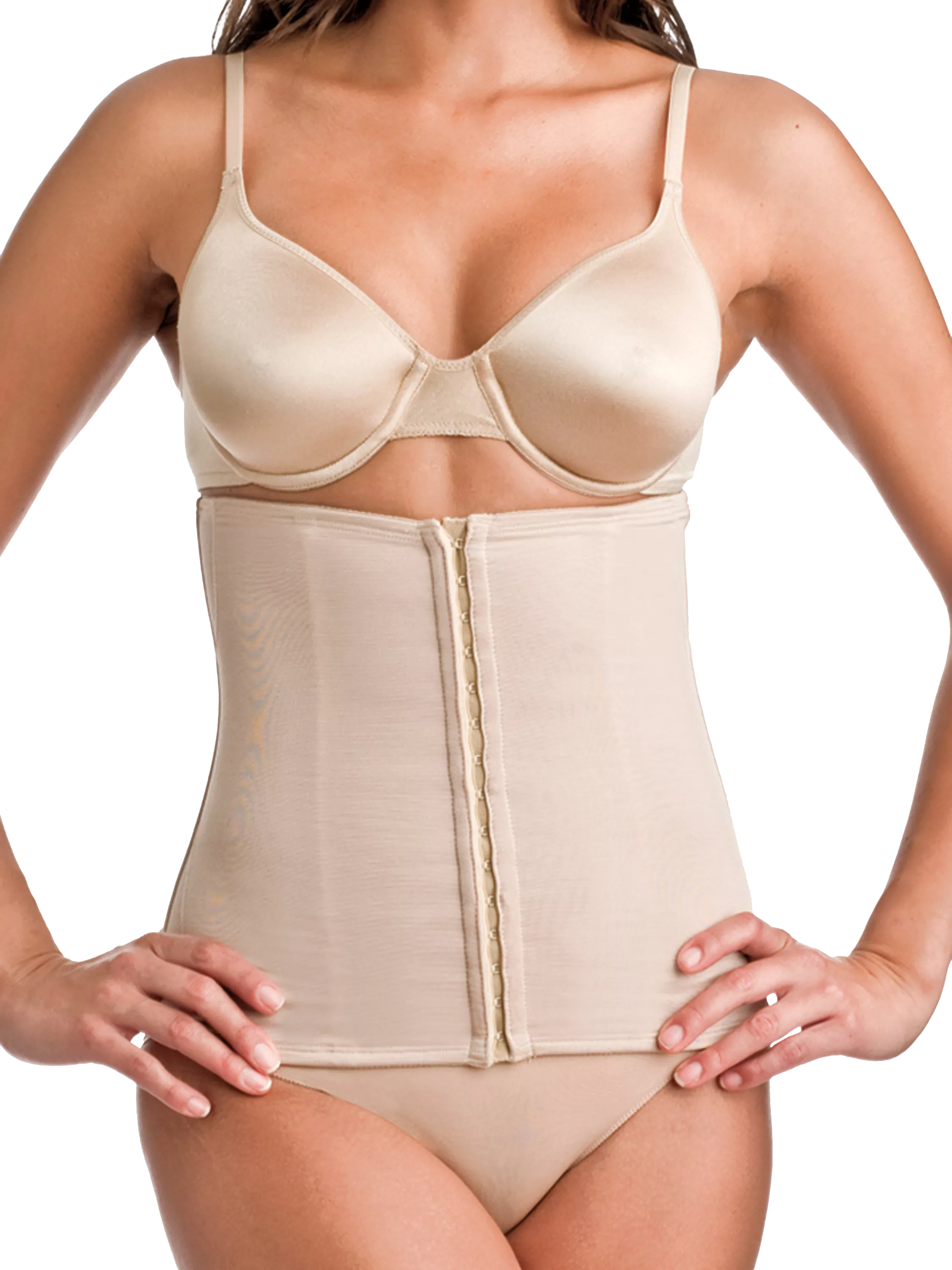This is a powerful Extra firm control garment to slim the middle torso area and will take inches off your waist, with the brand promise of look 10lb lighter in 10 seconds. This boned waist cincher has fifteen hooks, and stretch side panels allow you to move more freely.