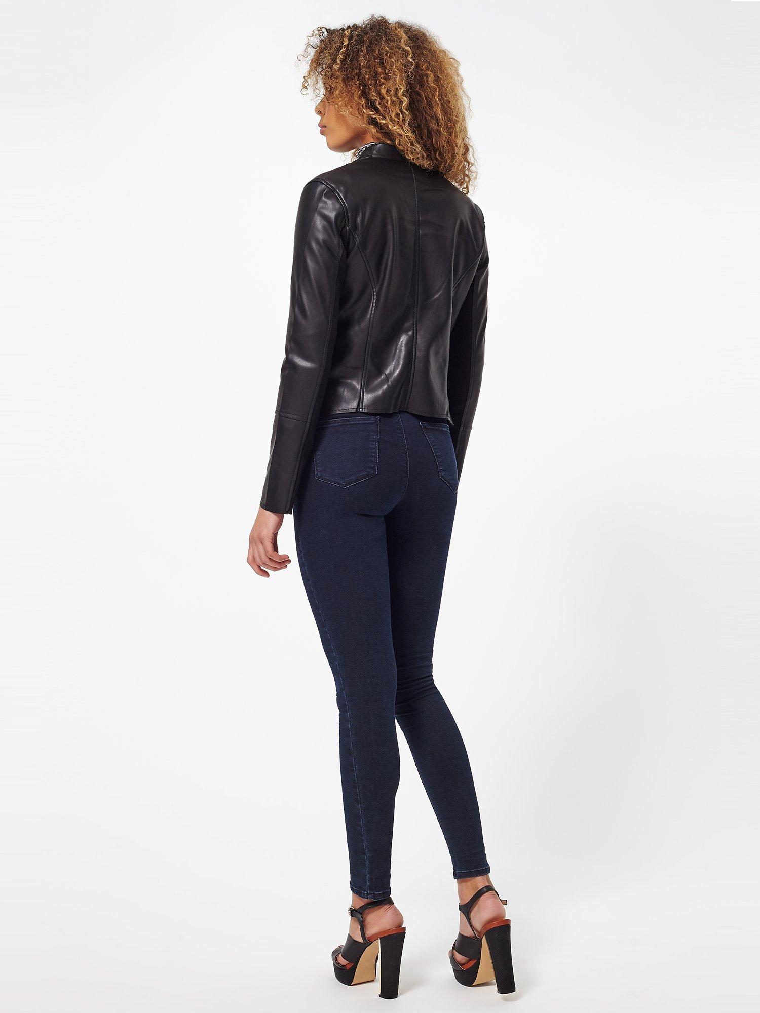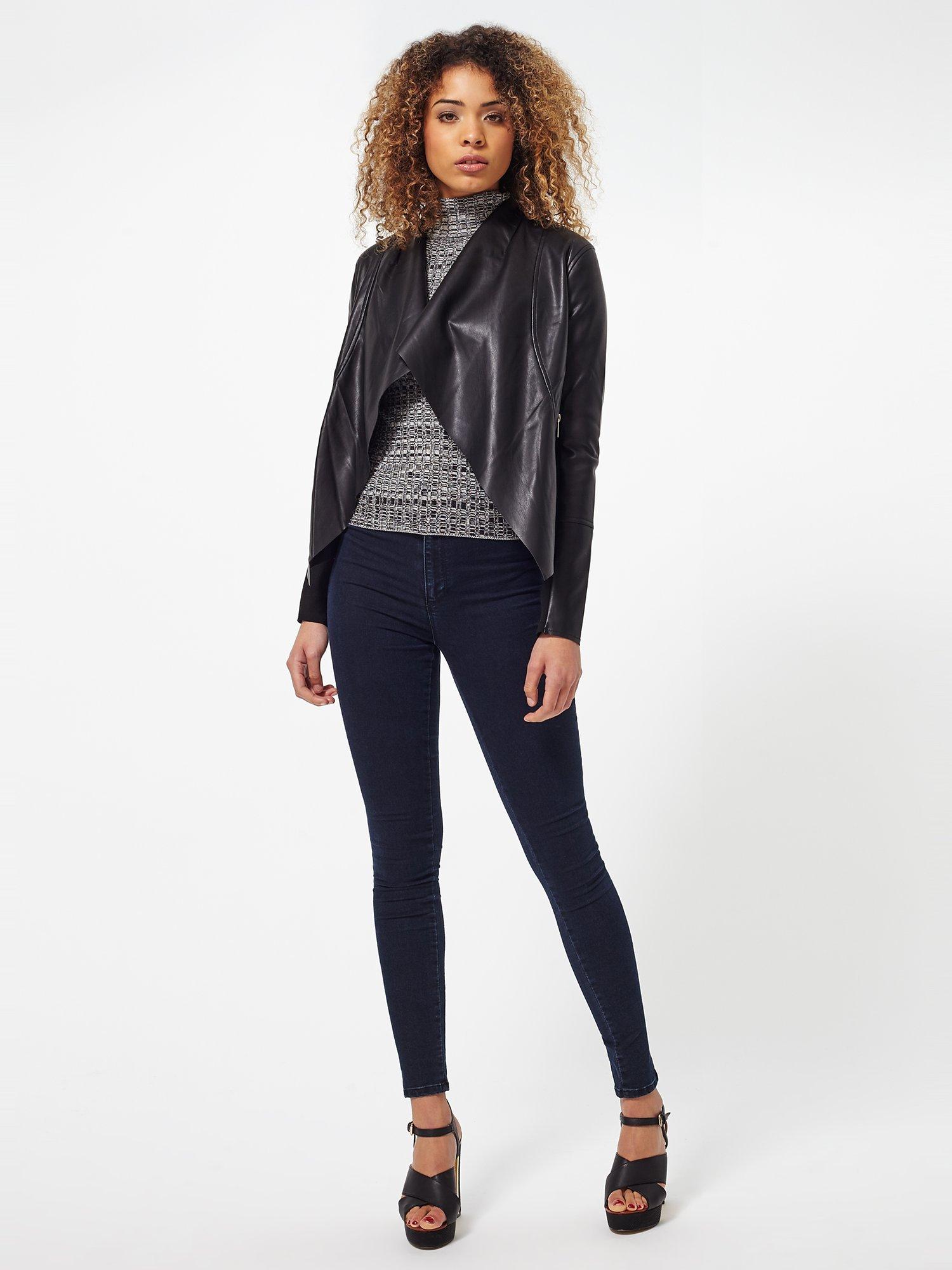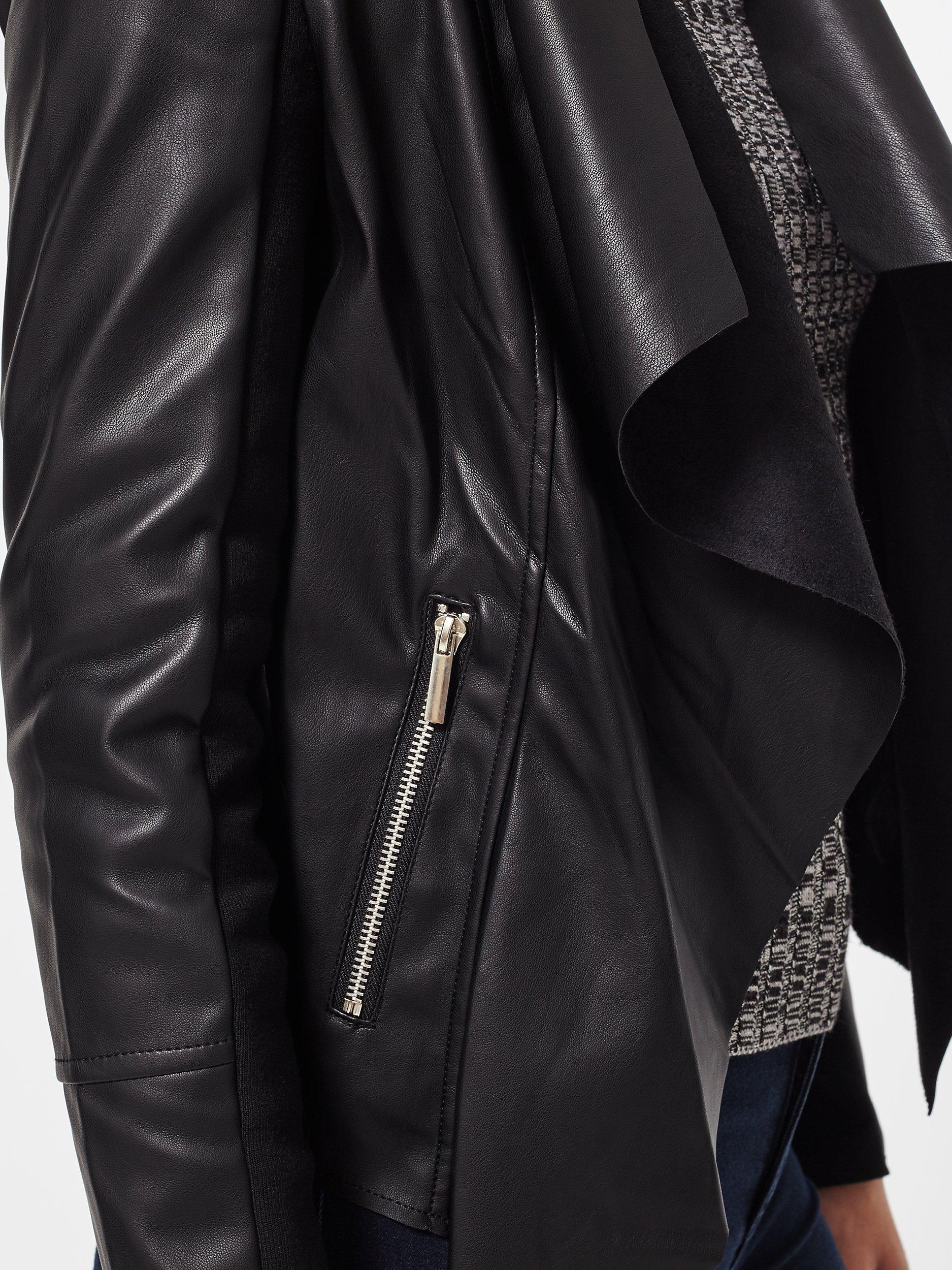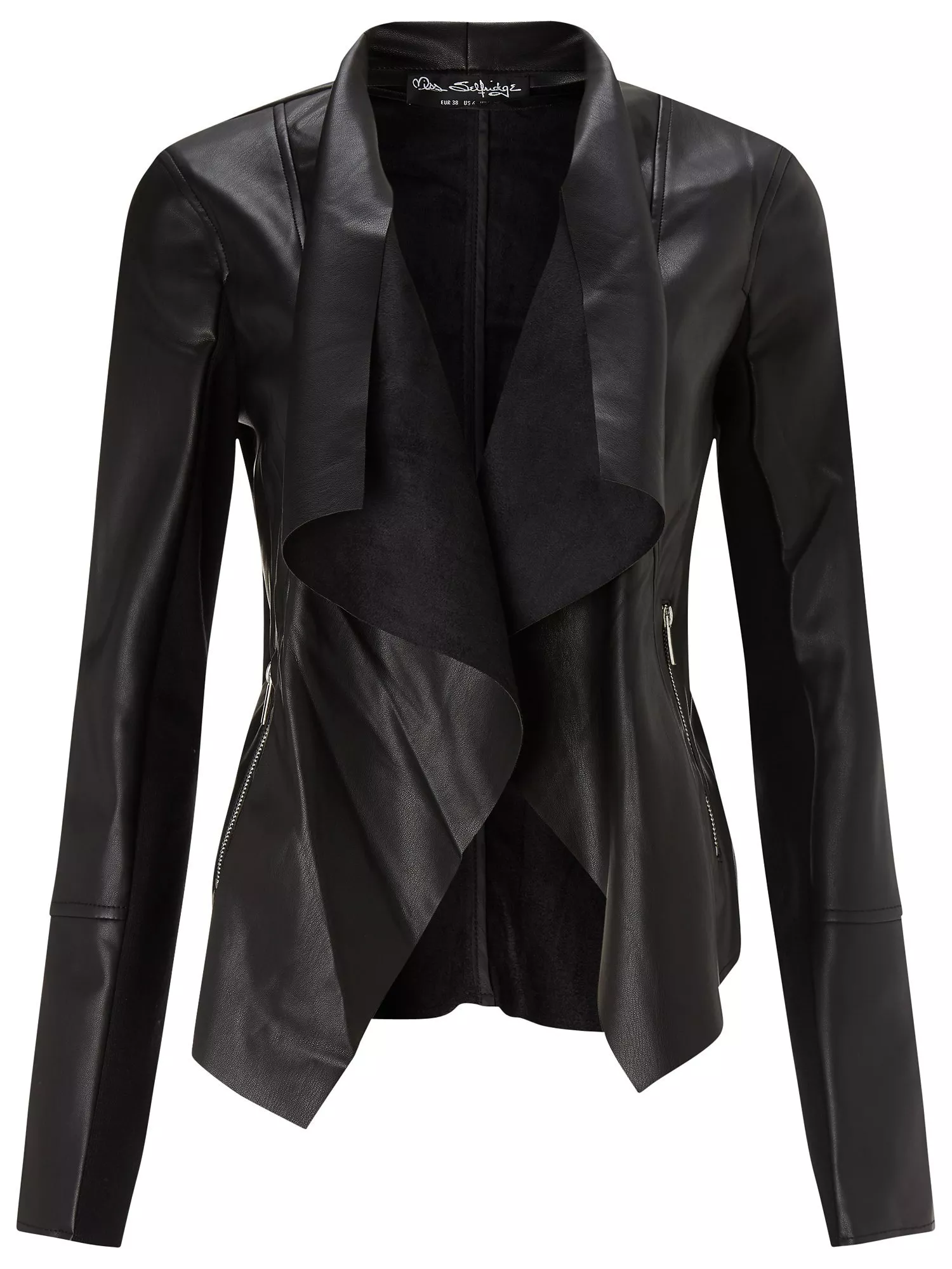 This faux leather biker jacket is given a more feminine touch with its waterfall neckline feature, teamed with silver-coloured zips at the opening of its pockets on either side for design and functionality.