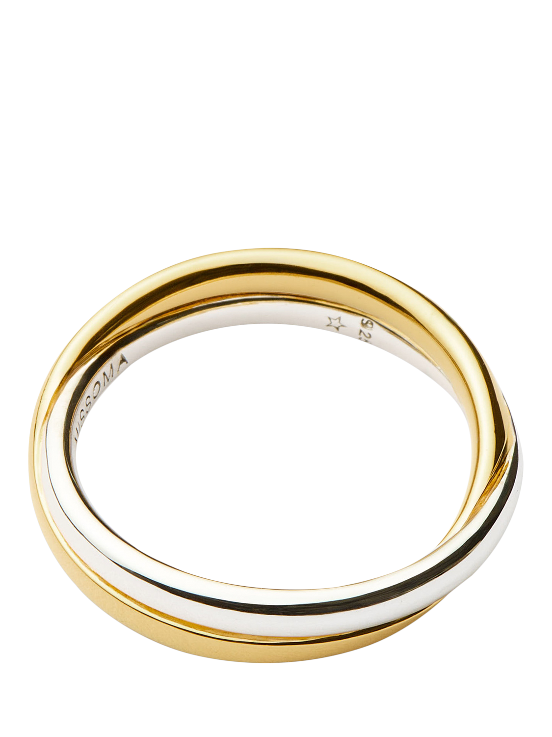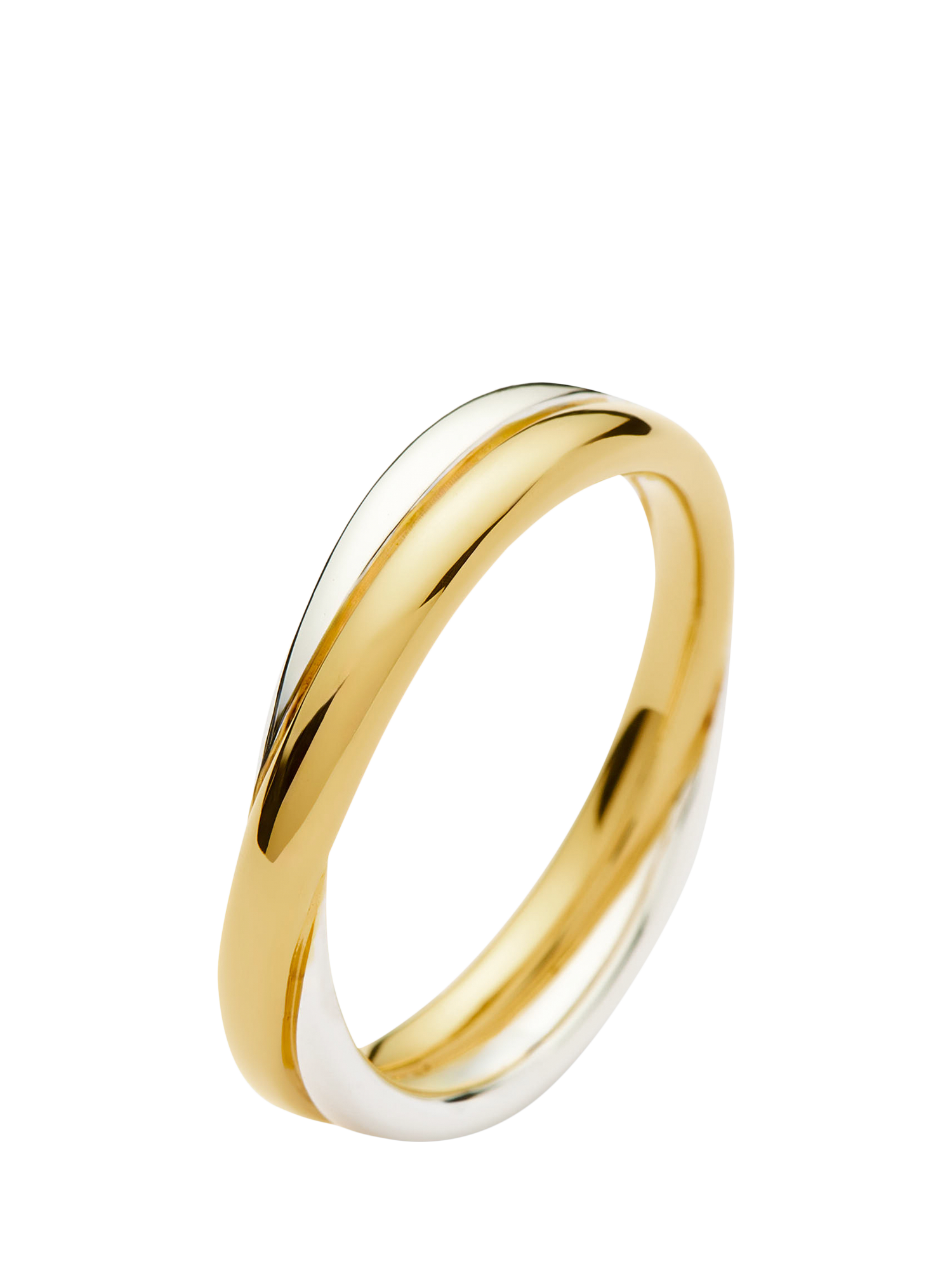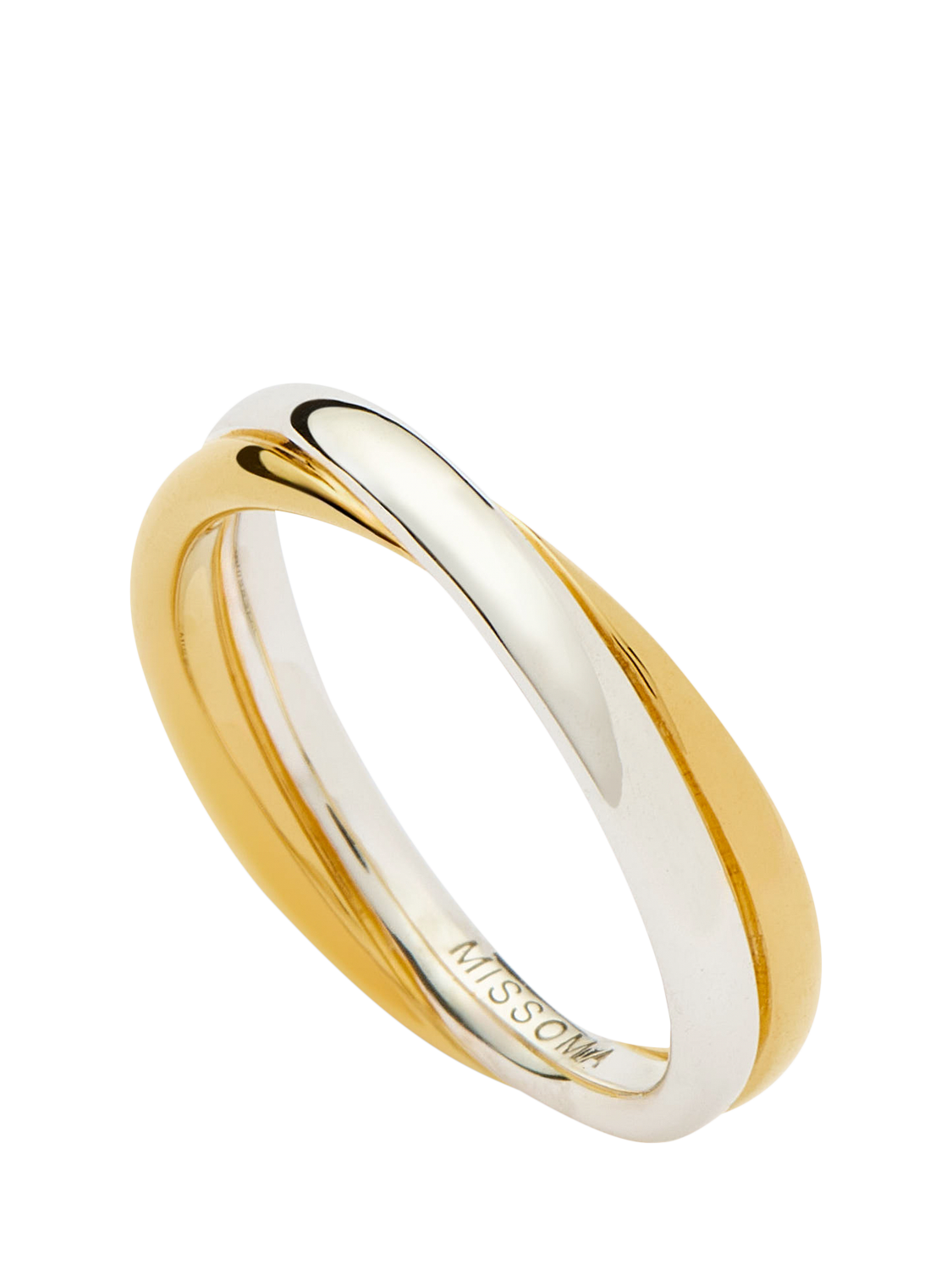 A classic, reimagined. This 80s maximalist statement ring features a unique cross-over design with mixed metal gold and silver bands. Just as standout on its own as it is as part of a ring stack.
