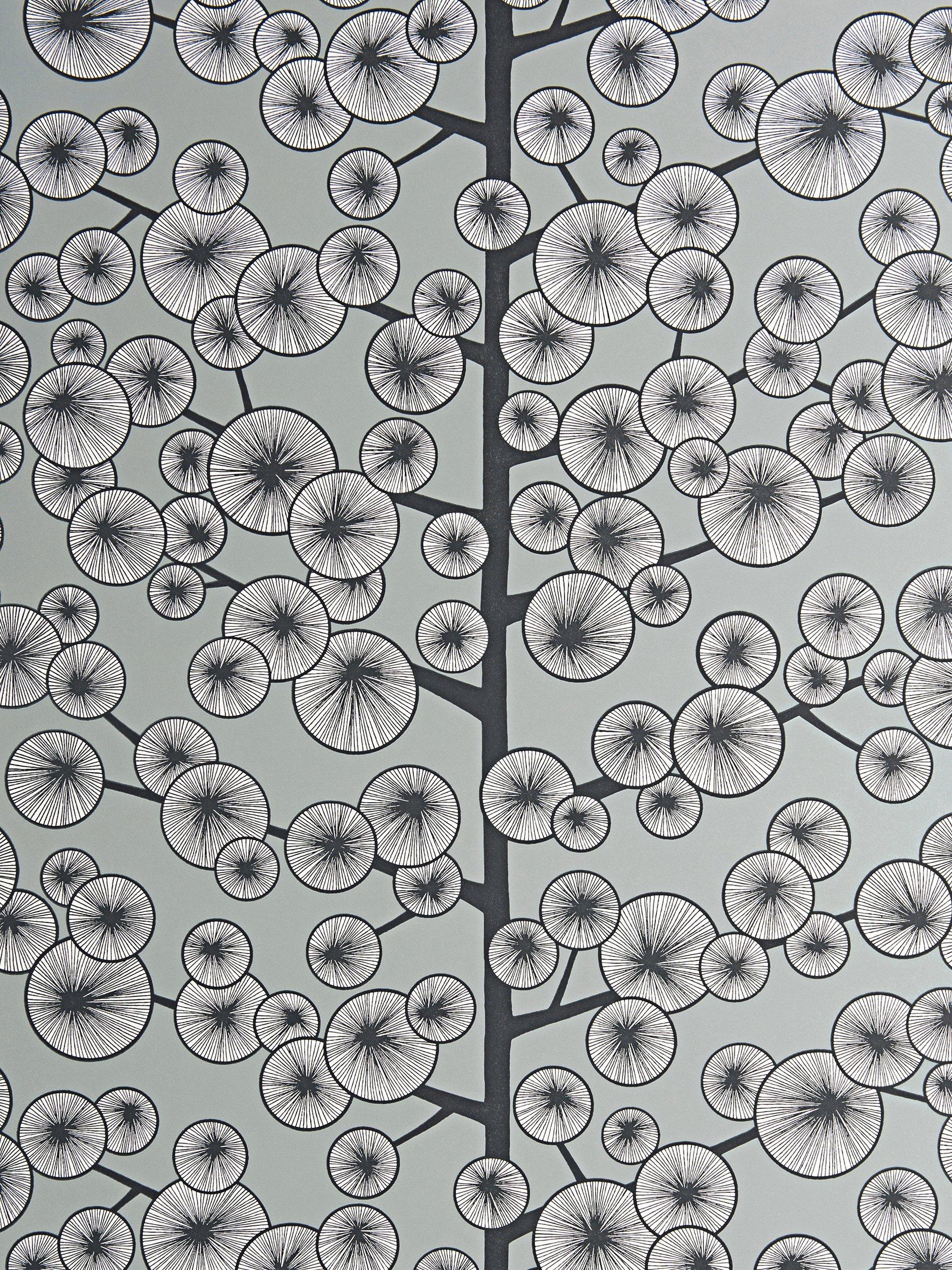 An expressive graphic tree design inspired by visits to Japan. Bold circular designs pop out between tree branches, as flowers crowd the stems and obscure the sky, reminiscent of sakura or cherry blossom.