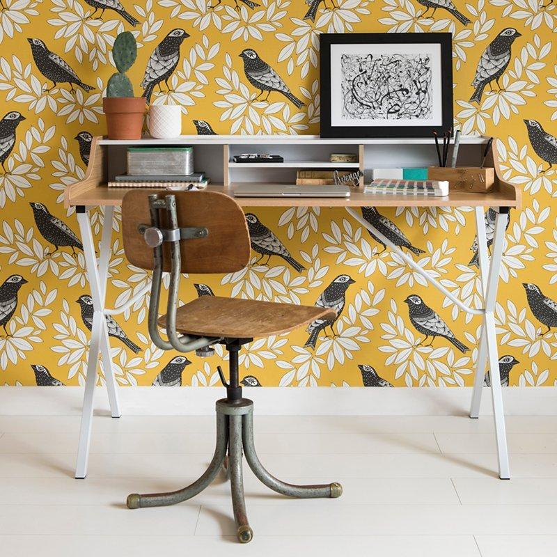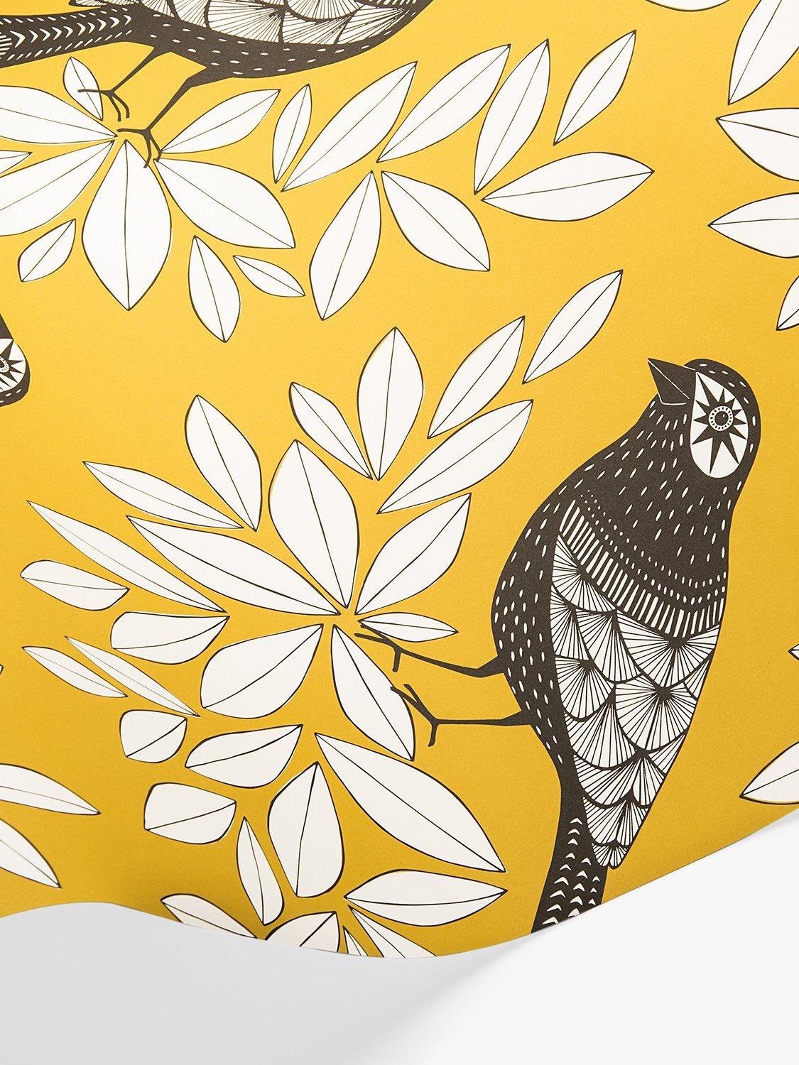 A whimsical design featuring hand drawn songbirds nestling among sprigs of leaves.