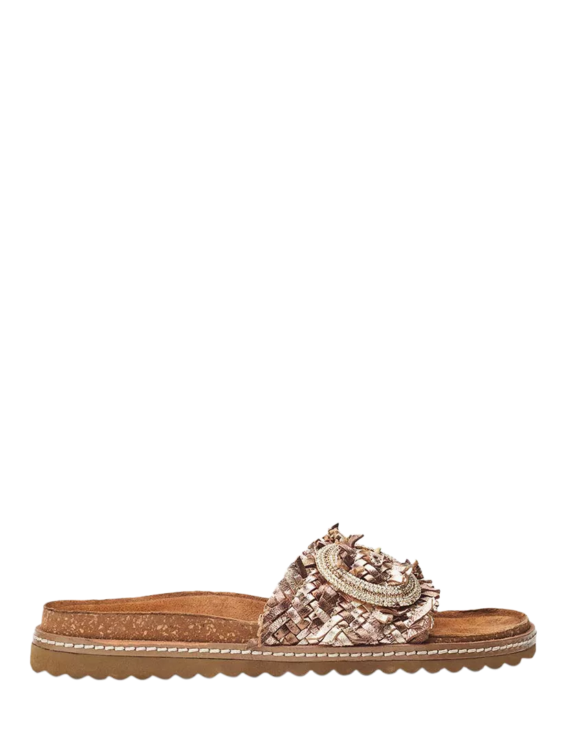Meet Jarilla — Moda in Pelle's slip-on sandal made more by an embellished woven upper and an inviting suede insole.