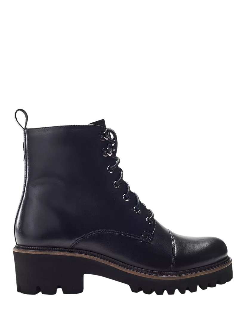 Upgrade your boot collection with Okari. This leather lace-up boot features a chunky wedge sole, providing a flattering lift without compromising on stability. The cushioned insole ensures all-day comfort, making it ideal for long days on your feet. The convenient side zip makes on-and-off wear easy, combining fashion and functionality.