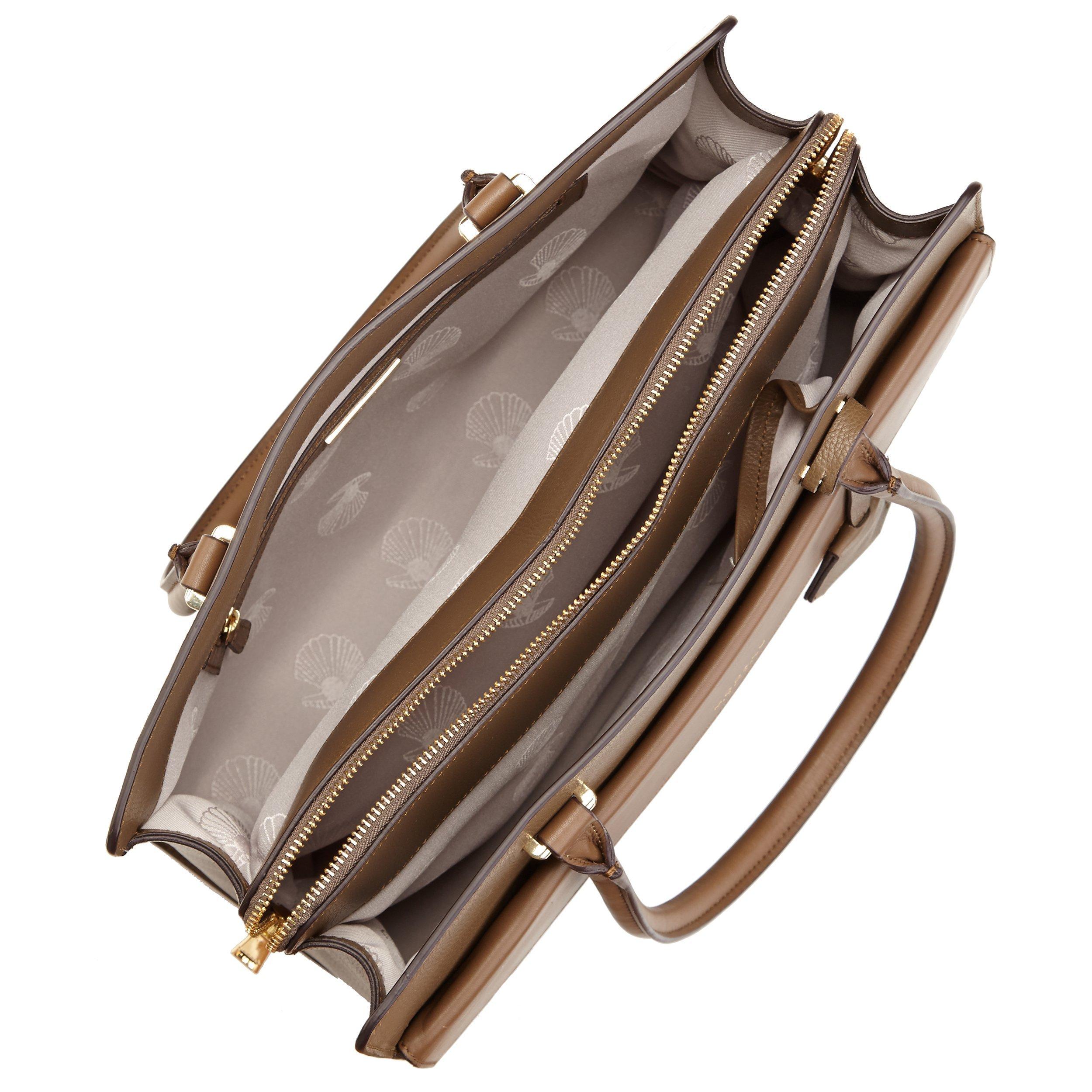Crafted from soft Satara leather and featuring 3 compartments; 1 with a zipped fastening and 2 are open with zip and slip pockets. Includes 2 zip and slip pockets on the front with a box calf flap trim and is finished with shell jacquard fabric lining in ivory.