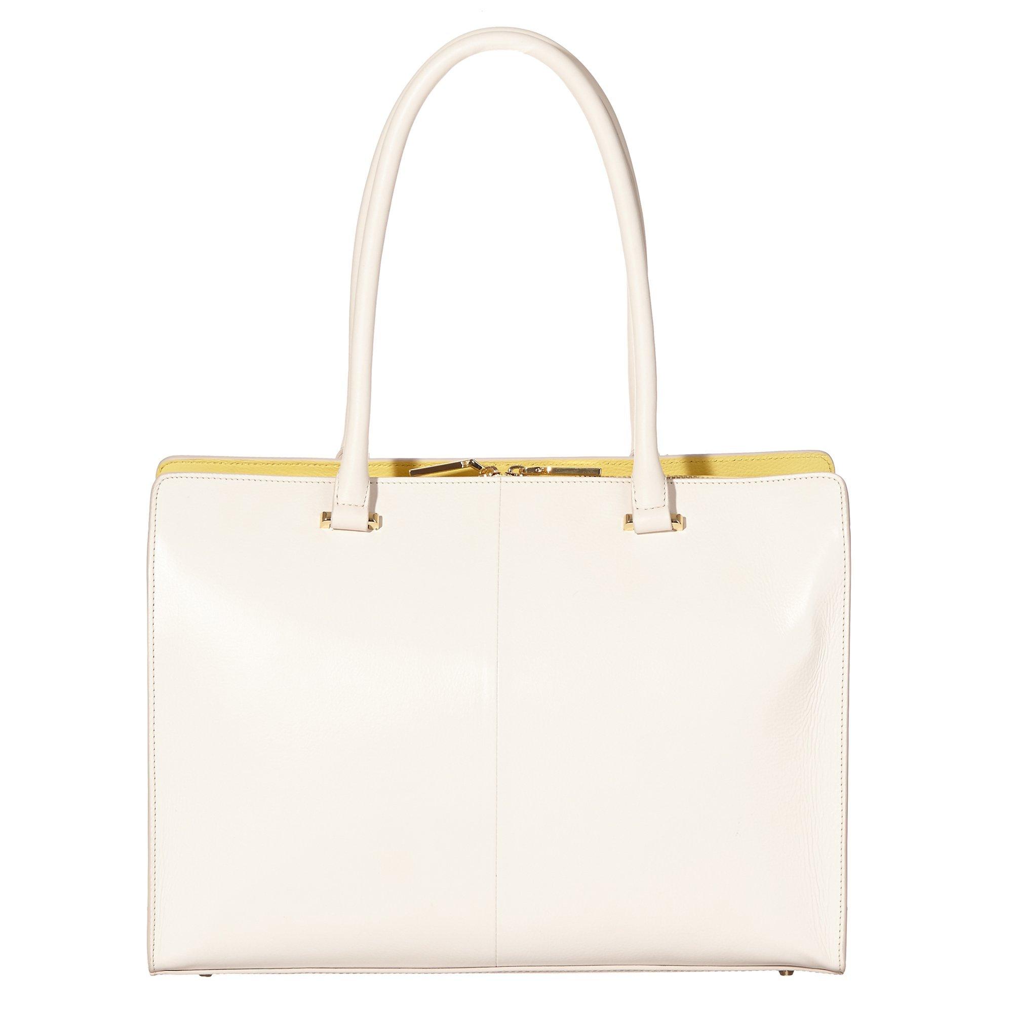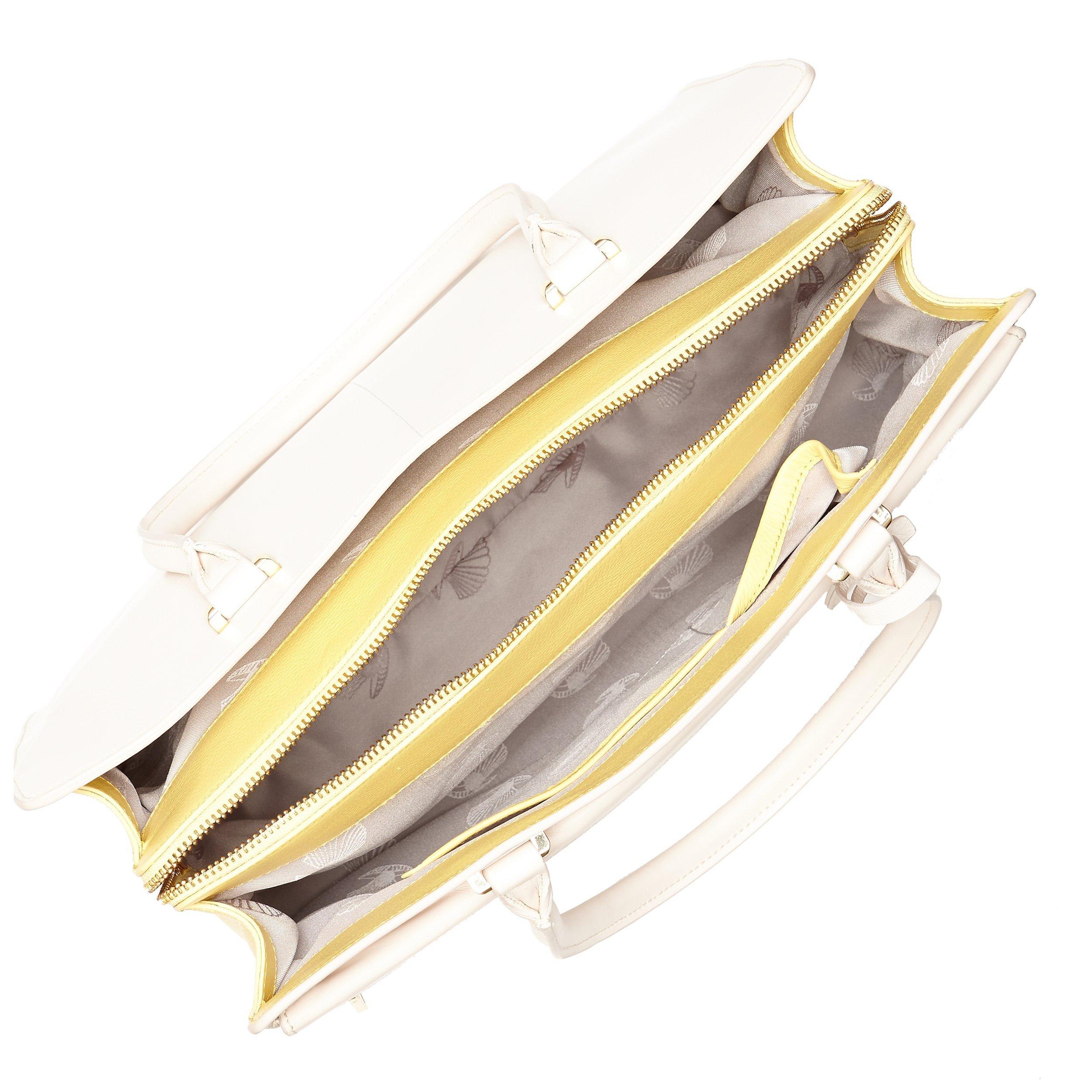 Crafted from soft Satara leather and featuring 3 compartments; 1 with a zipped fastening and 2 are open with zip and slip pockets. Includes 2 zip and slip pockets on the front with a box calf flap trim and is finished with shell jacquard fabric lining in ivory.