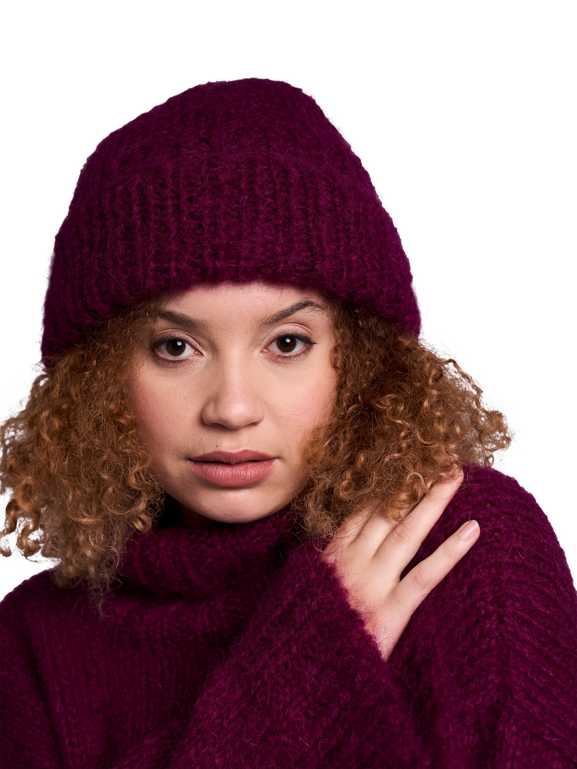 A textured beanie in stocking stitch with a folded, ribbed brim - a cosy piece for those colder days.