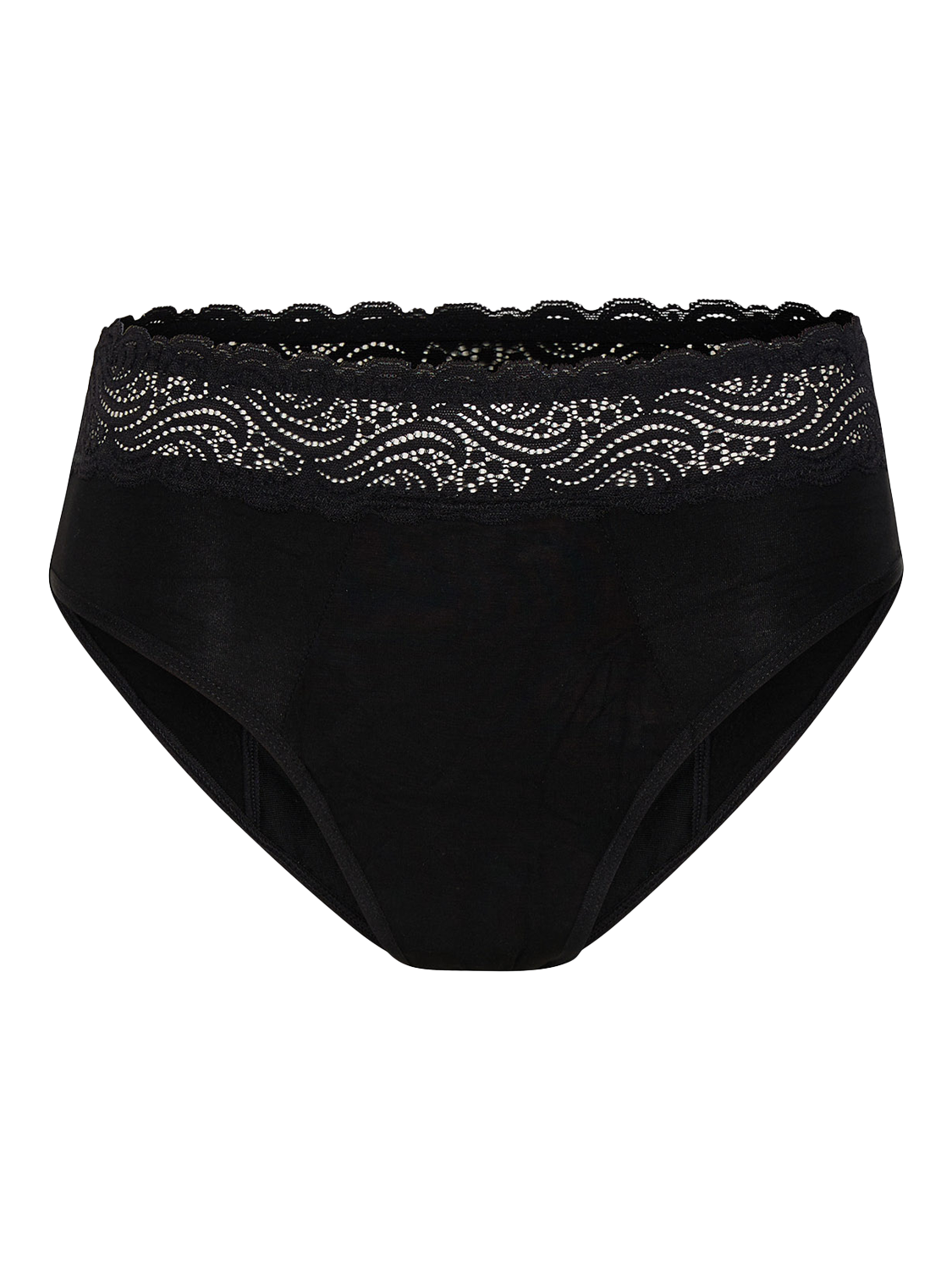 Comfortable bikini-shaped period knickers offering super-to-overnight absorbency for heavy periods. Made with Modibodi's award-winning technology and designed with a high leg cut and soft, lace waistband.