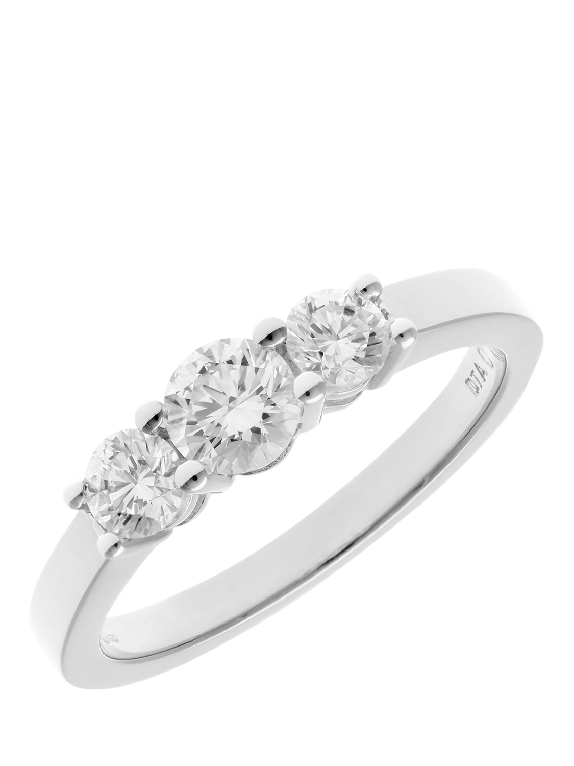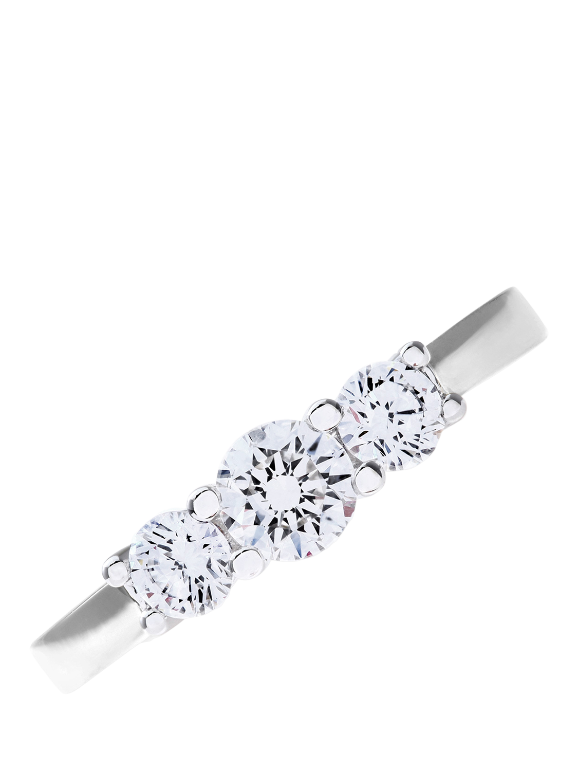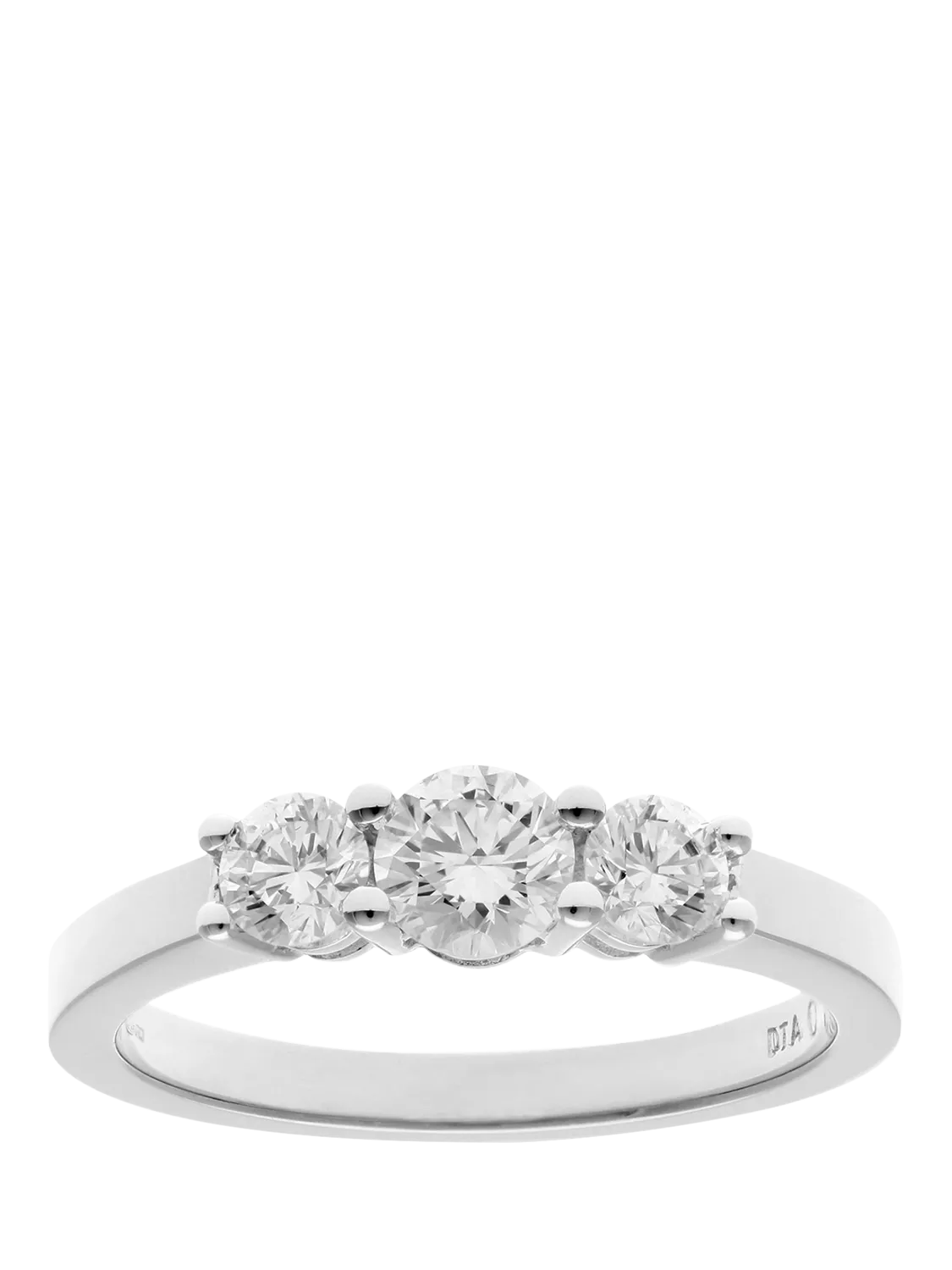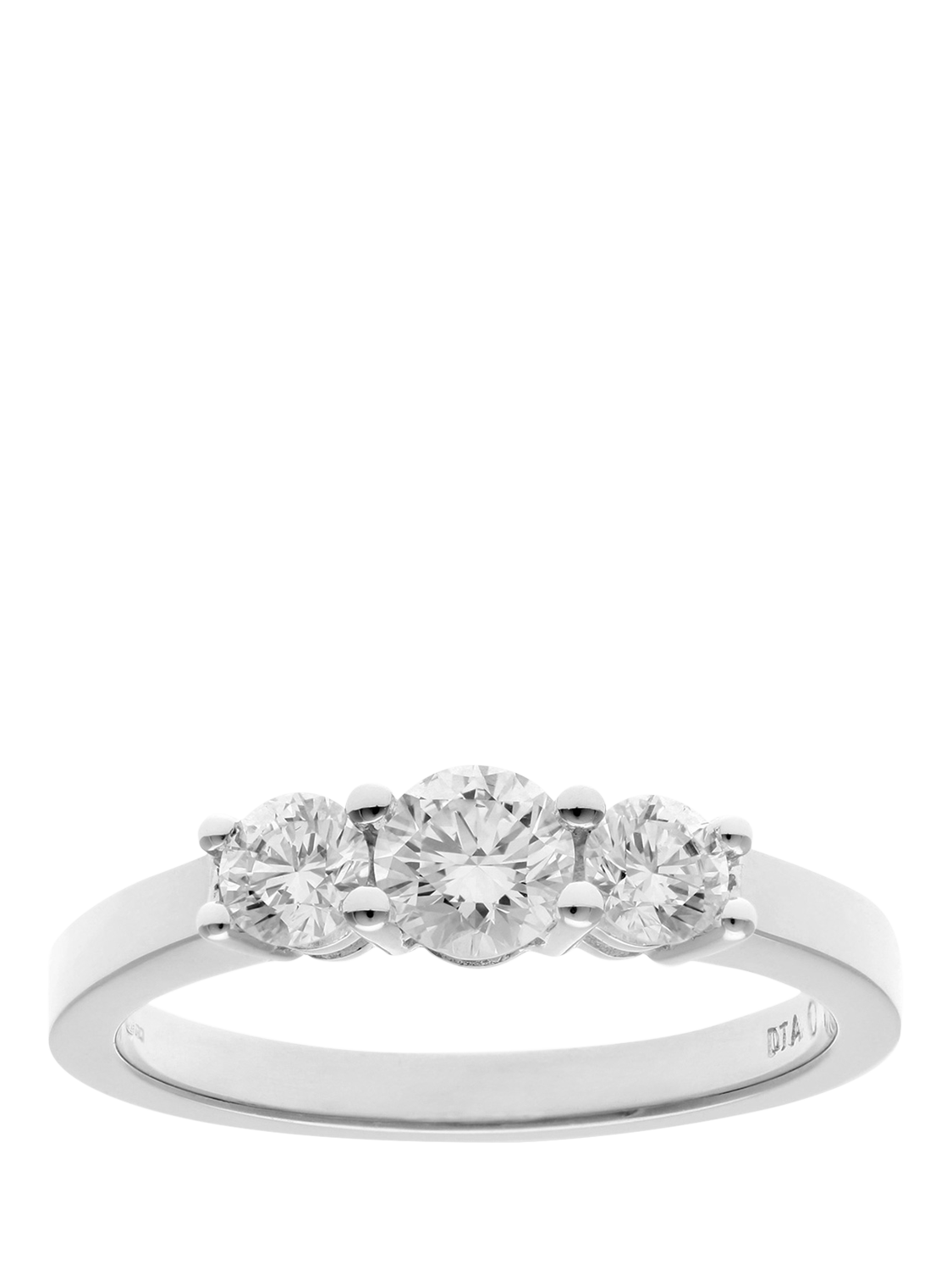 Timeless and symbolic, this elegant trilogy ring is crafted in 18ct white gold and features three round brilliant-cut diamonds with a combined weight of 0.75 carat. The central diamond is gracefully flanked by two slightly smaller stones, enhancing the overall brilliance while maintaining a balanced, classic silhouette. The trilogy design, representing the past, present, and future, adds meaningful sentiment to this refined piece, making it a popular choice for anniversaries and engagements alike. With its clean lines and graceful proportions, this ring is a classic expression of enduring love and sophisticated style.