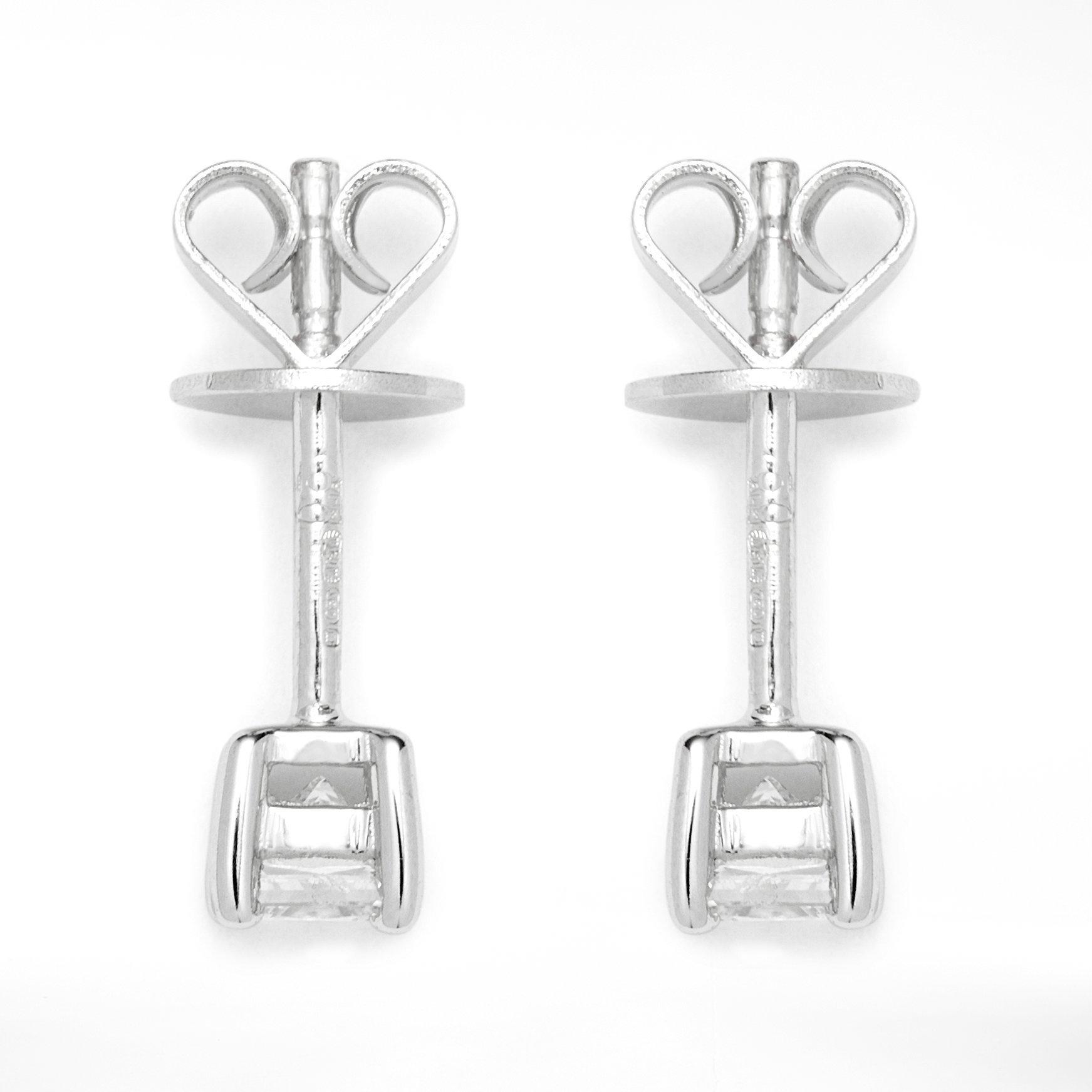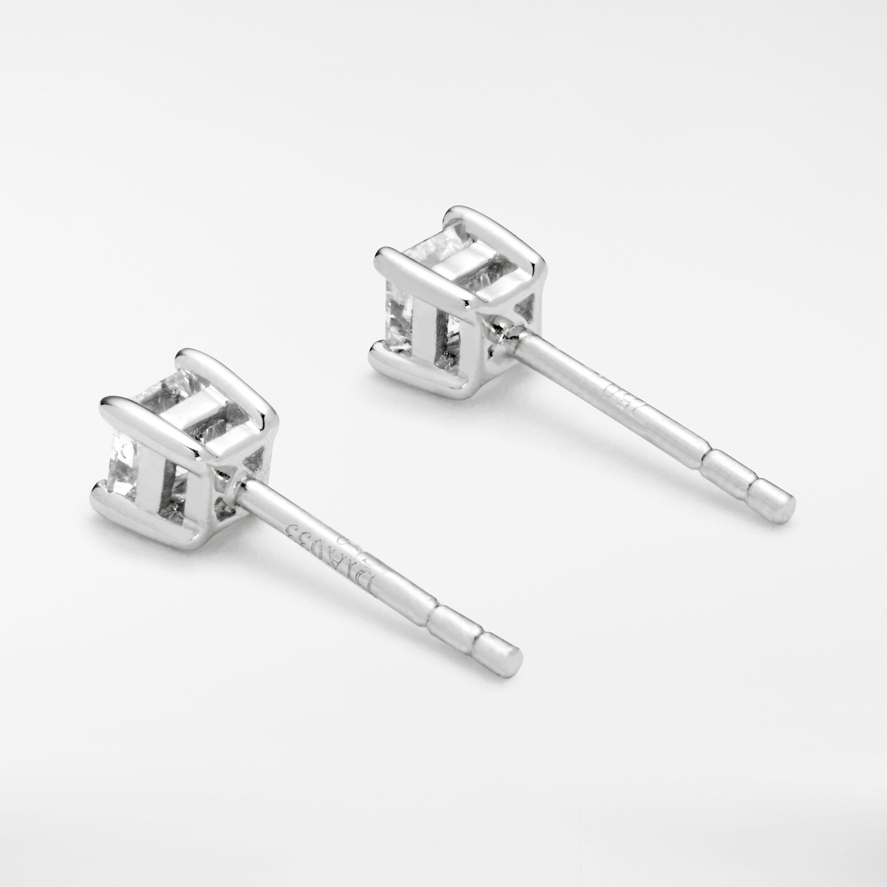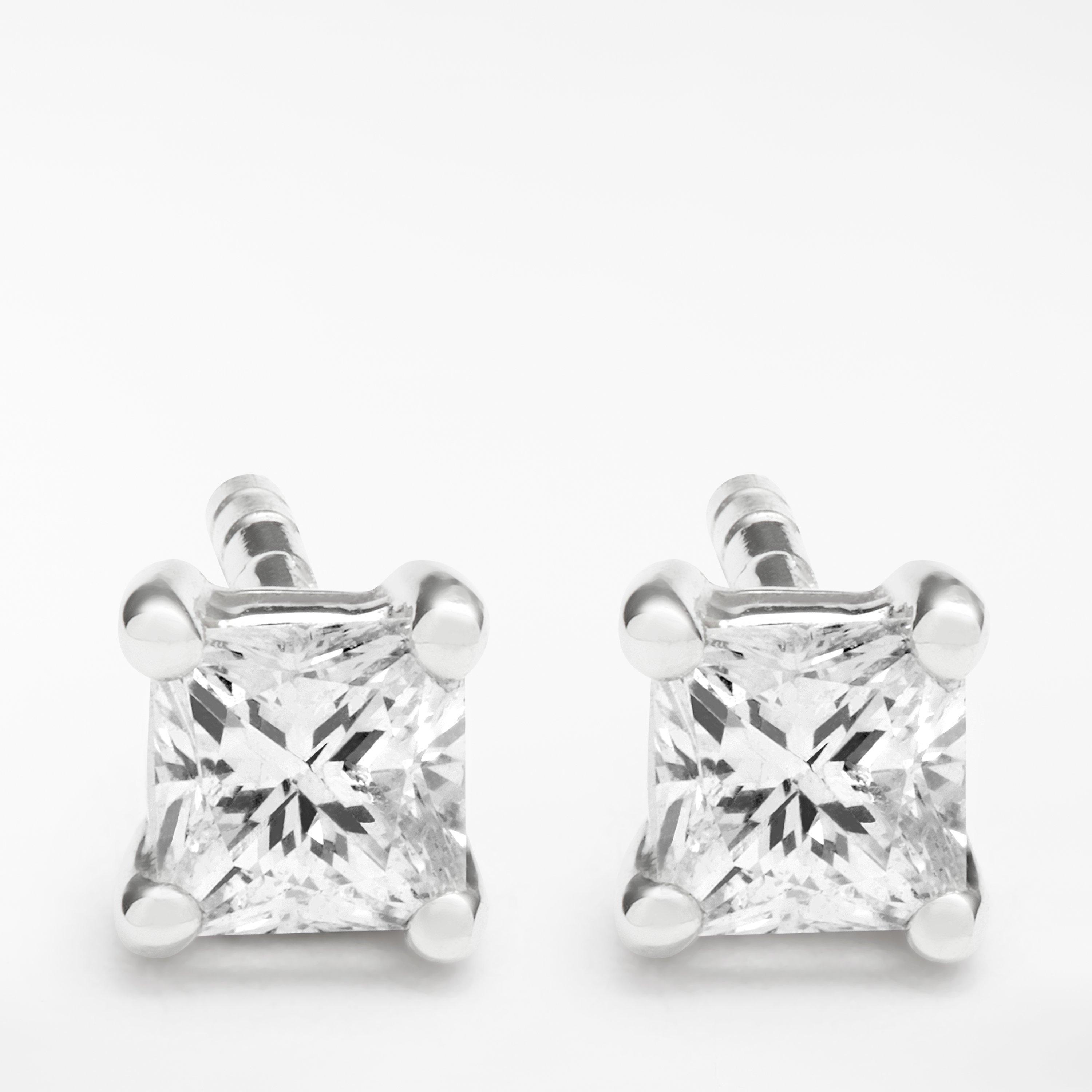 Crafted from 18 carat white gold, the earrings present a striking princess-cut solitaire diamond. The earrings come with traditional butterfly fittings and will make a staple favourite for various occasions.