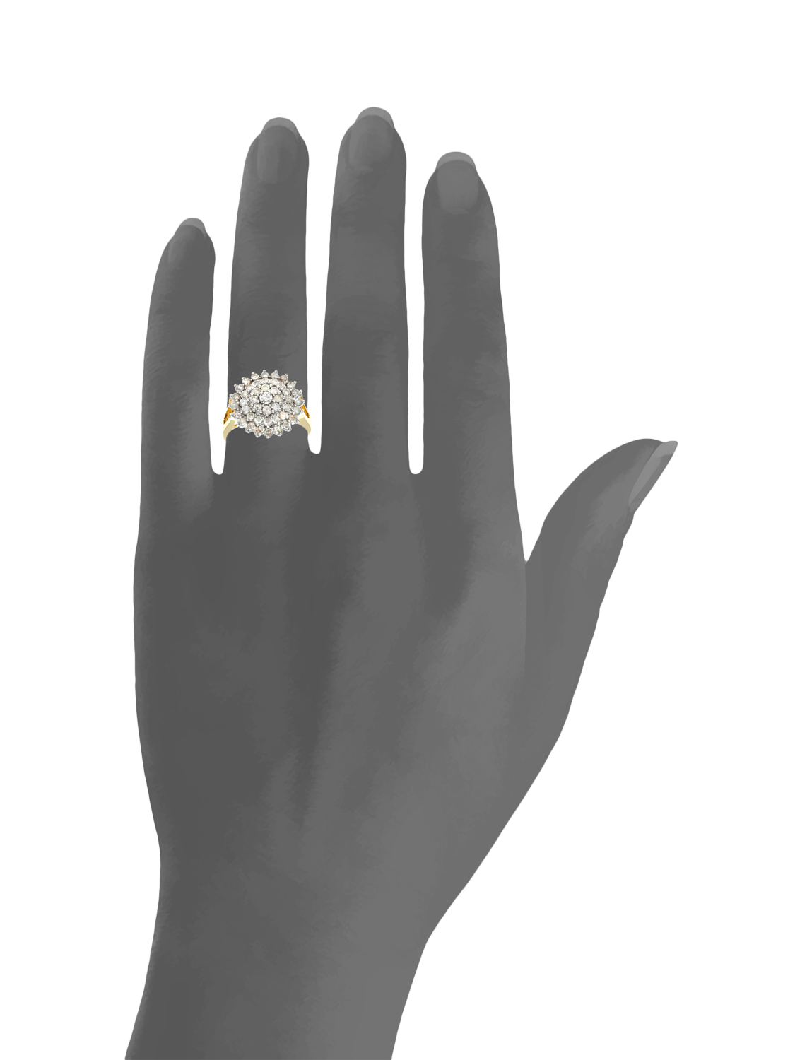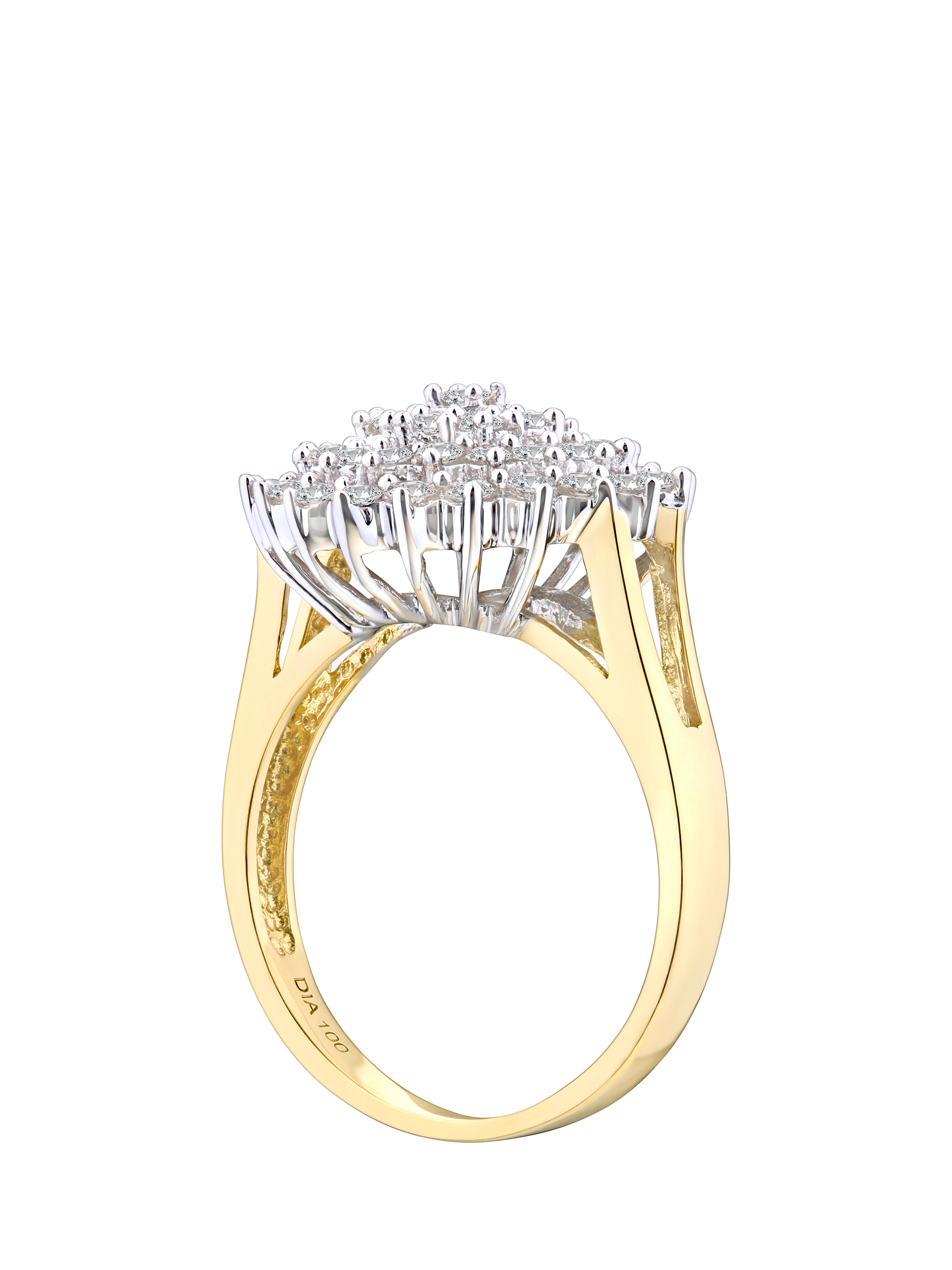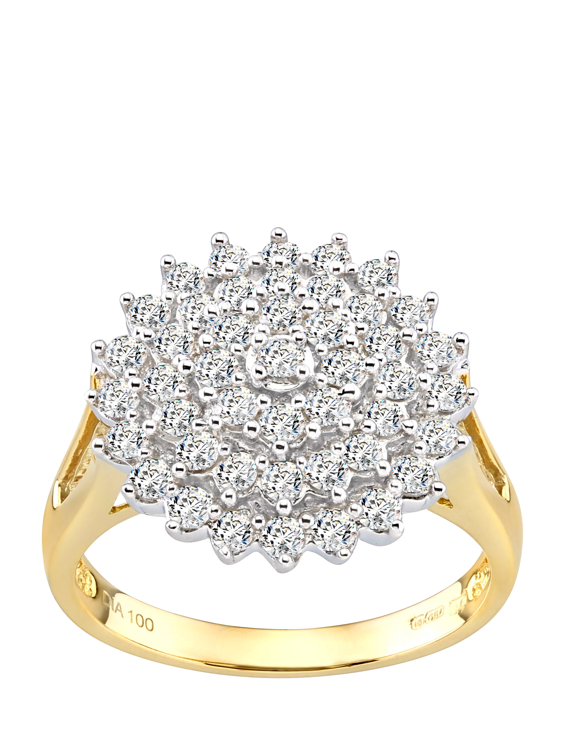 Exuding timeless brilliance, this luxurious ring is crafted from rich 18ct yellow gold, and set with a total of 1.00 carat of round brilliant-cut diamonds. Arranged in a striking multi-row cluster design, 45 diamonds are meticulously positioned to create a broad, sparkling surface that catches the light from every angle. The layered setting offers both depth and dimension, delivering maximum radiance with a bold yet elegant silhouette. Perfect for special occasions or as a dazzling statement piece, this ring combines classic craftsmanship with lasting glamour.