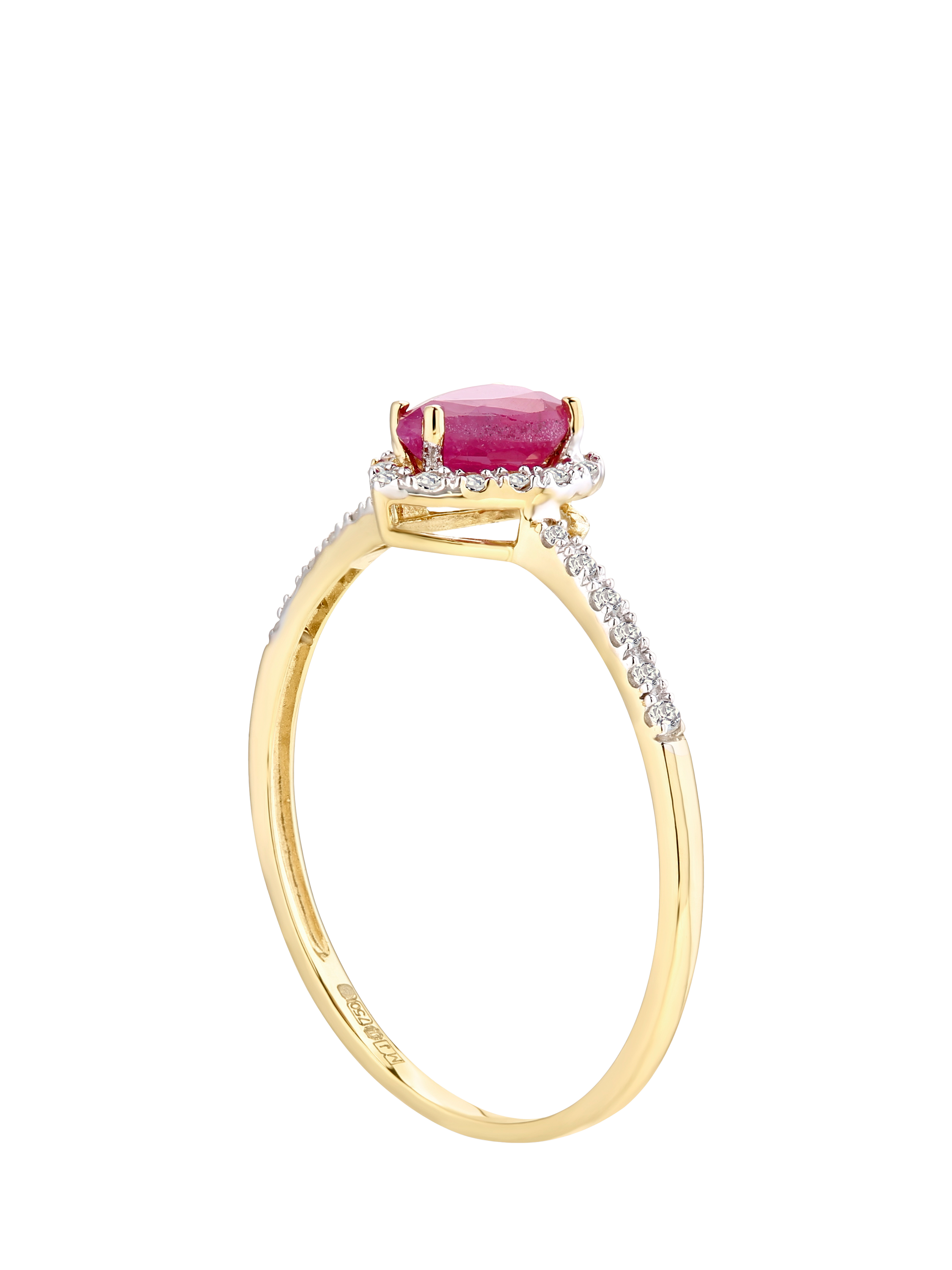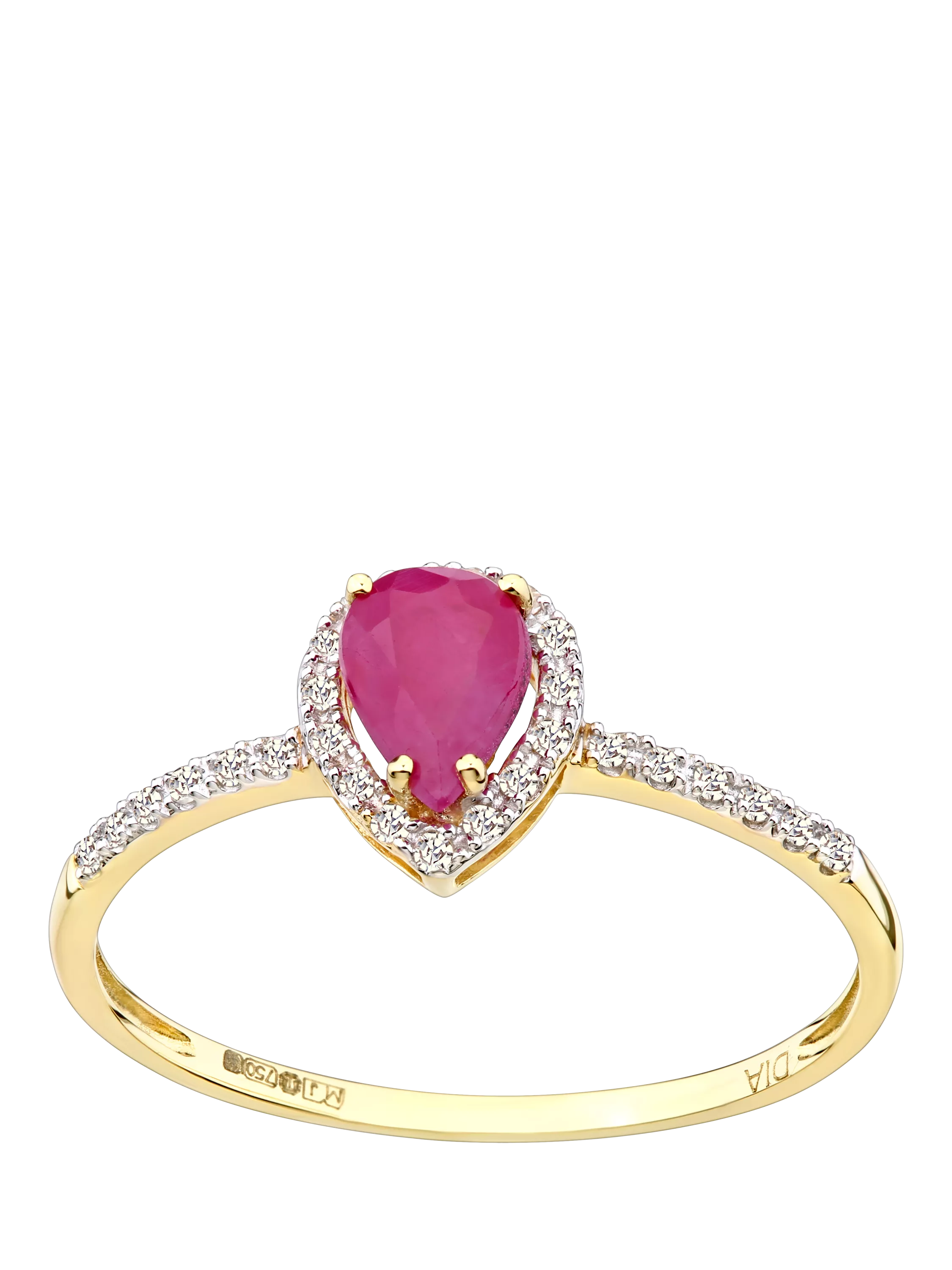 This stunning ring in 18ct yellow gold features a 6x4mm pear-shaped ruby with a total gemstone weight of 0.50ct, radiating deep red brilliance. A surrounding cluster of round brilliant-cut diamonds totalling 0.10 carats adds an elegant shimmer. Its romantic teardrop shape and rich tone make it a graceful, timeless addition to any collection.