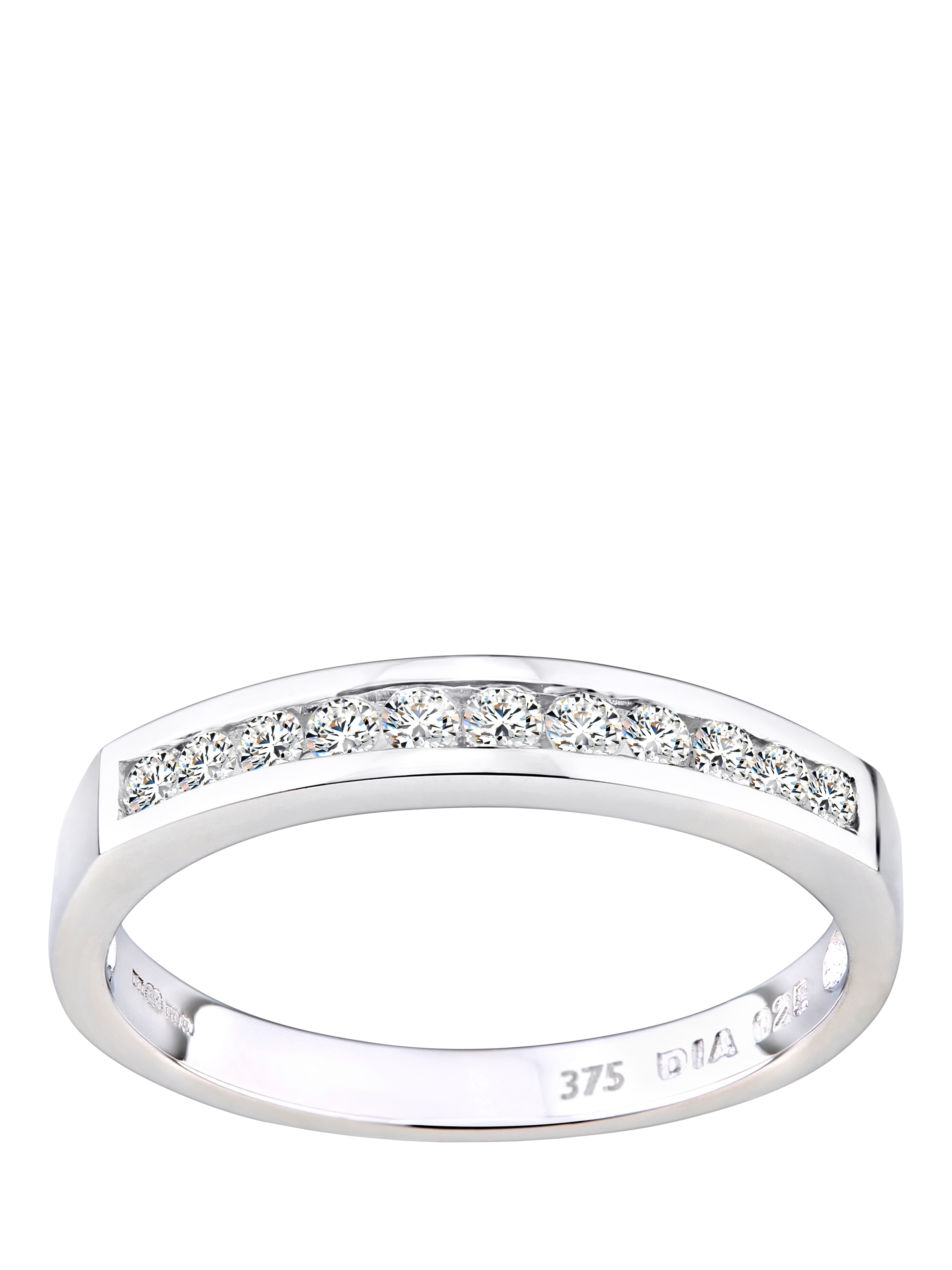 Sleek and sophisticated, this eternity ring is crafted in polished 9ct white gold and showcases nine round brilliant-cut diamonds in a secure channel setting. With a total diamond weight of 0.25 carats, the design delivers a striking display of sparkle across the finger. The clean lines of the channel setting offer both elegance and practicality, ensuring the diamonds are well-protected while enhancing their natural brilliance. A meaningful symbol of everlasting love, this classic ring is perfect as a wedding, anniversary, or stacking piece.