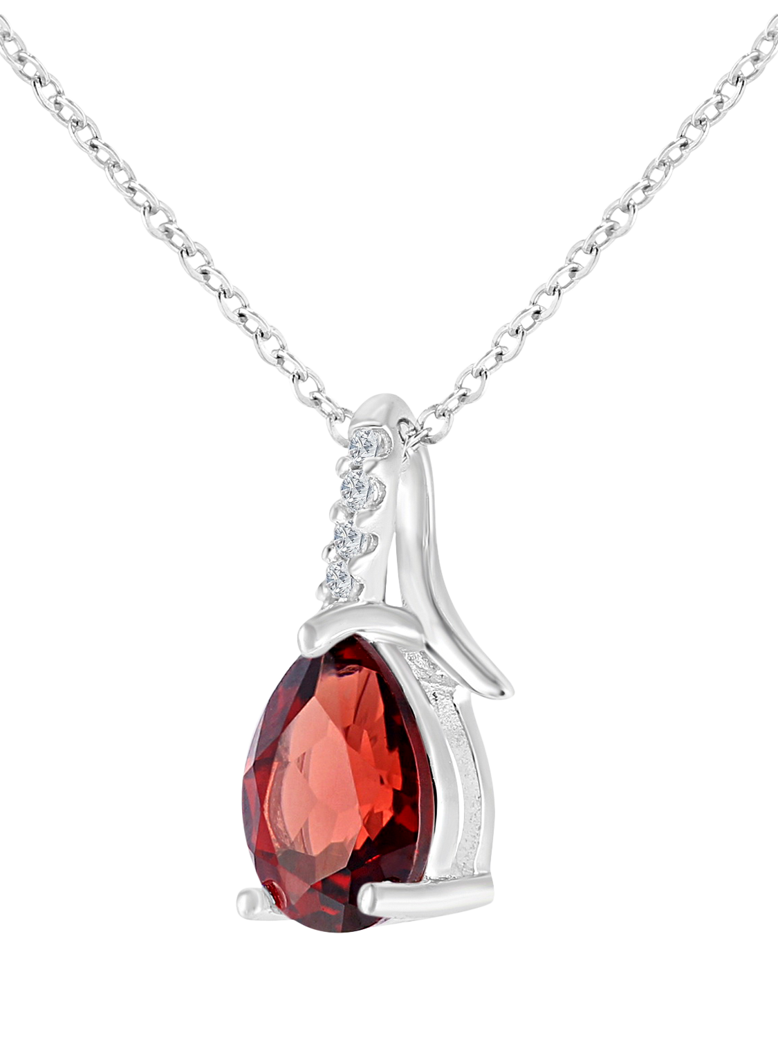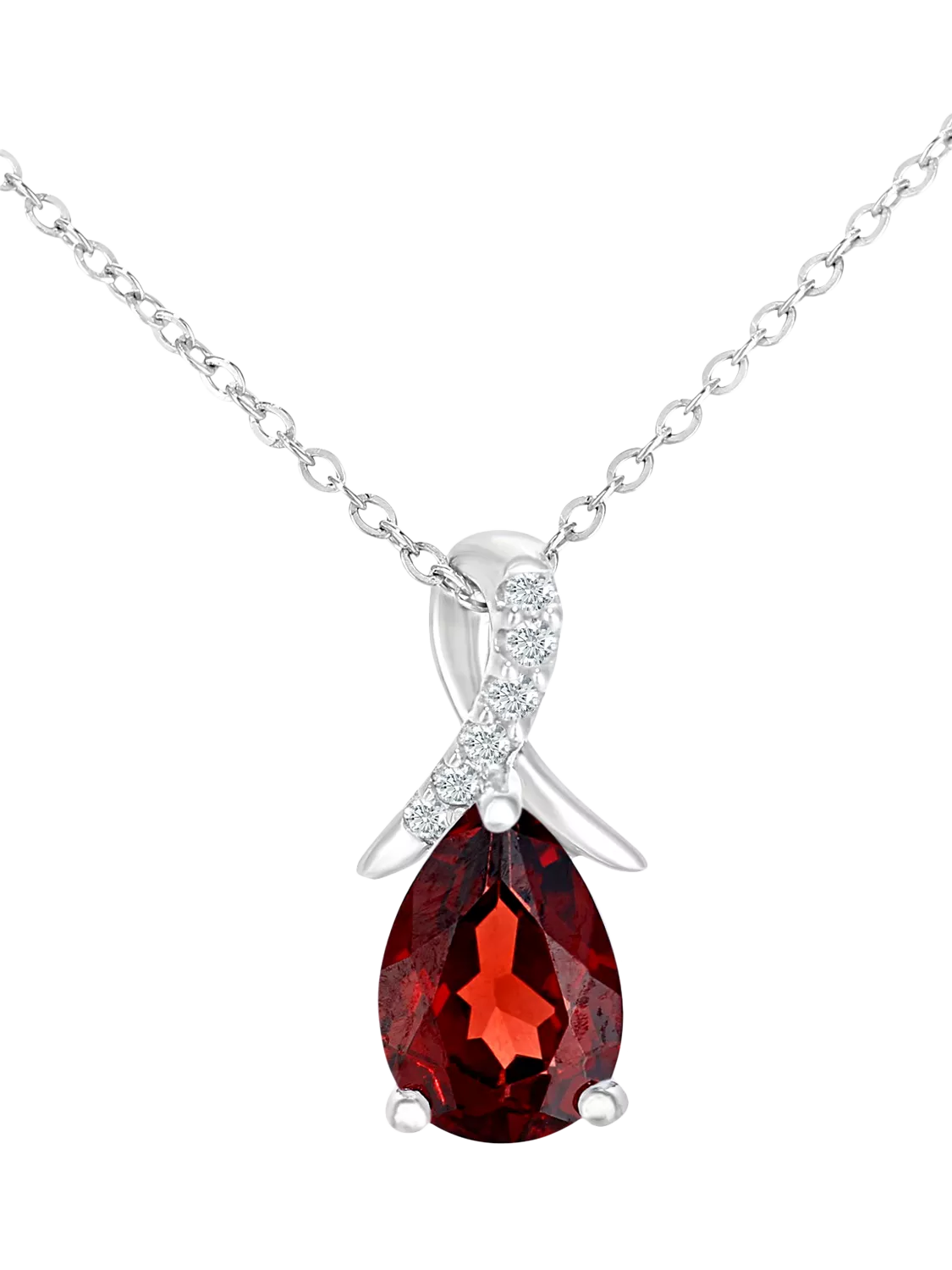 Crafted in 9ct white gold, this elegant pendant features a 7x5mm deep pear-shaped garnet with a total weight of 0.93ct, set within a refined crossover setting. A delicate ribbon of round brilliant-cut diamonds accents the design, enhancing the garnet’s rich, wine-red tone with subtle sparkle. Suspended from an 18-inch white gold chain, this timeless design adds a touch of dramatic elegance to both day and evening looks.