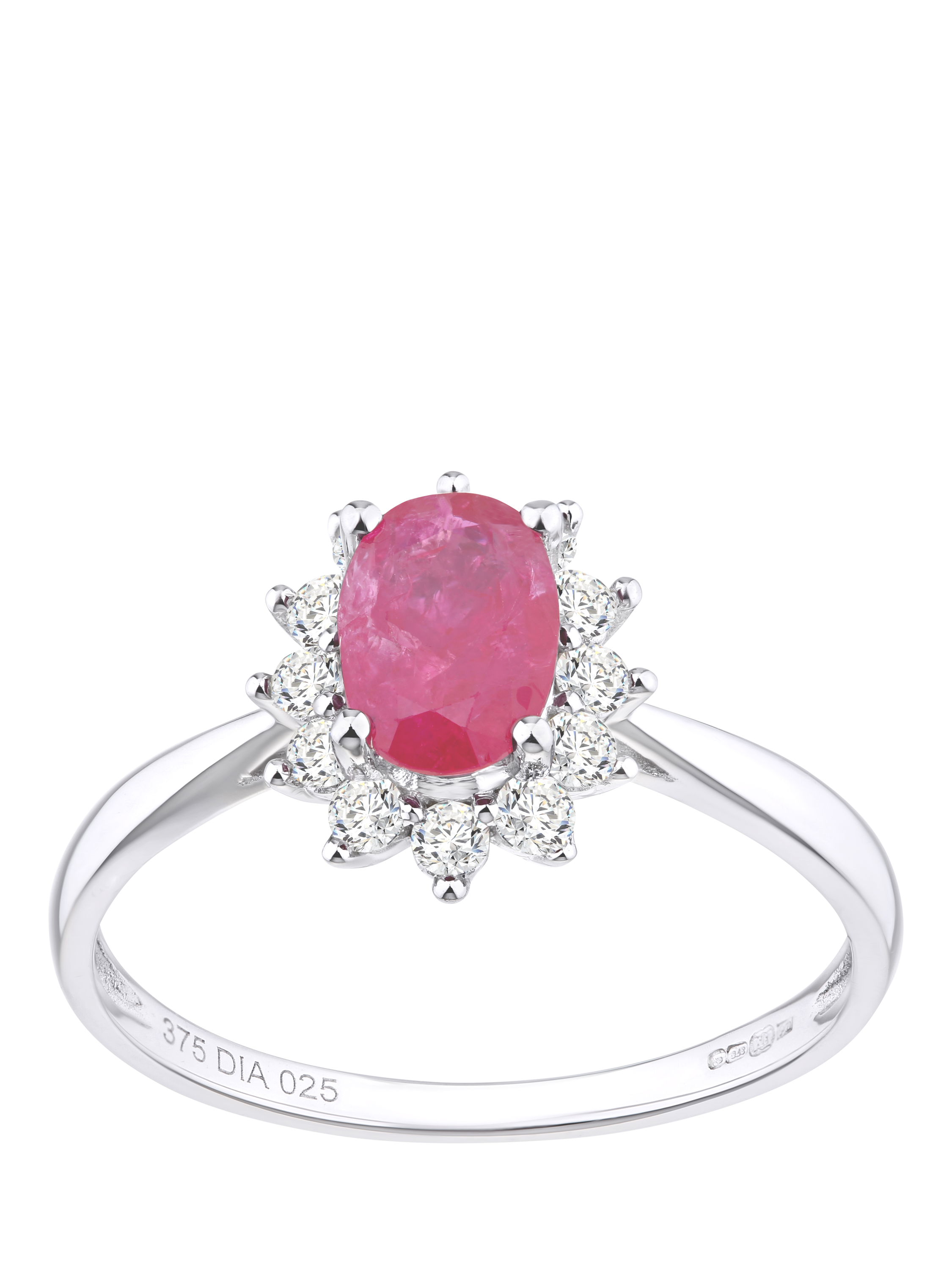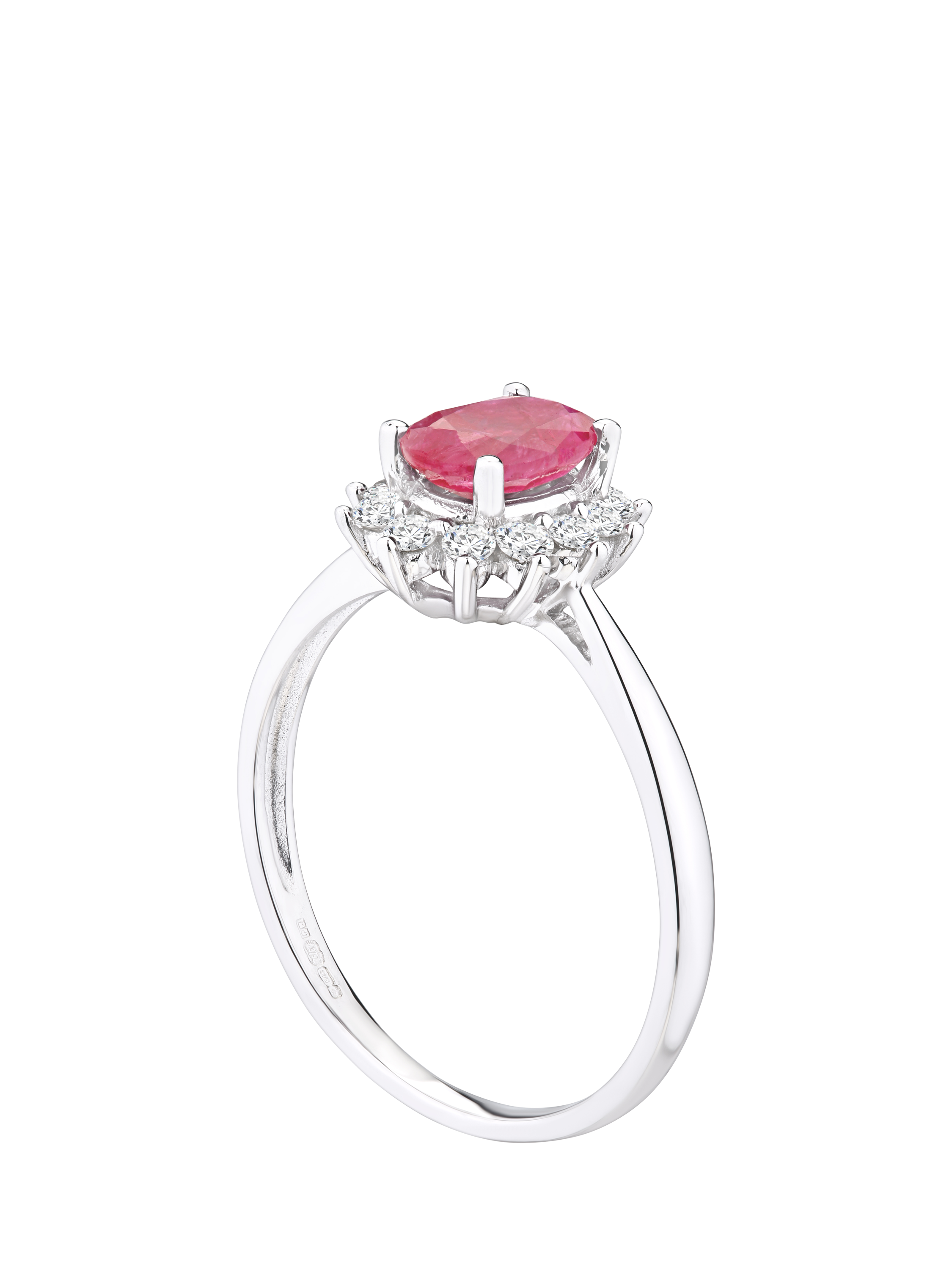 Set in 9ct white gold, this captivating ring showcases a 7x5mm oval ruby with a weight of 1.10 carats, encircled by a shimmering halo of round brilliant-cut diamonds totalling 0.25 carats. The ruby’s deep red hue exudes romance and vitality, perfectly contrasted by the crisp brilliance of the surrounding diamonds. A classic yet bold design, this piece offers timeless glamour and meaningful colour, ideal for marking life’s most special moments or adding a regal touch to everyday wear.
