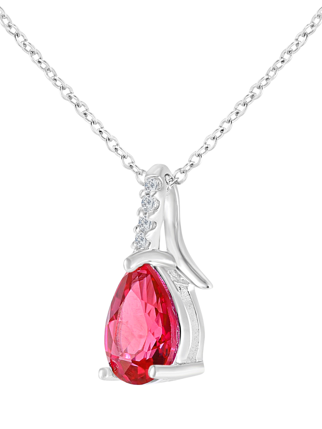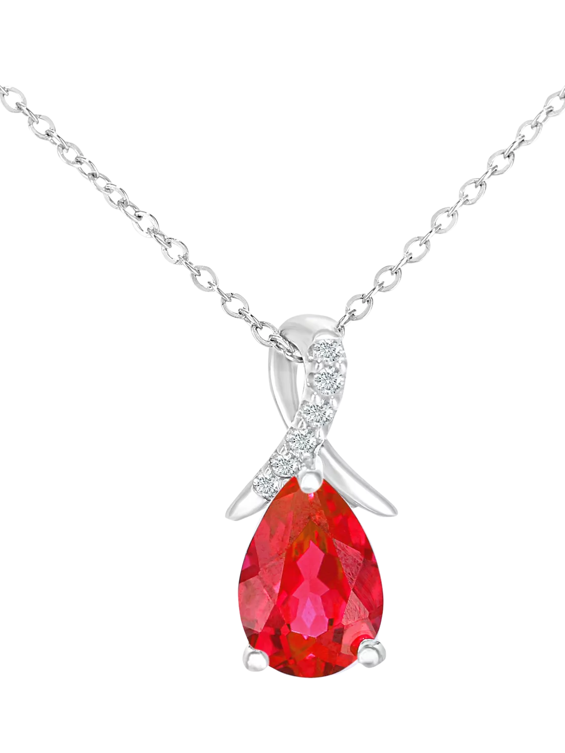 Crafted in 9ct white gold, this elegant pendant features a rich 7x5mm pear-shaped lab-created ruby with a total weight of 0.88ct, set within a refined crossover design. A ribbon of round brilliant-cut diamonds gently curves around the stone, highlighting its red hue with subtle brilliance. Suspended from an 18-inch white gold chain, this timeless piece blends fluid lines with classic glamour—ideal for both everyday elegance and evening occasions.