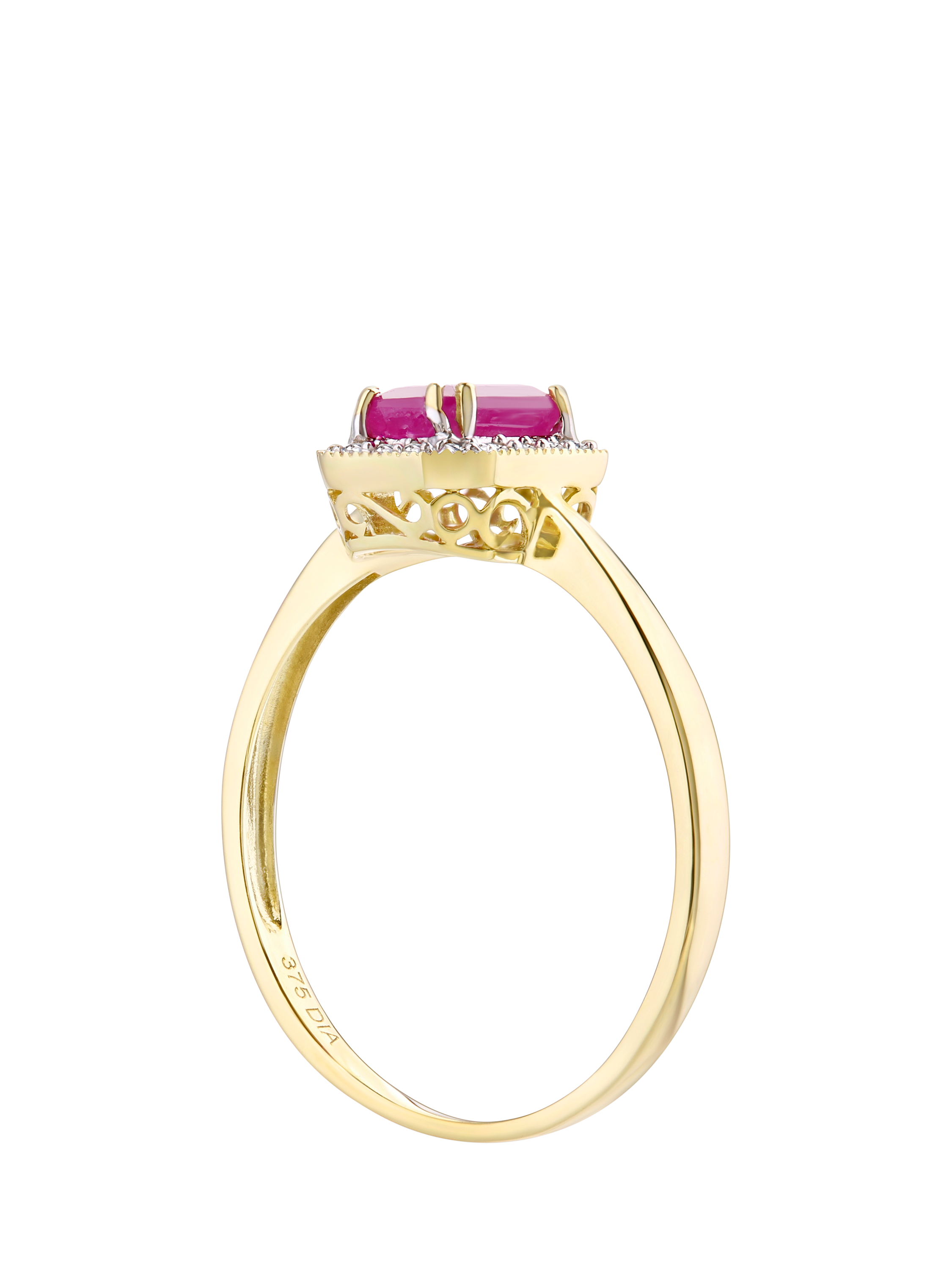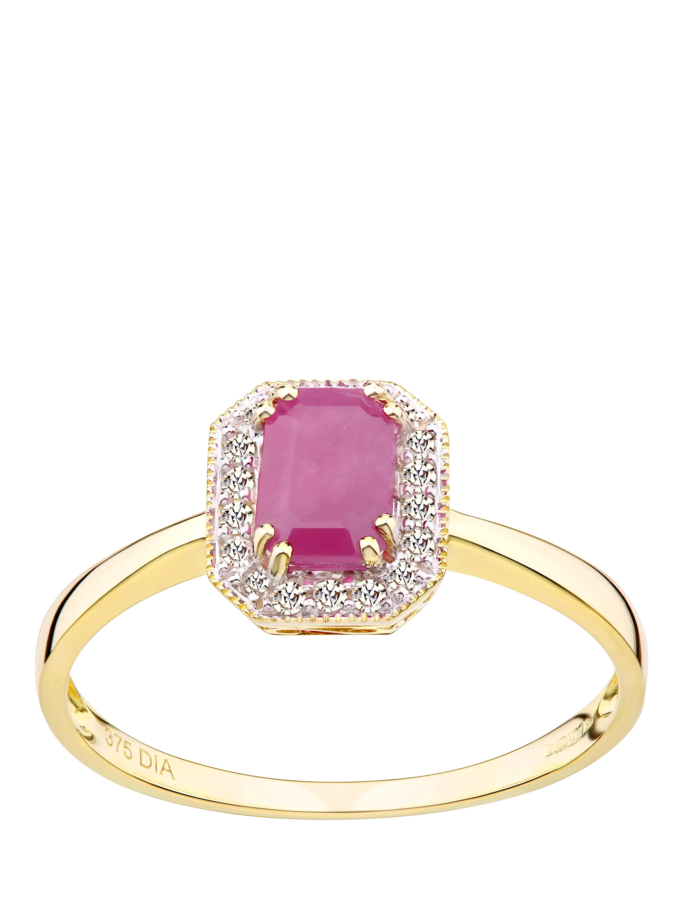 Rich in colour and meaning, this ring is crafted in 9ct yellow gold and features a vivid 6x4mm octagon-cut ruby with a total weight of 0.65ct. Surrounded by 0.08ct of brilliant-cut diamonds, the ruby’s passionate red hue is beautifully offset by the soft sparkle and golden setting. A bold and elegant piece perfect for celebrating love and milestones.