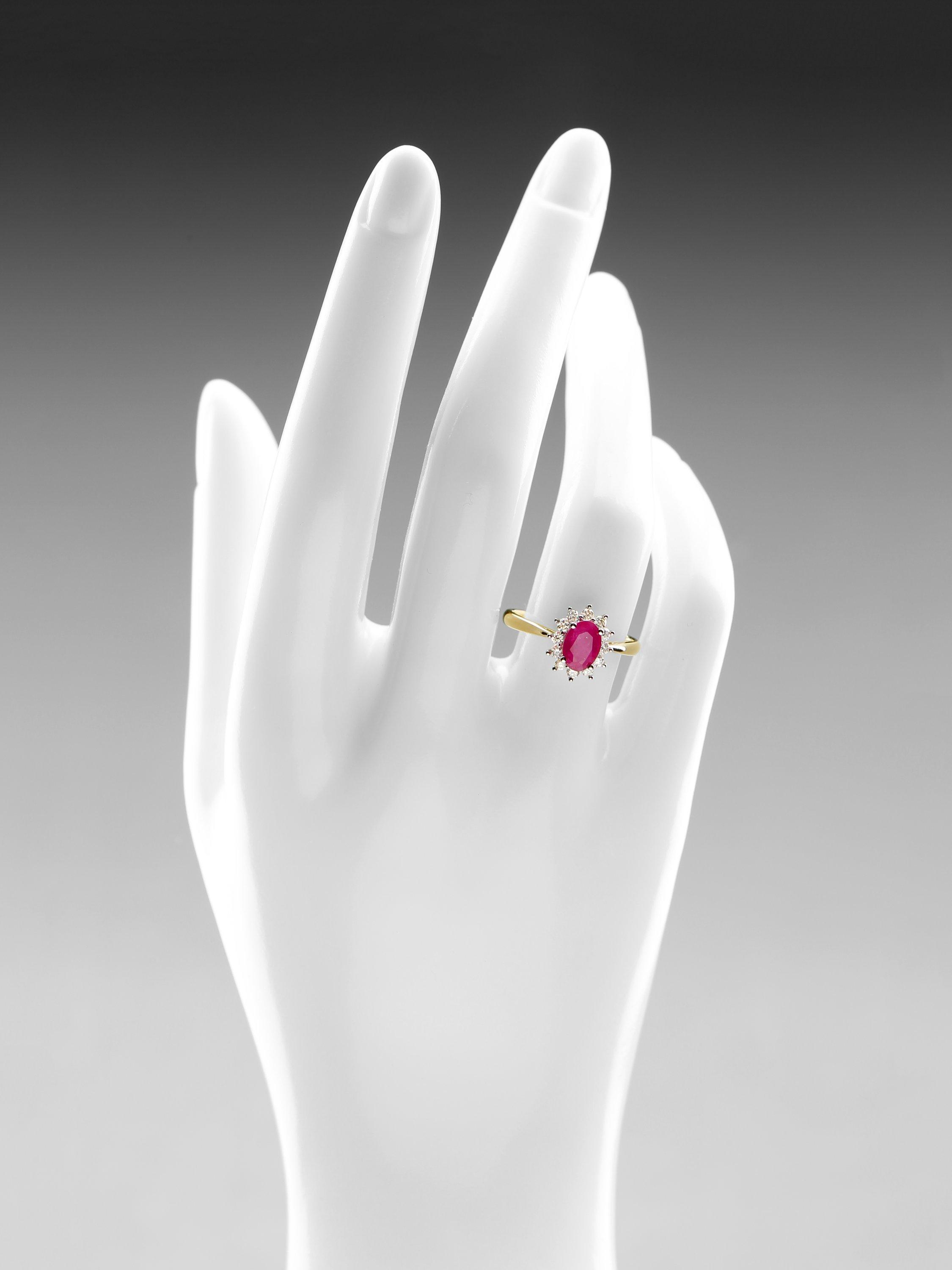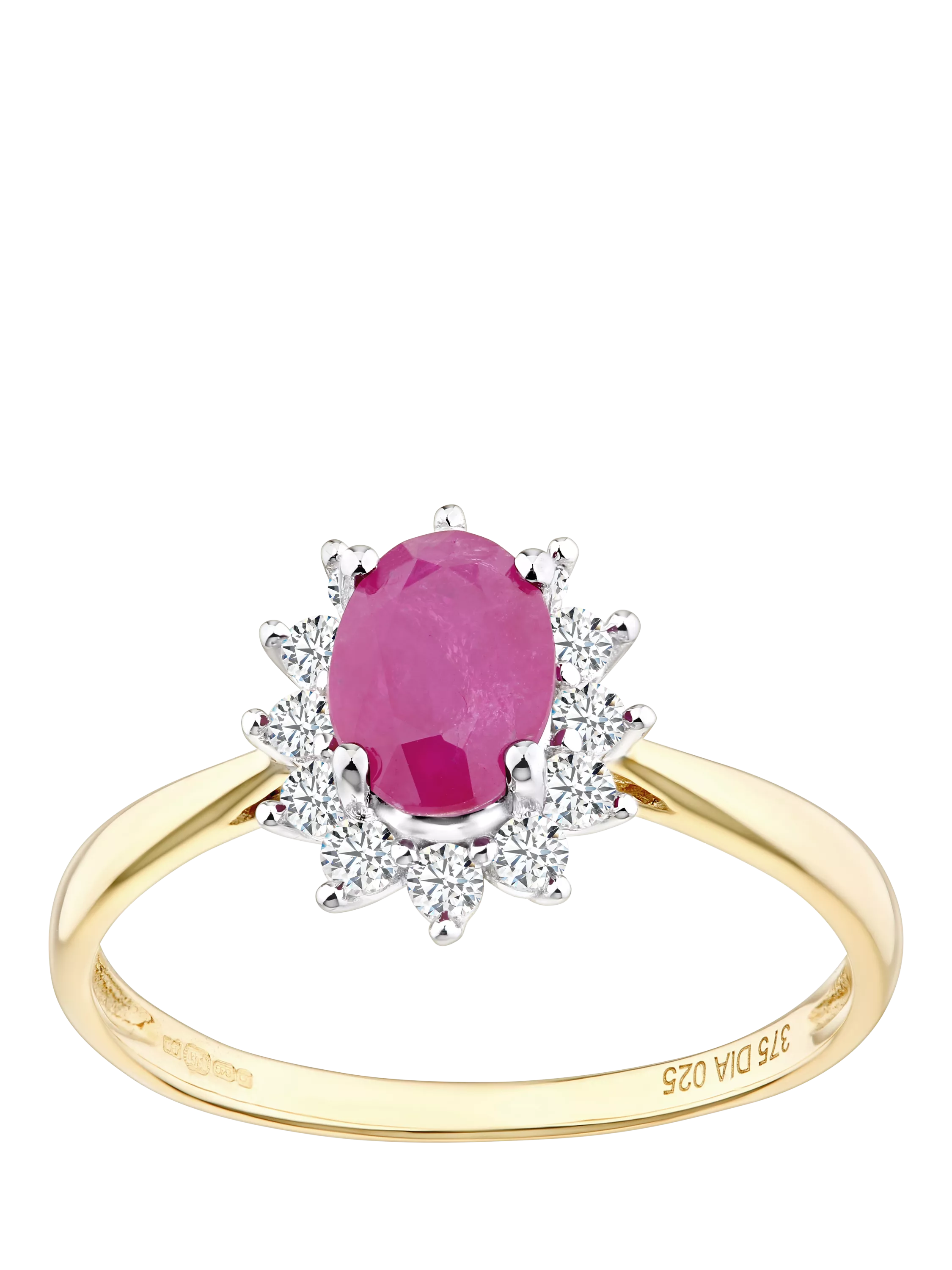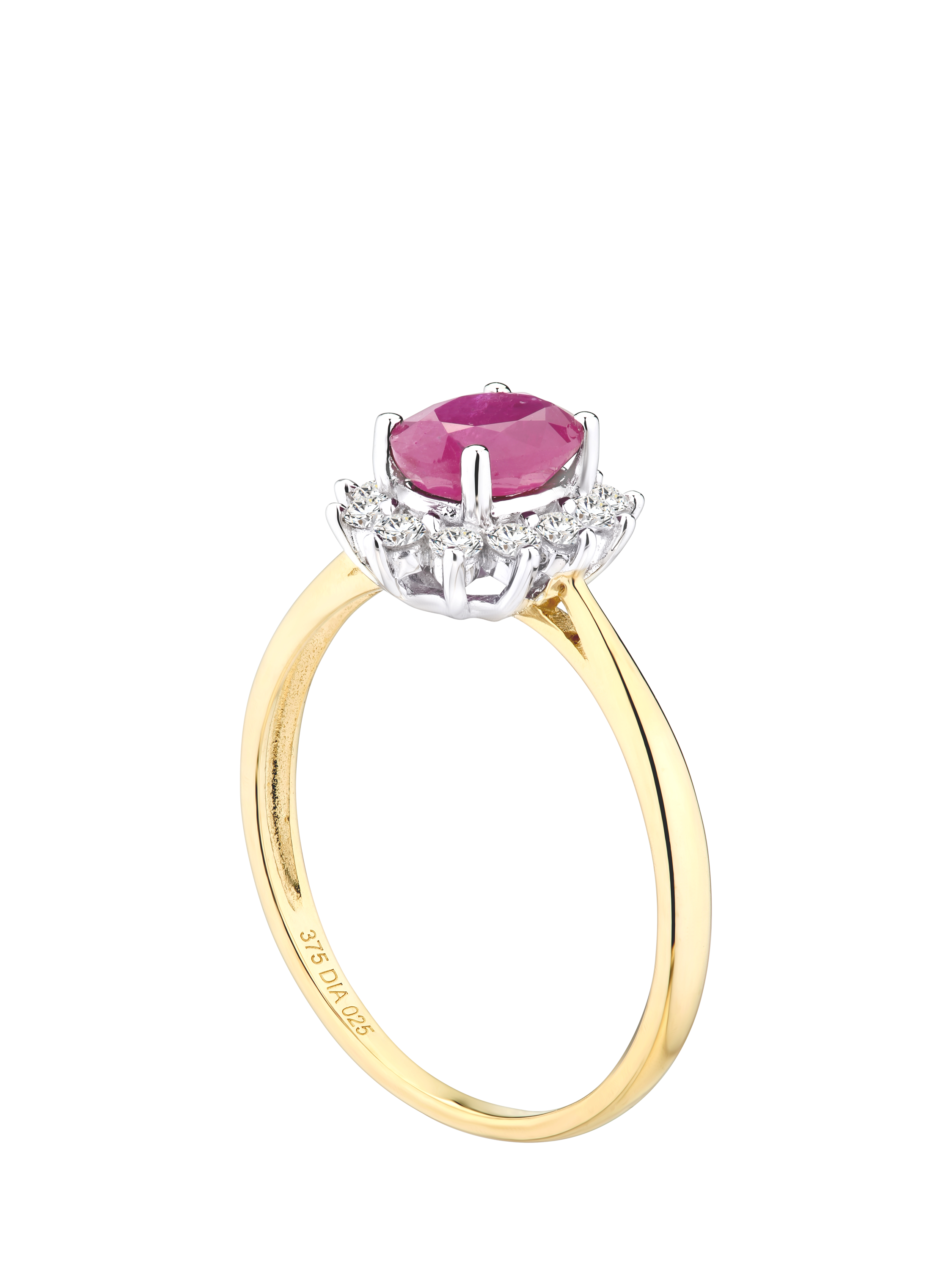 This stunning ring is crafted in 9ct yellow gold and features a striking 7x5mm oval ruby weighing 1.10 carats, encircled by a halo of round brilliant-cut diamonds with a total weight of 0.25 carats. The intense red hue of the ruby is enriched by the warmth of the yellow gold setting and complemented by the brilliance of the surrounding diamonds. A perfect fusion of elegance and passion, this ring is ideal for romantic milestones or simply adding a pop of timeless colour to everyday wear.