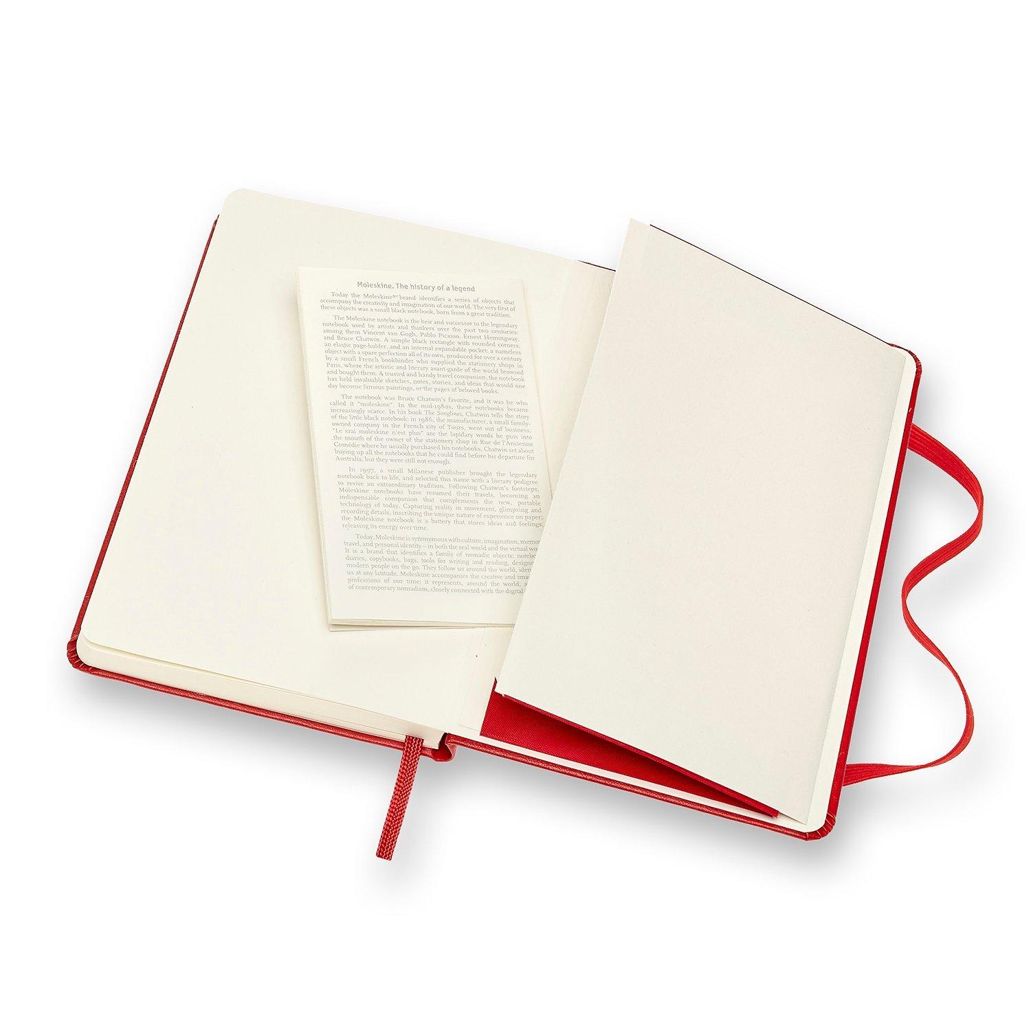 The 192 acid-free pages are thread bound, and the notebook includes an expandable inner note holder made of cardboard and cloth. Each Moleskine journal has a ribbon placeholder and removable card with the history of Moleskines.