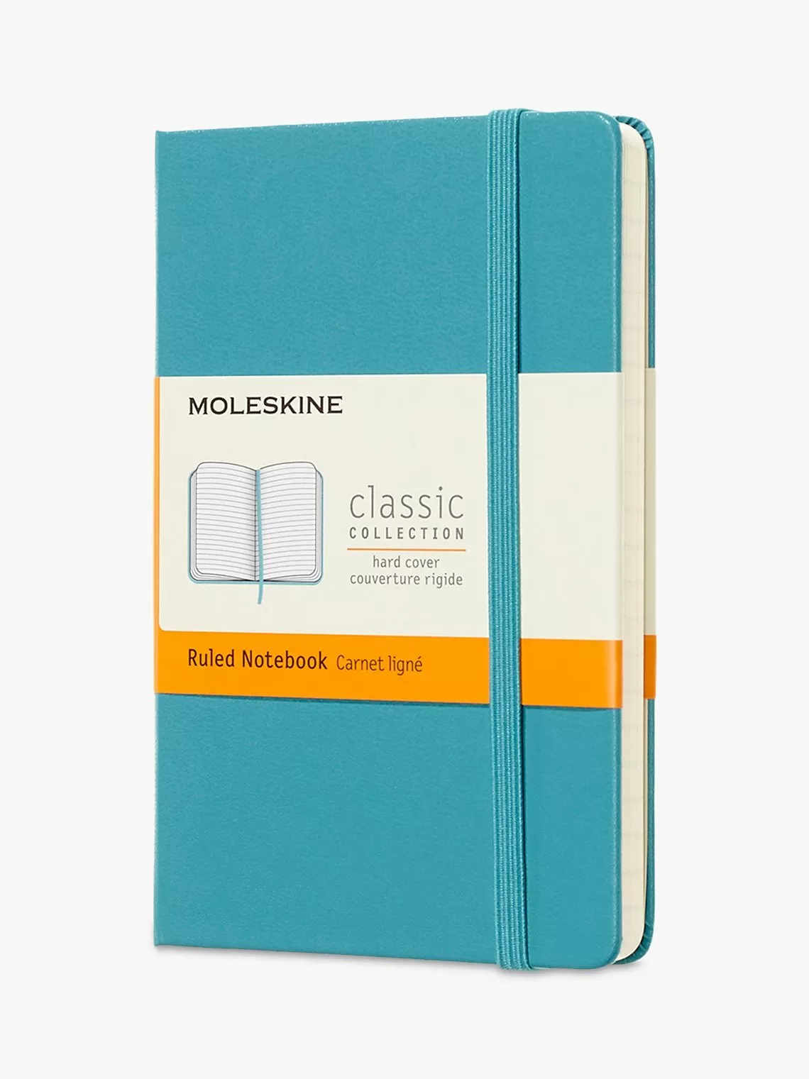 This Moleskine Pocket Ruled Notebook is bound in cardboard, with a 'moleskine' cover having rounded corners and an elastic enclosure.