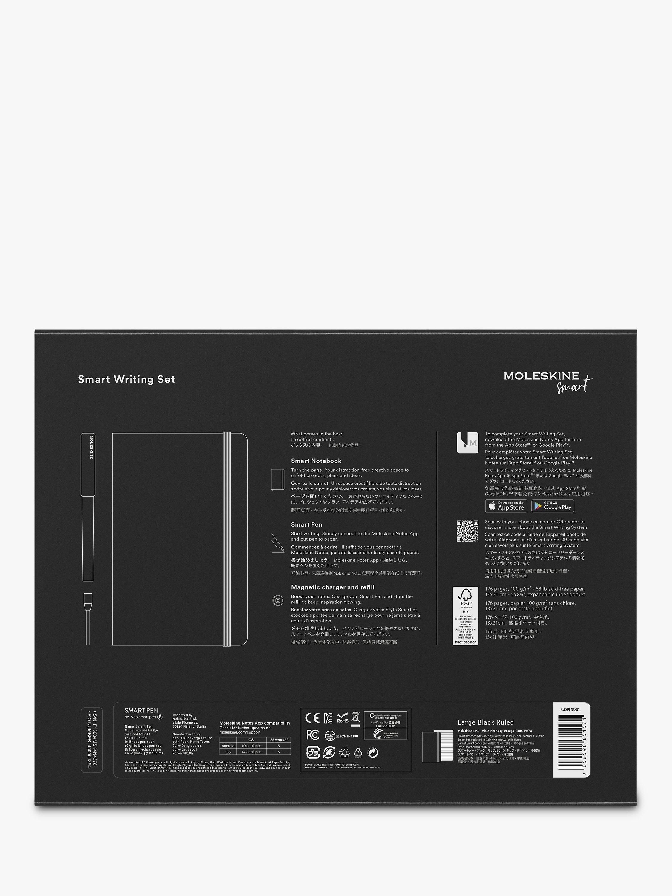 At the heart of the Smart Writing Set is the Smart Notebook with its classic Moleskine shape and ivory coloured pages, along with the redesigned Smart Pen and Notes App. With an instant digital copy of every page, these tools amplify the benefits of handwriting and help take your projects to the next level.