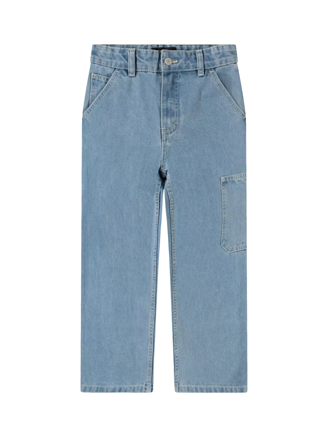 Workwear-inspired denim jeans in a cotton blend. The jeans have belt loops, side pockets, back pockets and workwear-details. They are in a loose fit and their waistband has an elastic so they can be adjusted so they fit most children. It also means that a child can wear the jeans longer.