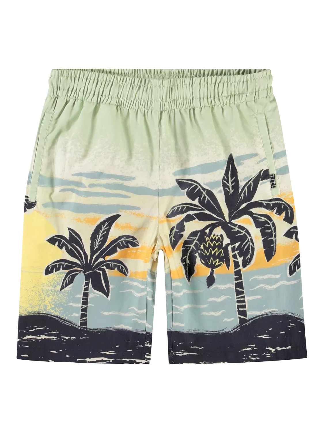 Knee length shorts in 100% organic cotton with a placement print. The shorts have an elastic waist with an inner drawstring, side pockets, and they are in a regular fit.