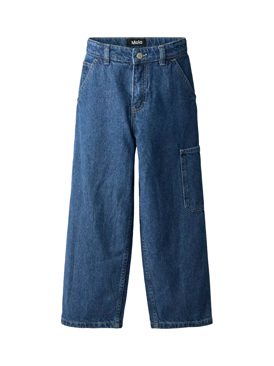 These blue cotton jeans from Molo have workwear details and practical pockets along the legs and on the sides. The waist can be adjusted with an internal elastic for optimal fit for all children.