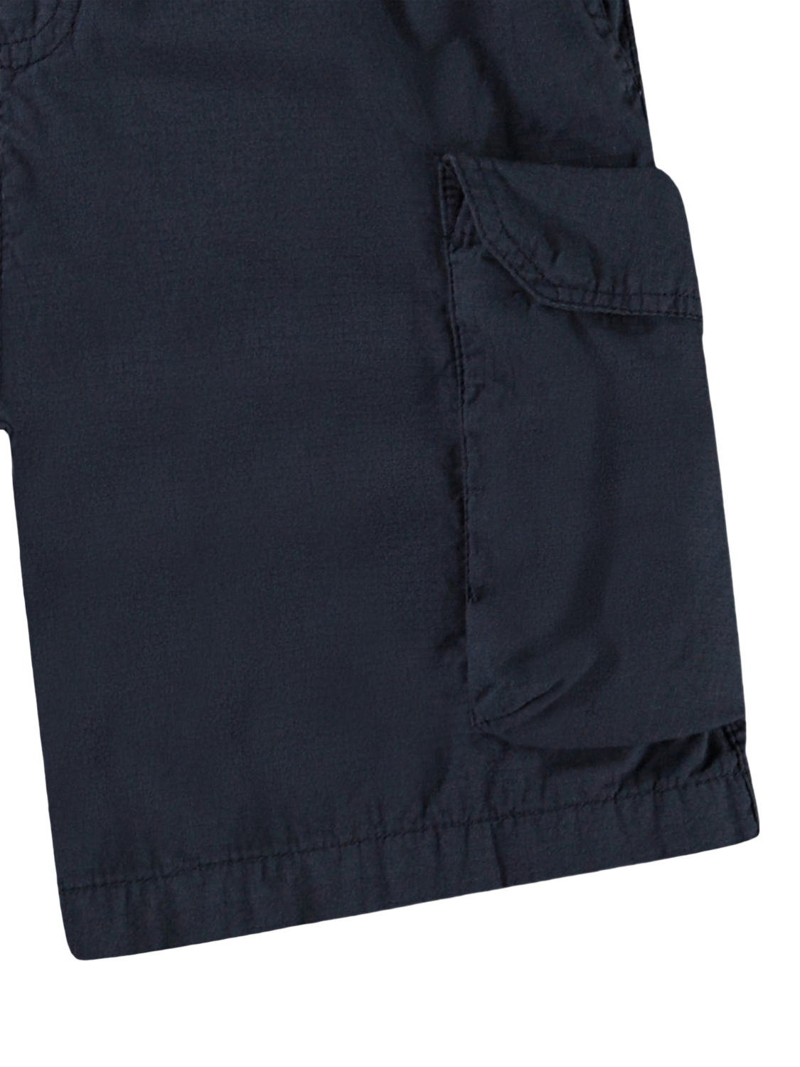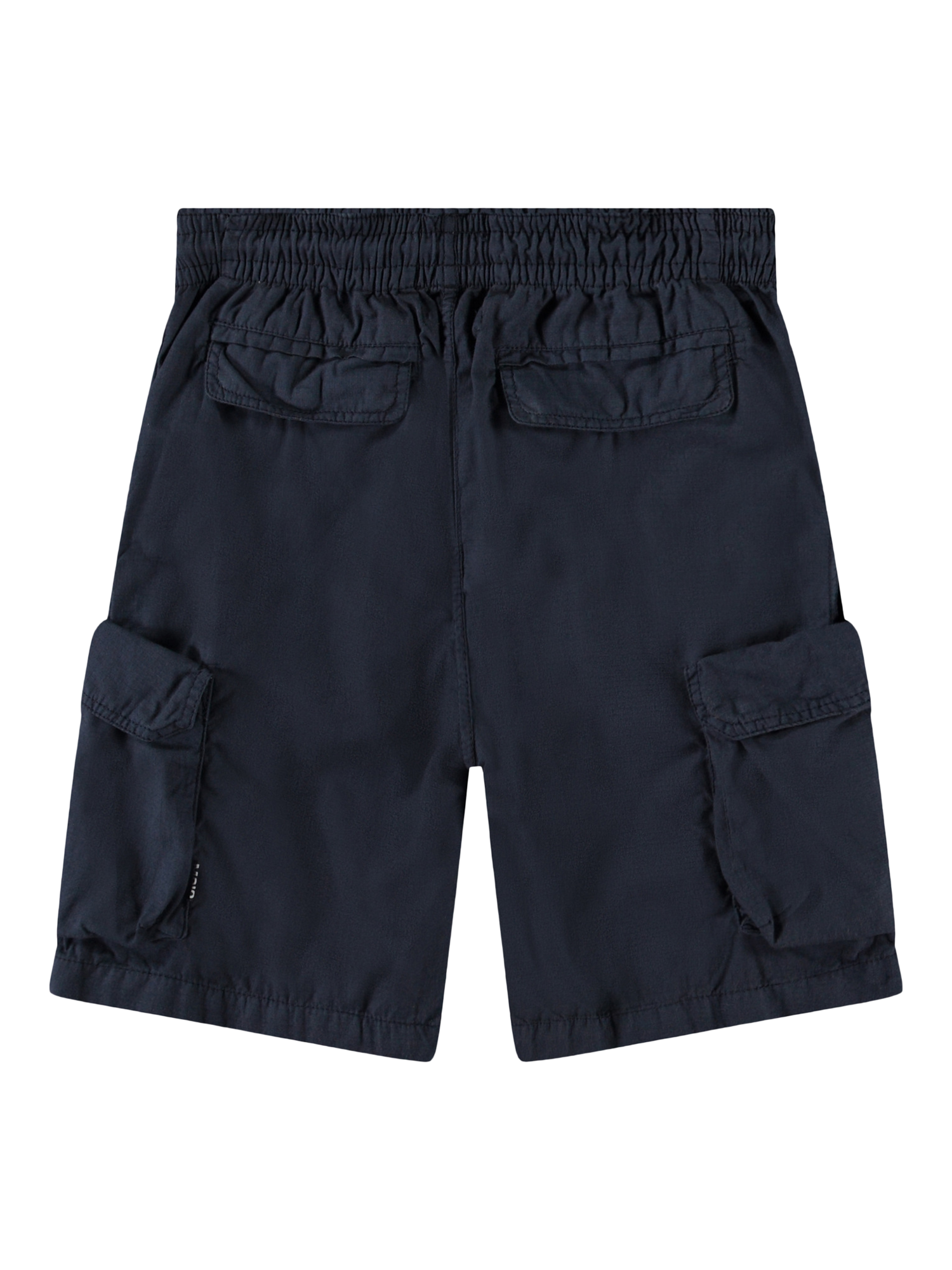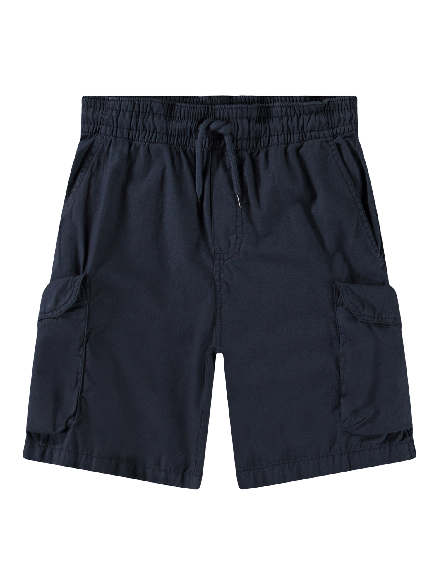 Pair of blue cargo shorts with large cargo pockets on the sides of both legs. Argod has two back pockets with flaps and elastic with ties at the waist.