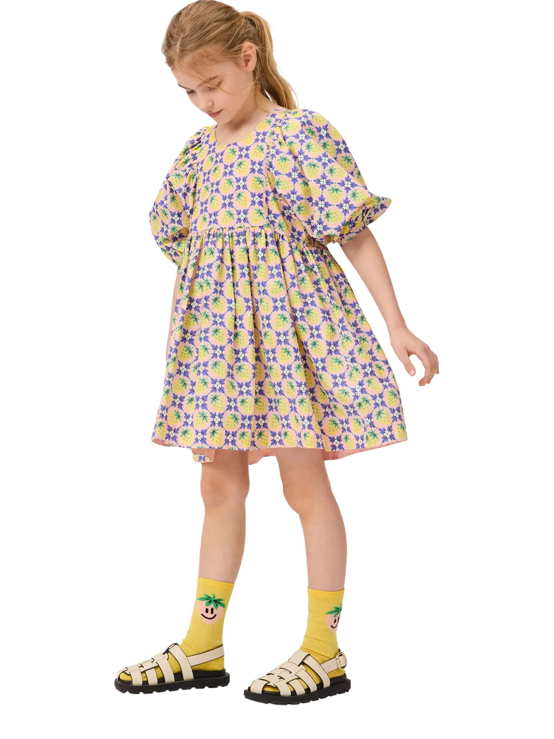 Loose fit dress in organic cotton. The top has a round neck top with 3/4 length sleeves that have a small button closure on the back. The dress has a seam at the waist with a full, gathered skirt. The zip back closure makes the dress easy to slip on and off.