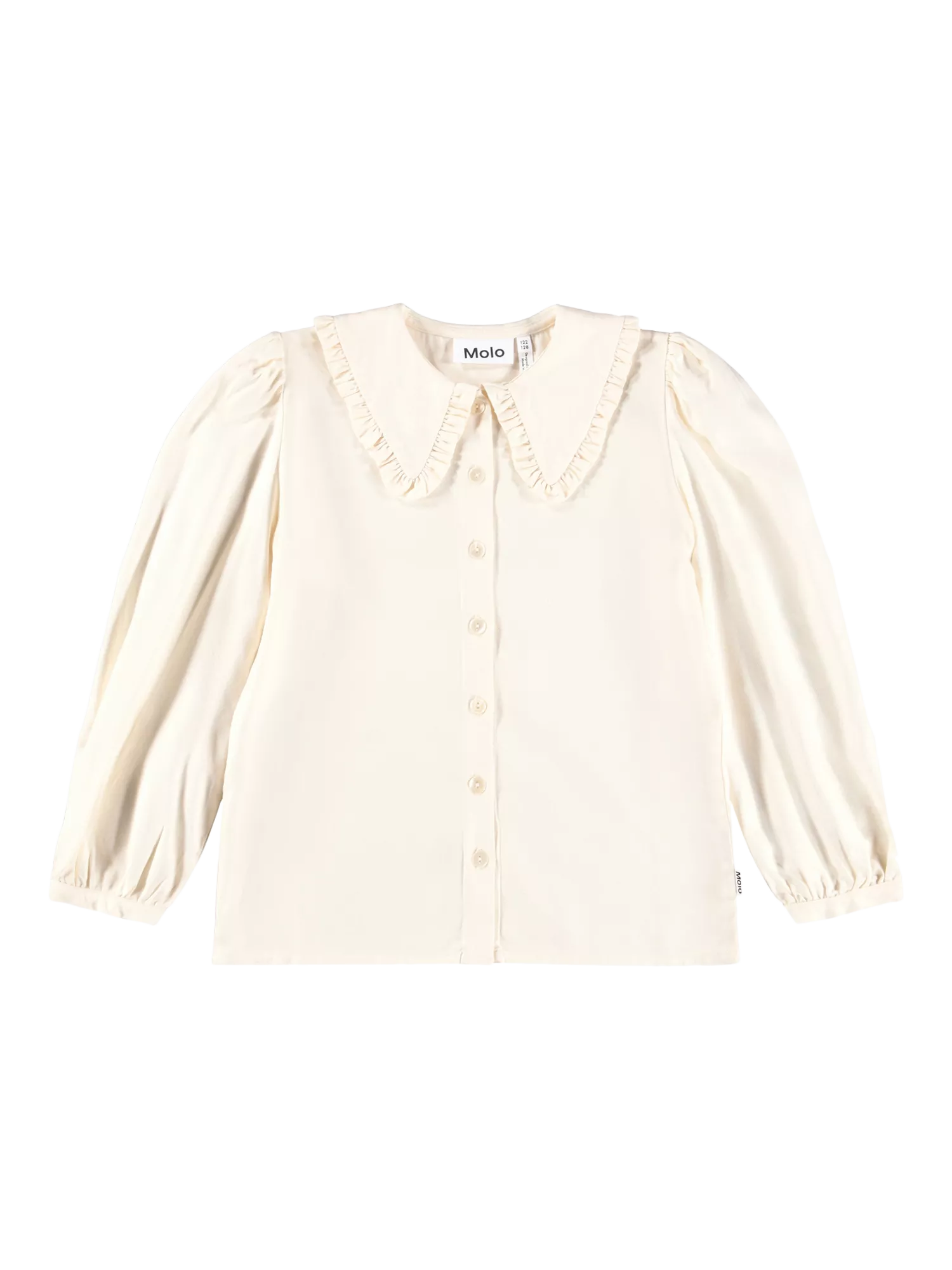 This cream-colored shirt from Molo is made of soft and comfortable viscose. The shirt features a classic Peter Pan collar with decorative ruffles, long voluminous sleeves with narrow cuffs, and a front button closure with white buttons.