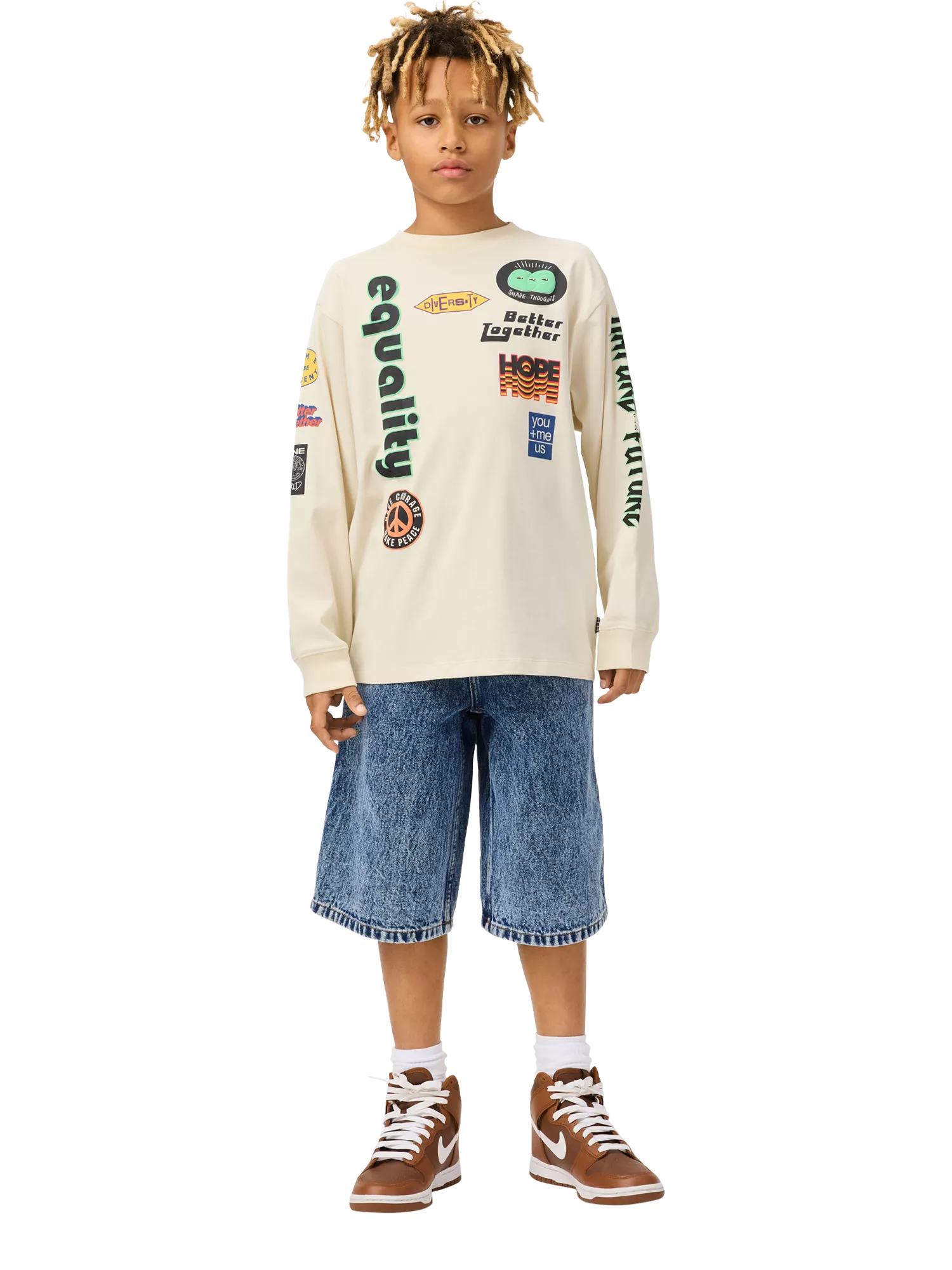 Off-white top in organic cotton with long sleeves, round neckline, ribbed trim at the neckline and sleeves. The top has a loose fit with a multicoloured all-over print.