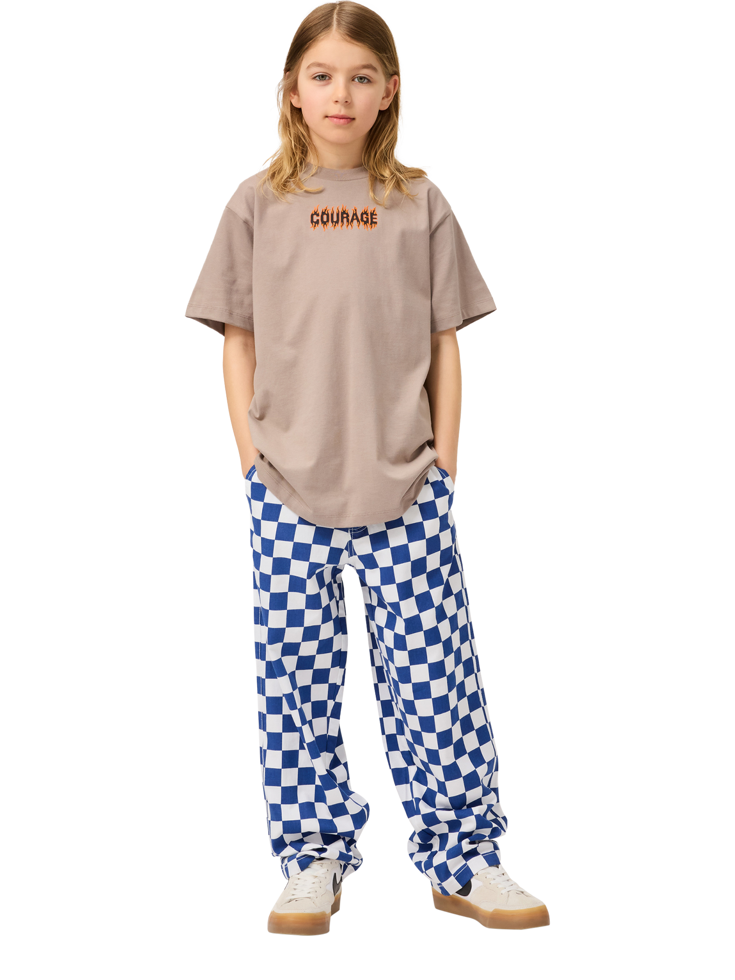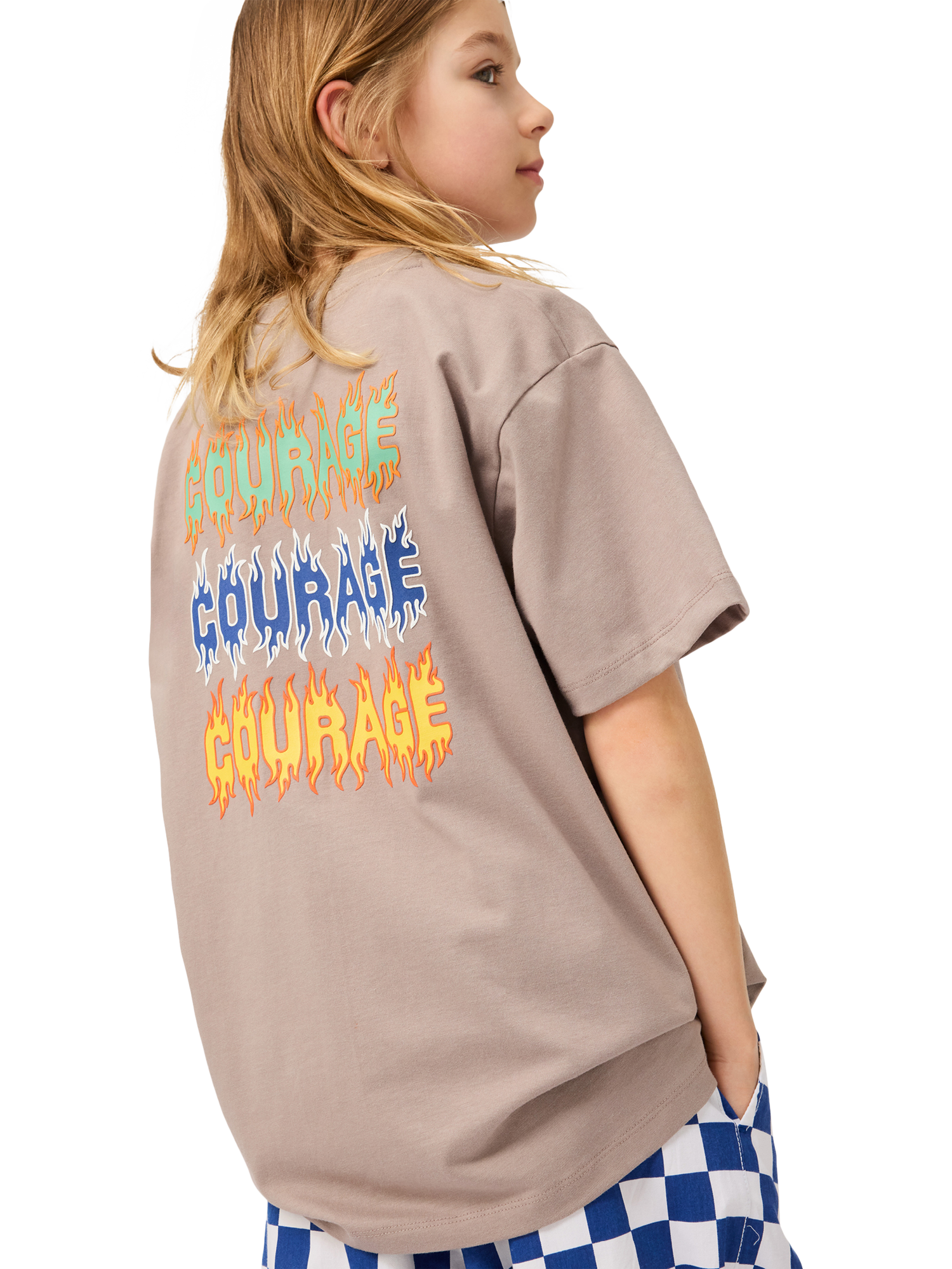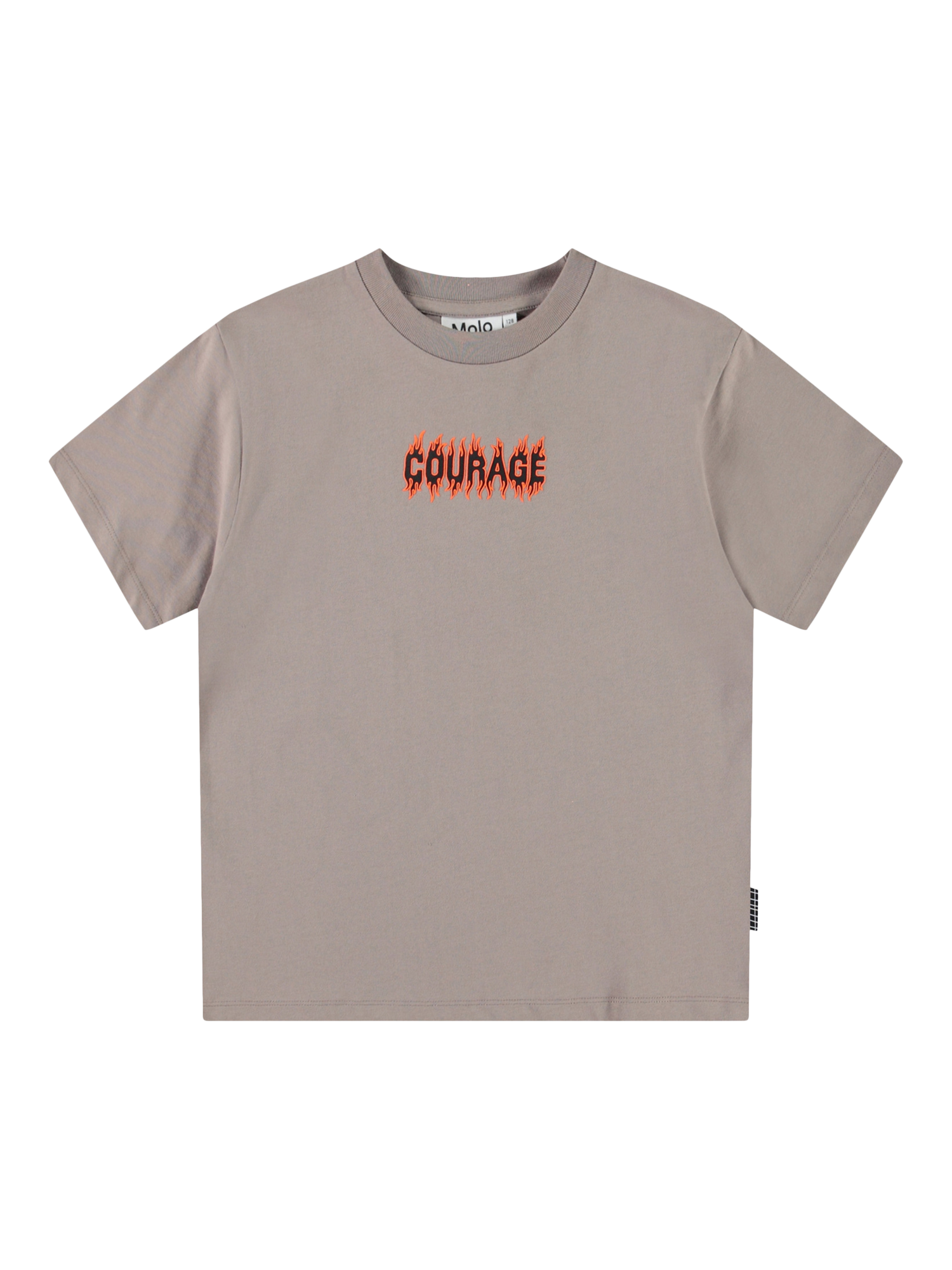 The t-shirt has a round neck with a rib edge and is in a loose fit.