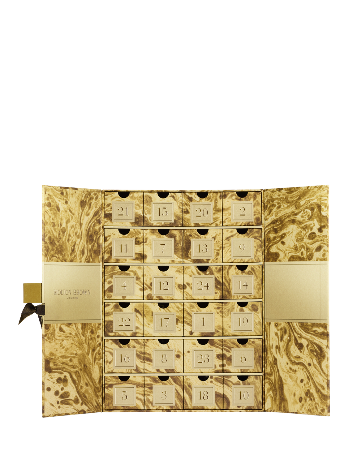 Kick off the Christmas festivities with our highly anticipated Advent Calendar, decorated by marble artist Natascha Maksimovic; 24 fragrant luxuries hiding behind mesmerising swirls and finished with a sophisticated Molton Brown plaque and ribbon.