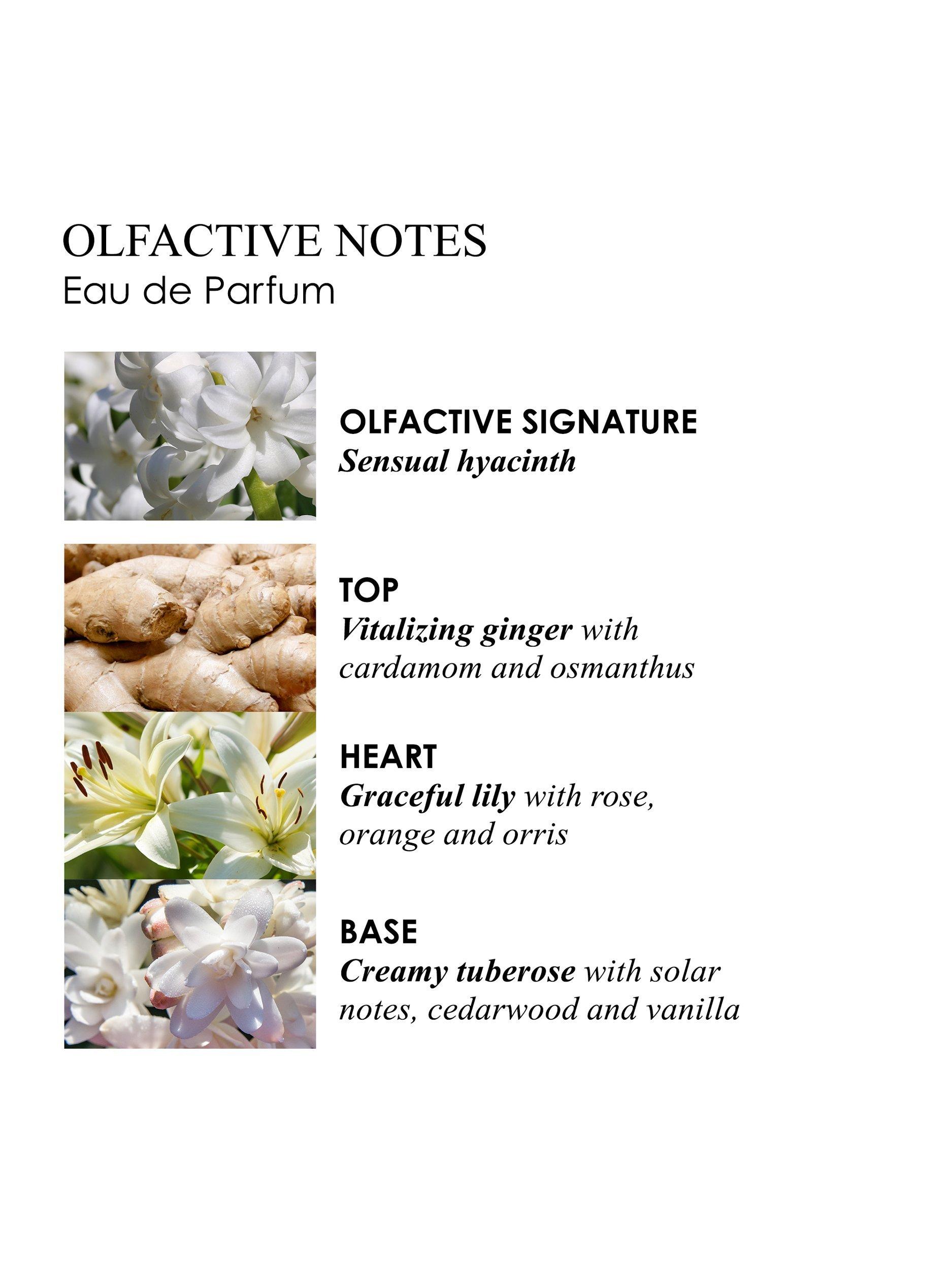 Entice the senses with the delicately floral notes of this alluring eau de parfum. Fresh ginger and cardamom intermingle with tuberose and lily, deepened with an olfactive signature of hyacinth.