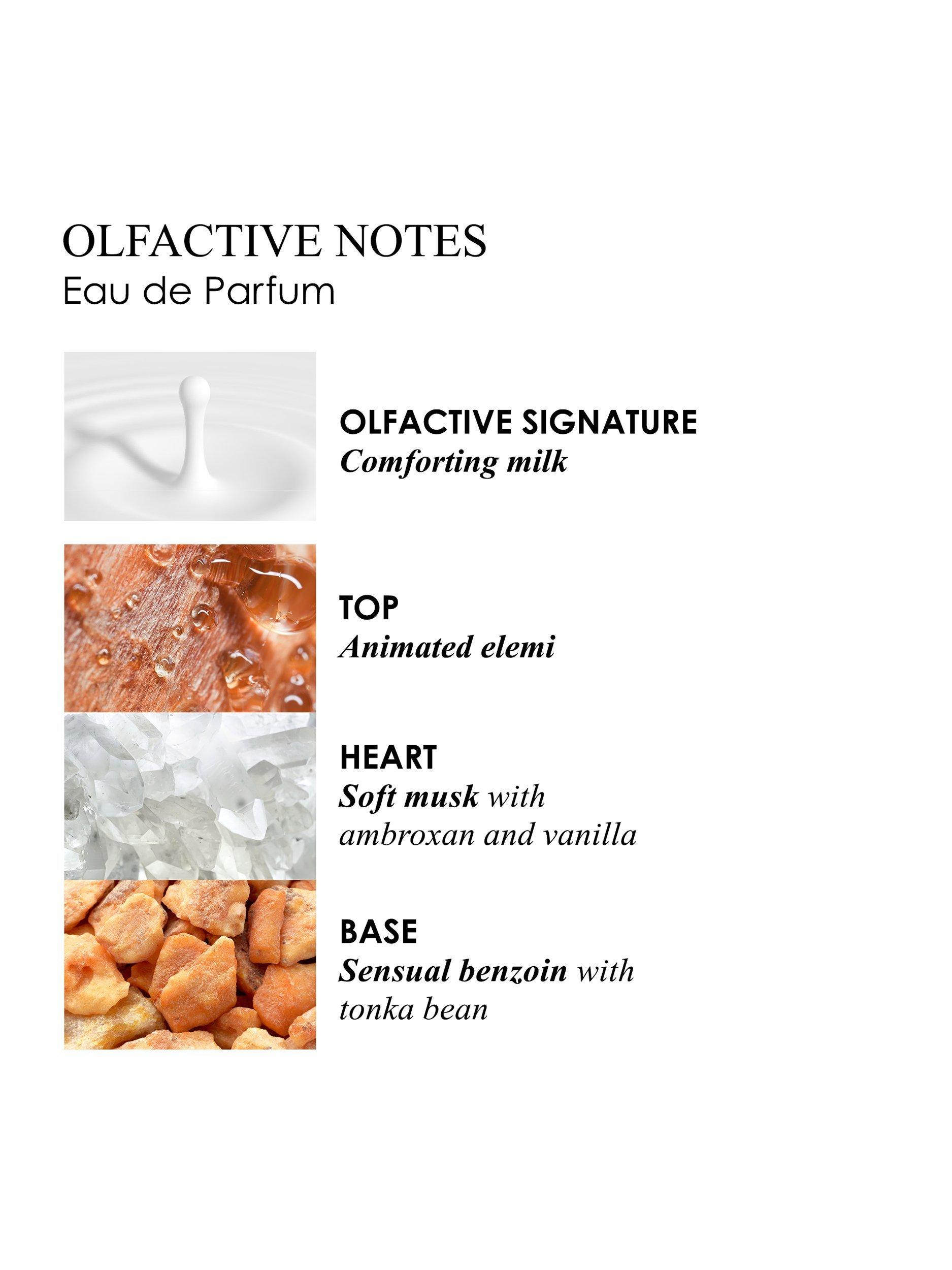 Seek cocooning tranquillity in this Eau de Parfum, a comforting balance of enlivening elemi, soothing musk and sensual benzoin.