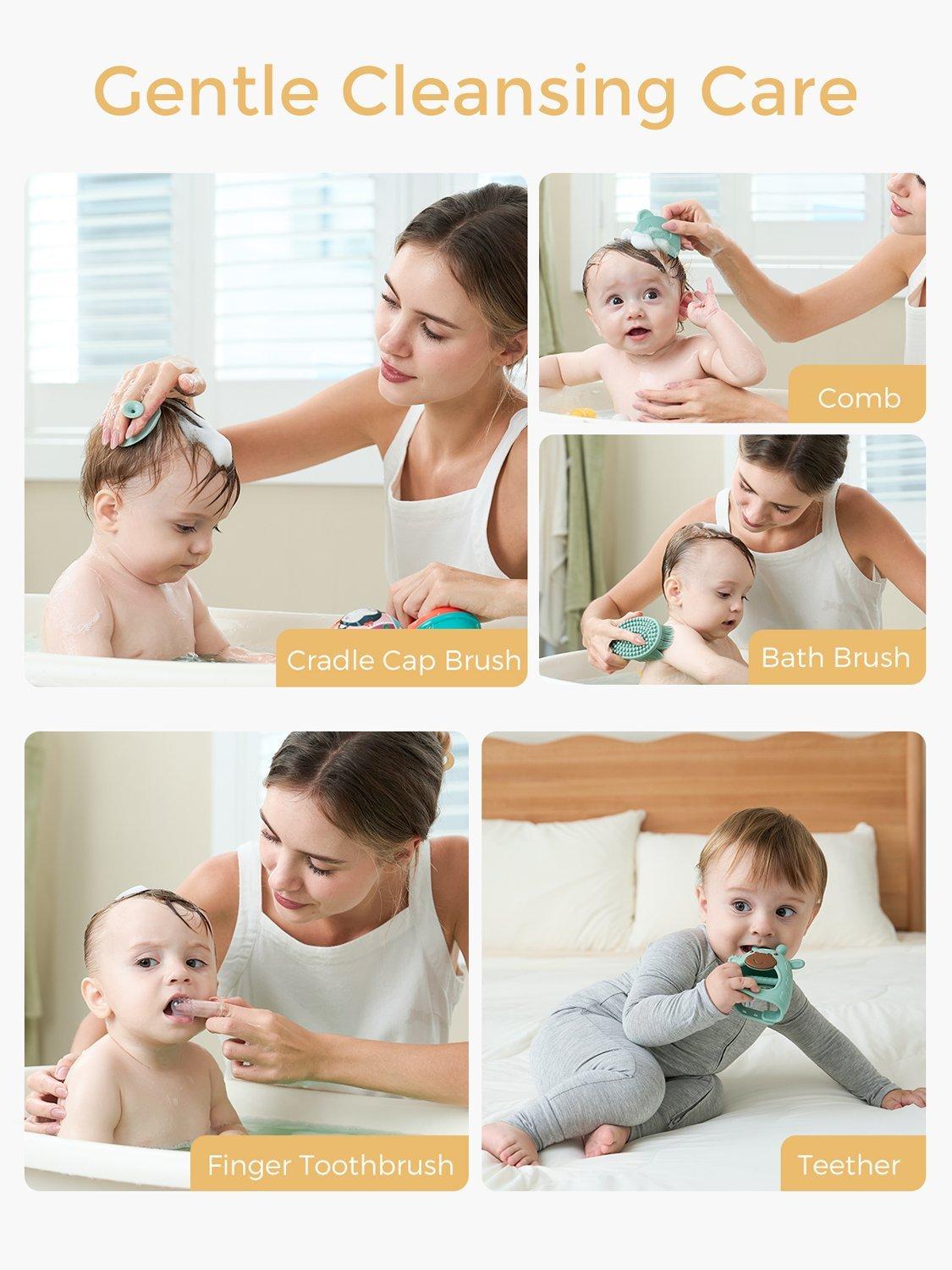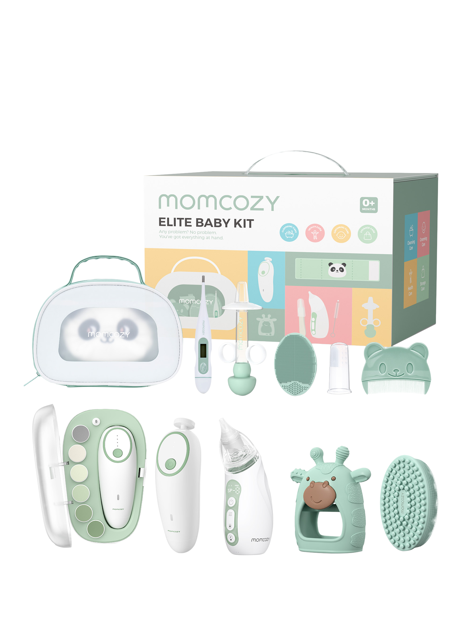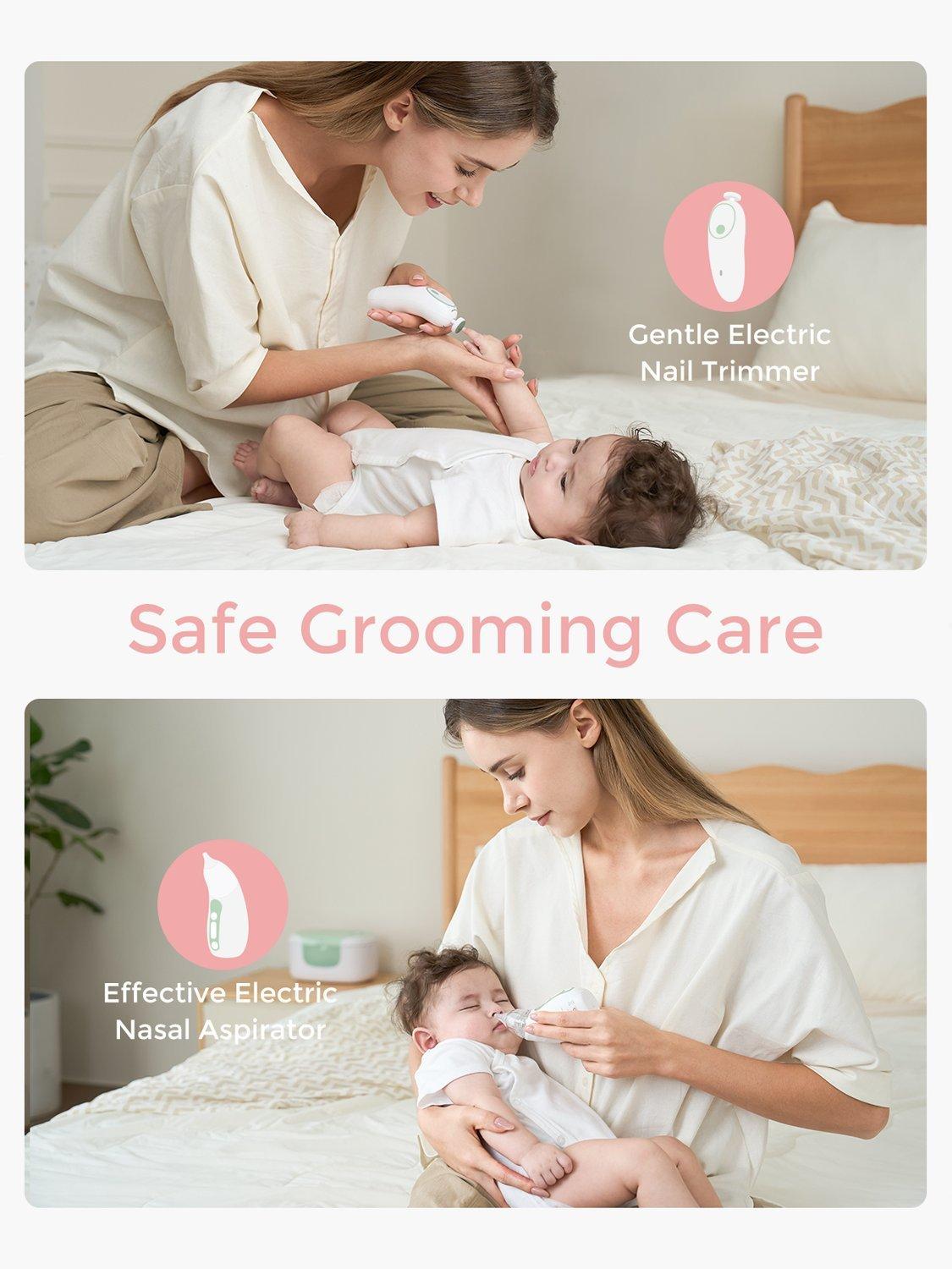 This all-in-1 kit covers 3 main baby care scenarios: grooming, health, and cleansing. It includes an electric nail trimmer, electric nasal aspirator, heated tummy wrap, thermometer, medicine pacifier, bath brush, cradle cap brush, teether, finger toothbrush, and comb.