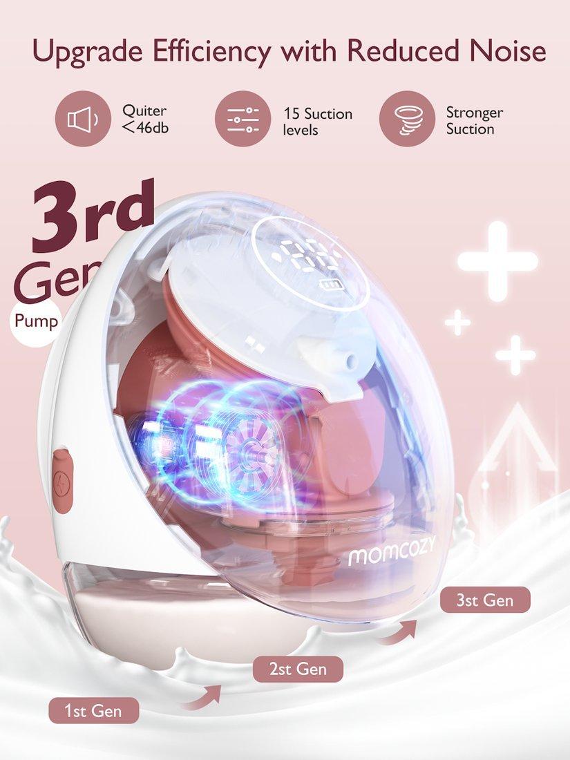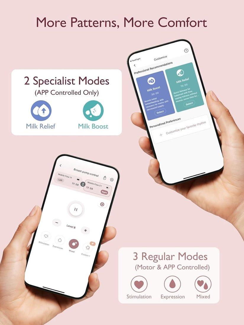 Experience effortless and discreet breastfeeding with the Momcozy Mobile Flow breast pump. This smart device offers hands-free control through the "Momcozy" app, allowing you to start, pause, and customize your pumping session without any inconvenience. Track your milk output history for a personalized pumping journey. Enjoy a quieter, more efficient pumping with our 3rd Gen Pump, featuring 15 adjustable suction levels for maximum comfort. Choose from various modes, including Stimulation, Expression, Mixed, and two Specialist Modes—Milk Relief and Milk Boost — to find your perfect rhythm.