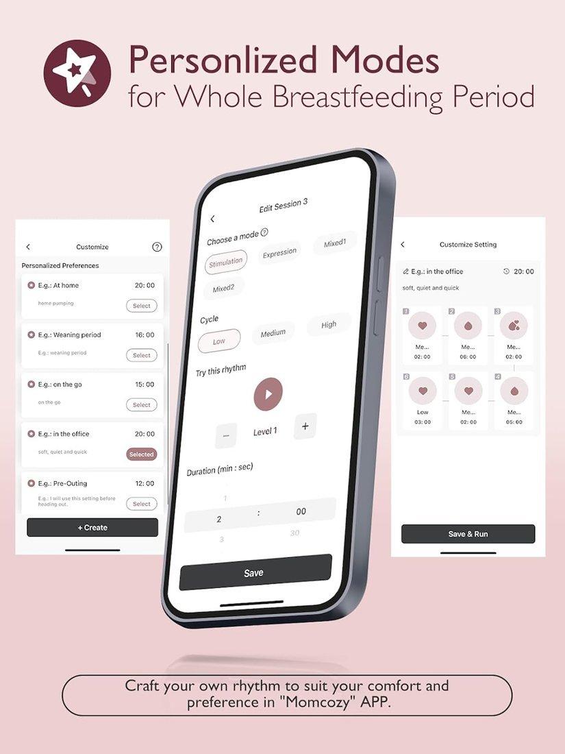 Experience effortless and discreet breastfeeding with the Momcozy Mobile Flow breast pump. This smart device offers hands-free control through the "Momcozy" app, allowing you to start, pause, and customize your pumping session without any inconvenience. Track your milk output history for a personalized pumping journey. Enjoy a quieter, more efficient pumping with our 3rd Gen Pump, featuring 15 adjustable suction levels for maximum comfort. Choose from various modes, including Stimulation, Expression, Mixed, and two Specialist Modes—Milk Relief and Milk Boost — to find your perfect rhythm.