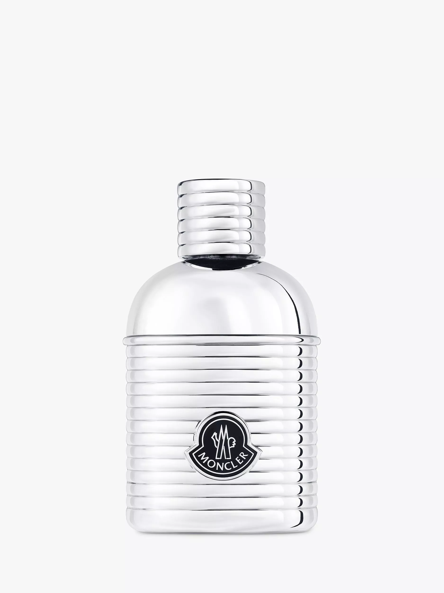 The Moncler Pour Homme fragrance is showcased in a unique 'borraccia' flask-shaped bottle encircled with a ribbed silver case and cap - a utilitarian echo to Moncler's mountaineering origins and the iconic quilted construction of a Moncler jacket.