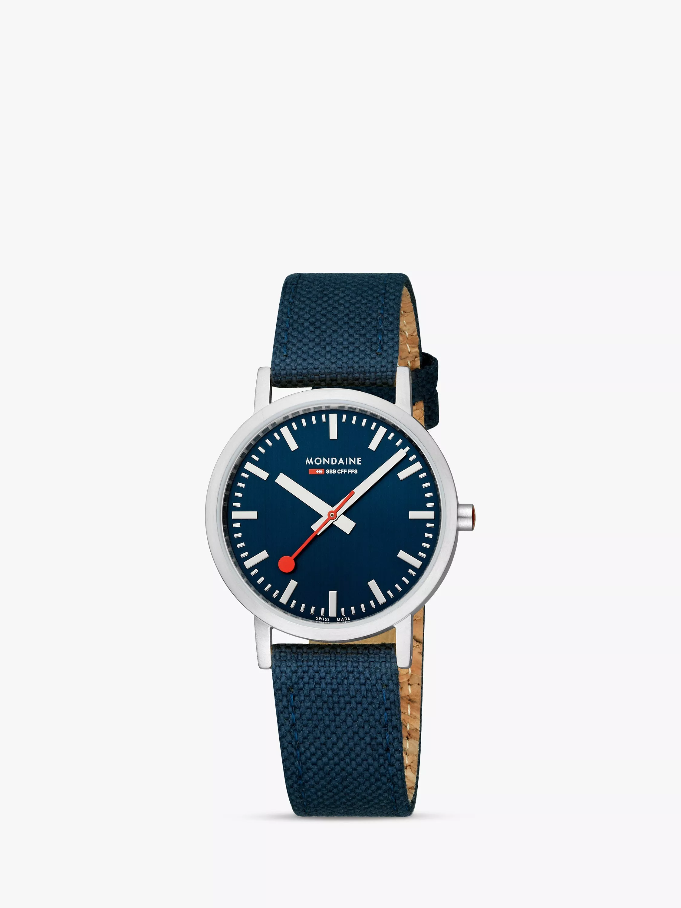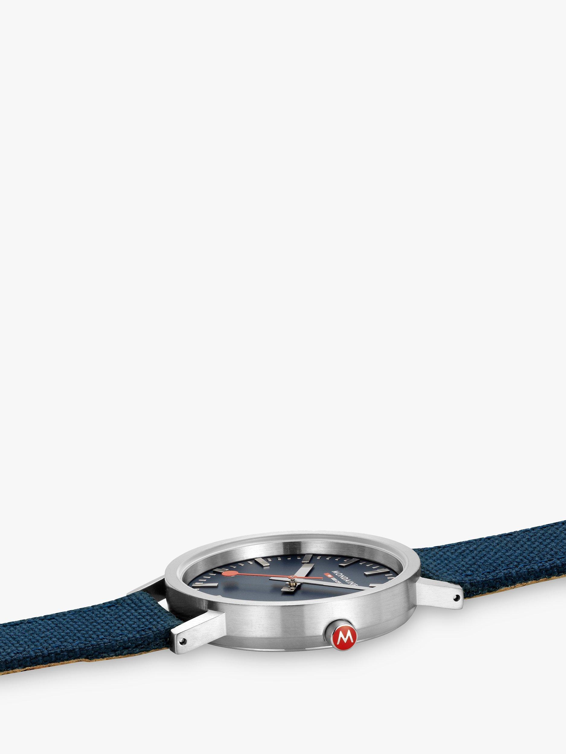 This Classic collection watch showcases a 36mm tone-on-tone stainless steel case, hands and markers with a matte finish to maintain the timeless design and minimalistic look of Mondaine. Featuring a Deep Ocean Blue dial and recycled PET textile strap with comfortable cork lining and stitches, this timepiece pays tribute to the wonders of our seas. The Classic Collection comes with a clever quick-change system, allowing you to easily change your straps.