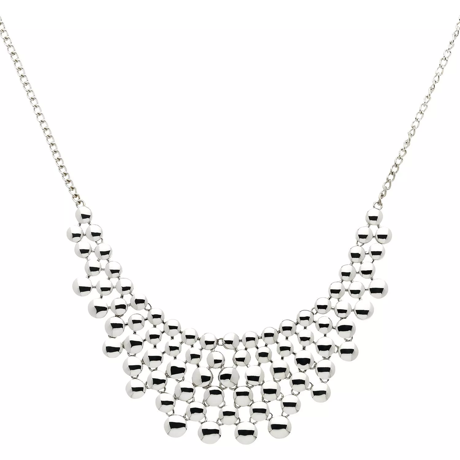 Inspired by the dramatic bib style, this necklace features a silver-toned rhodium-plated chain which suspends multiple strands of shiny coin charms cut in various sizes for a harmonious finish. The necklace is complete with an adjustable extension chain and a lobster clasp.