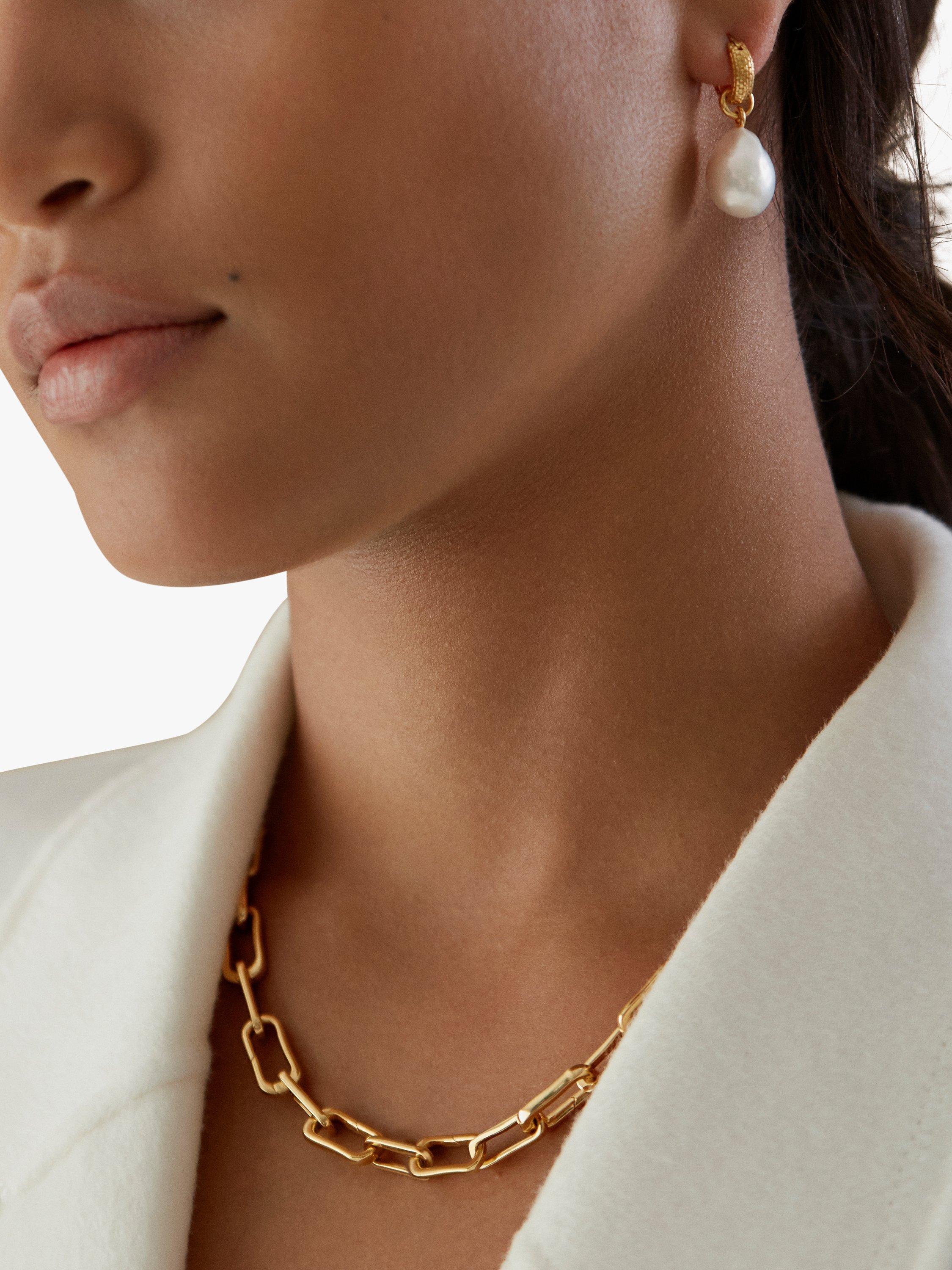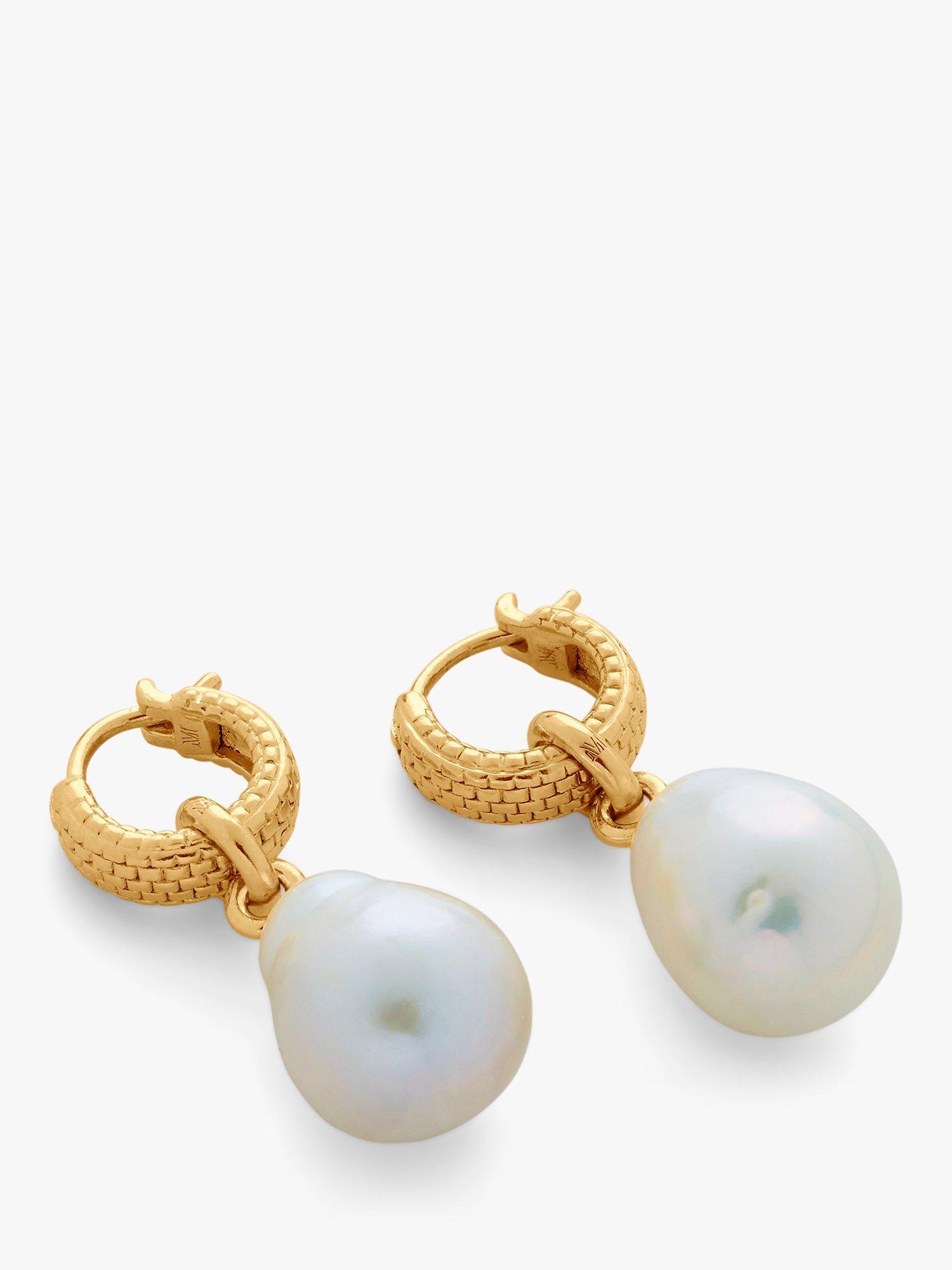 Creating a continuous curve around the earlobe, this pair of textured huggie hoop earrings from Monica Vinader sparkles with iridescence thanks to its baroque pearl stone.