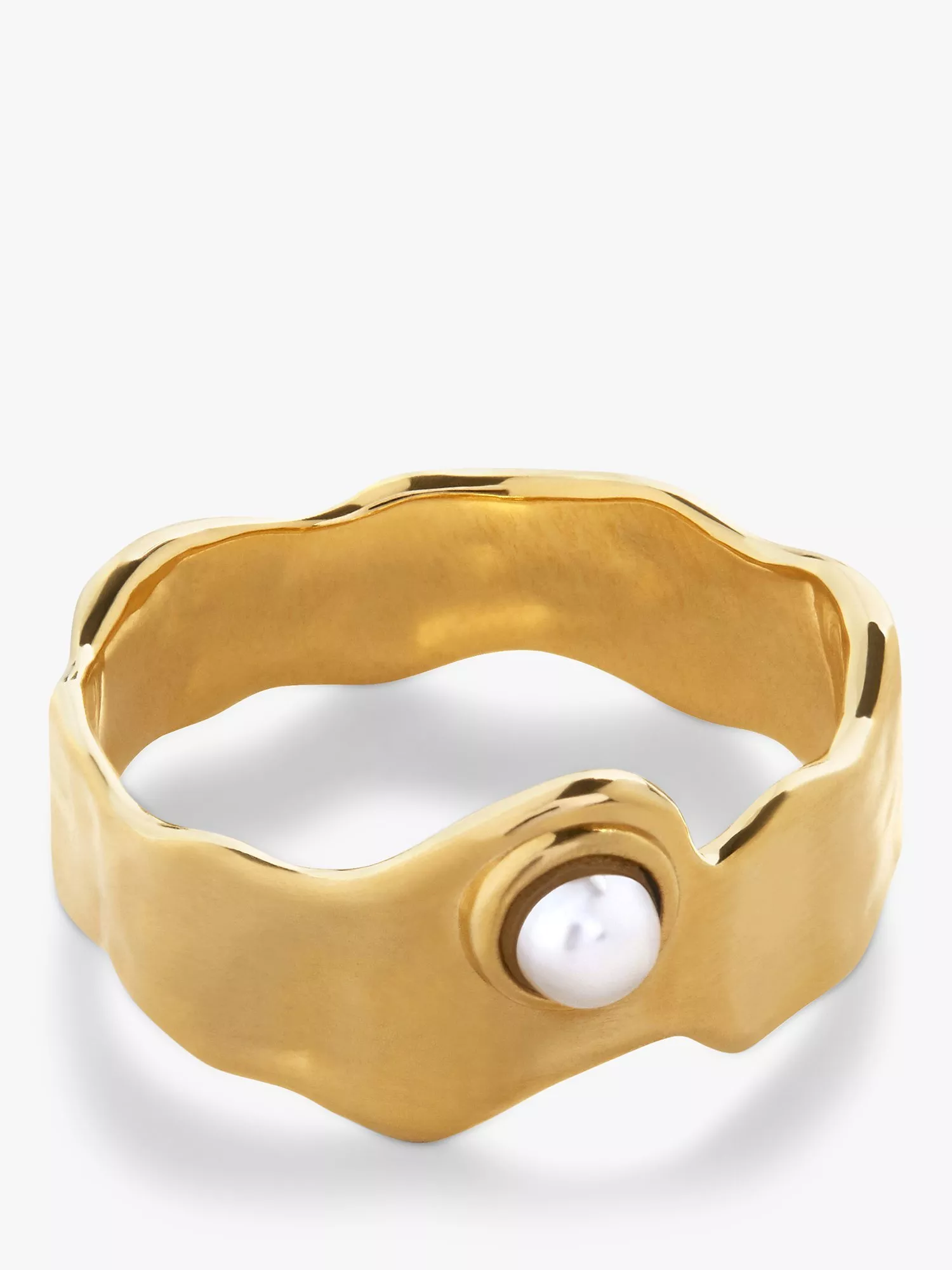 This simple band boasts an organic rugged shape with a lustrous pearl to the centre. It is completed with a sleek polished finish.