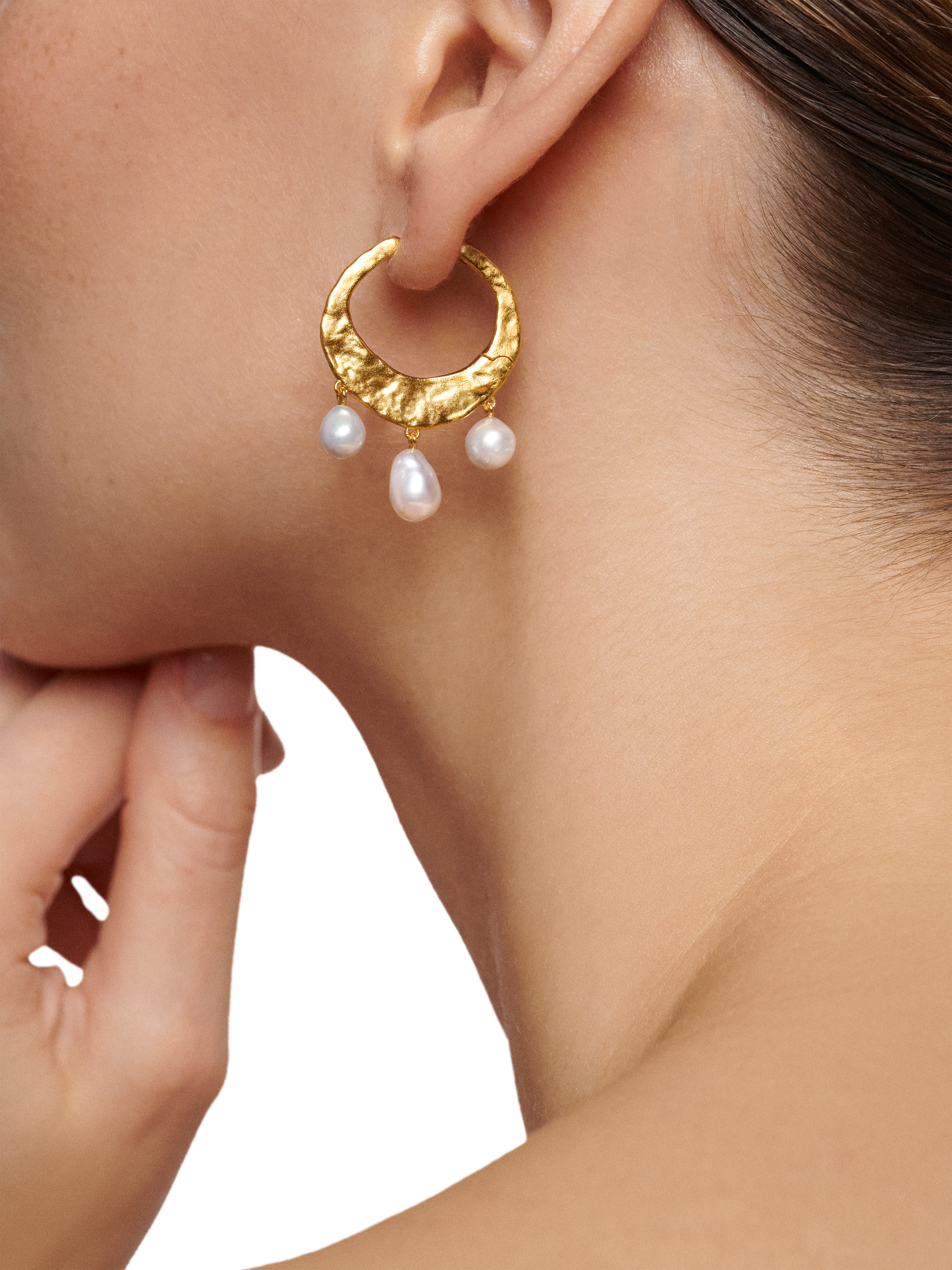 Textured Capri earrings made of 18-carat gold vermeil on sterling silver with three pearls on each medium-sized hoop earring.